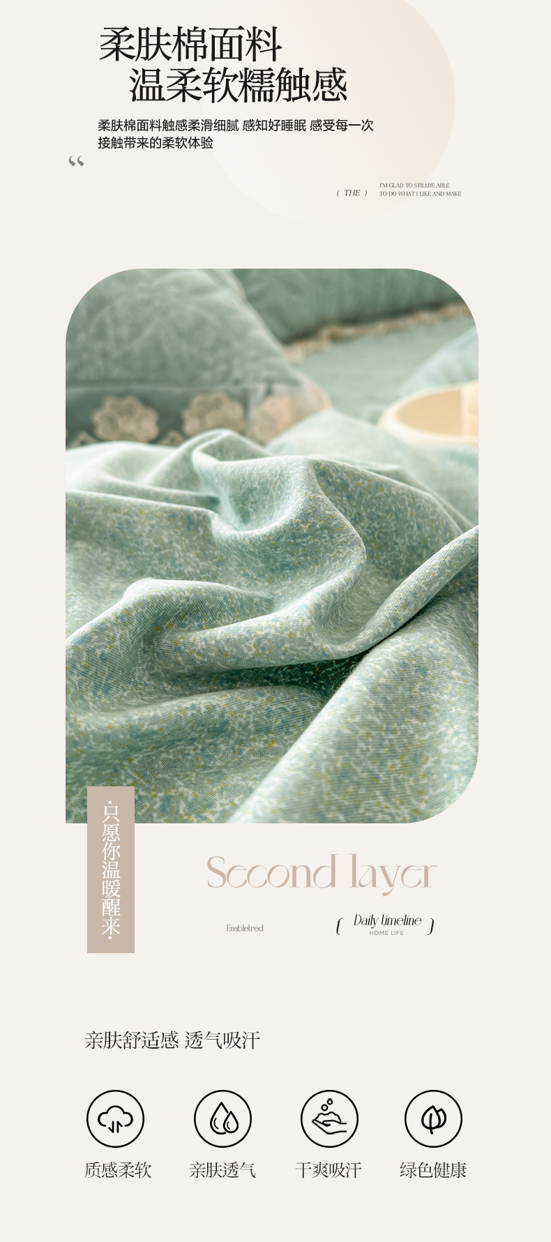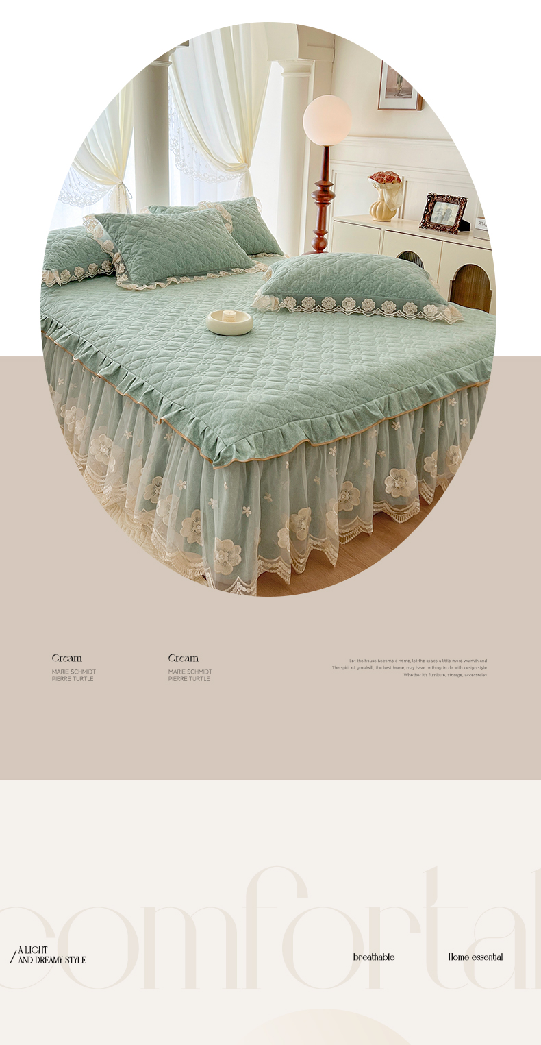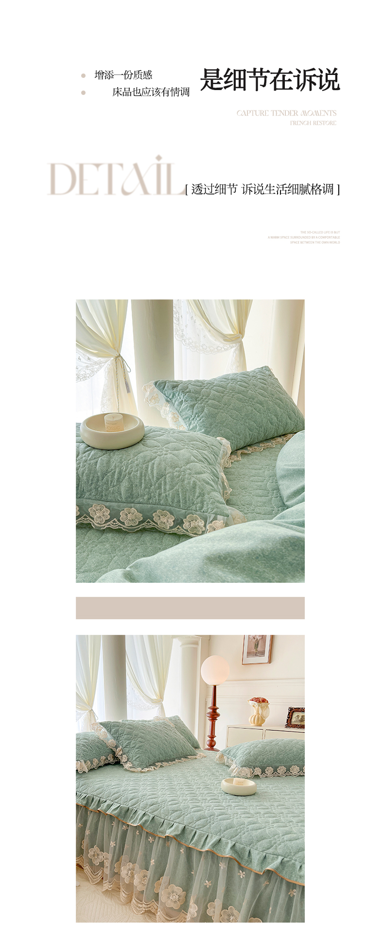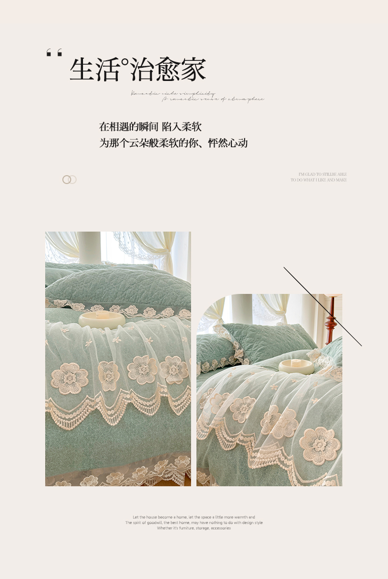 当前位置: 91家纺网 > 商品网购 > 床品套件 > 四件套 > 化纤普通四件套 > 网红馆 2025新款柔肤棉四件套床裙花边款艾丽莎系列 松石绿