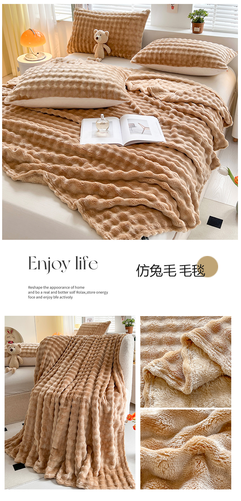 商品名称:芸锦豪 2024新款仿兔毛泡泡绒毛毯-卷边款毛毯 咖色-卷边