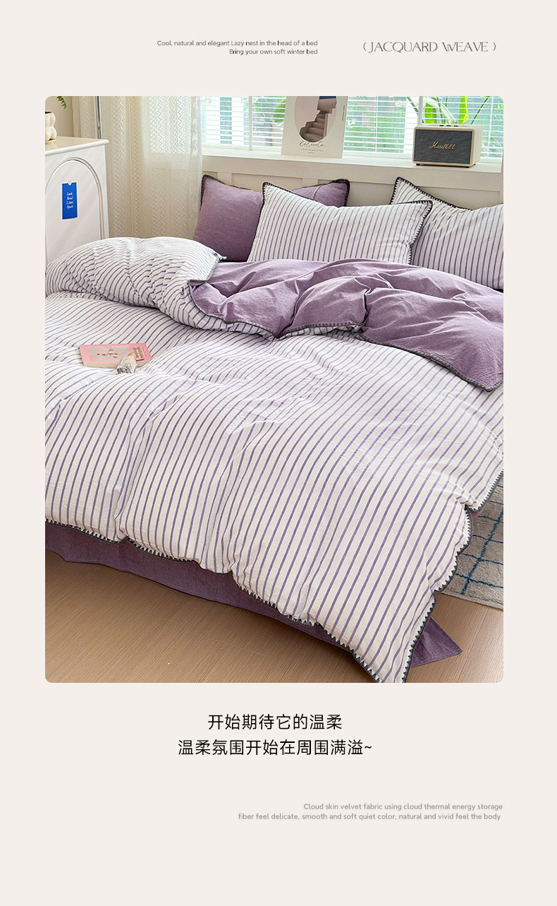 当前位置: 91家纺网 > 商品网购 > 床品套件 > 四件套 > 全棉普通四件套 > 宜家坊 2024新款A类全棉色织水洗棉贝壳边绣三角针工艺四件套可定制 诺言-紫