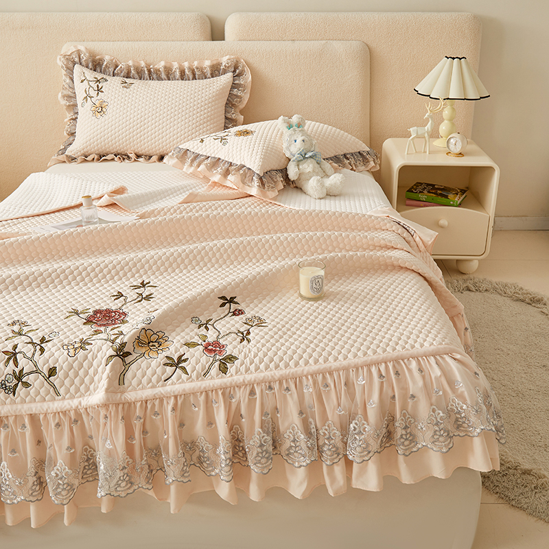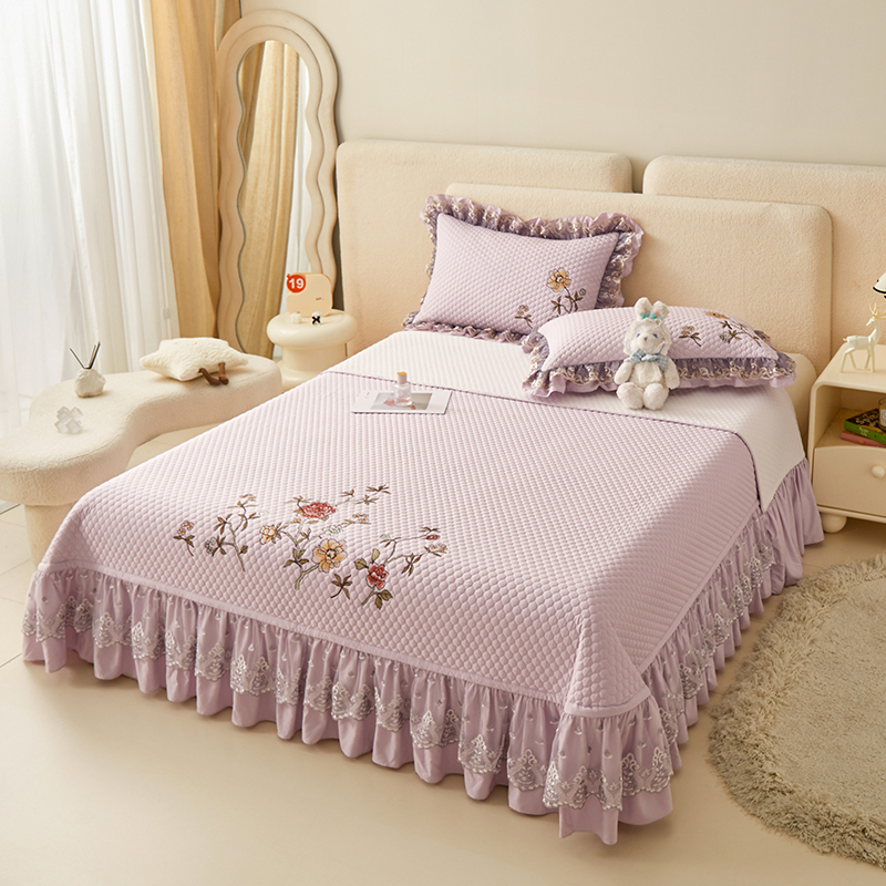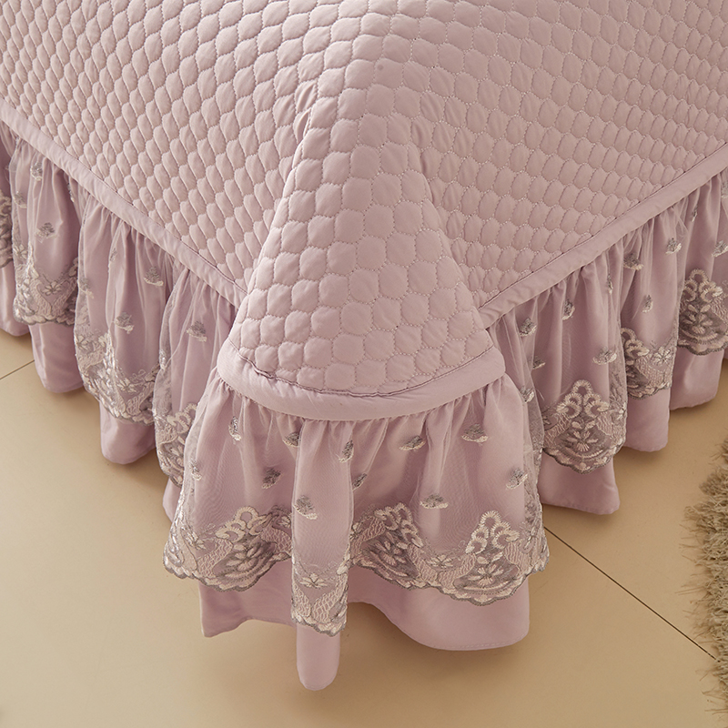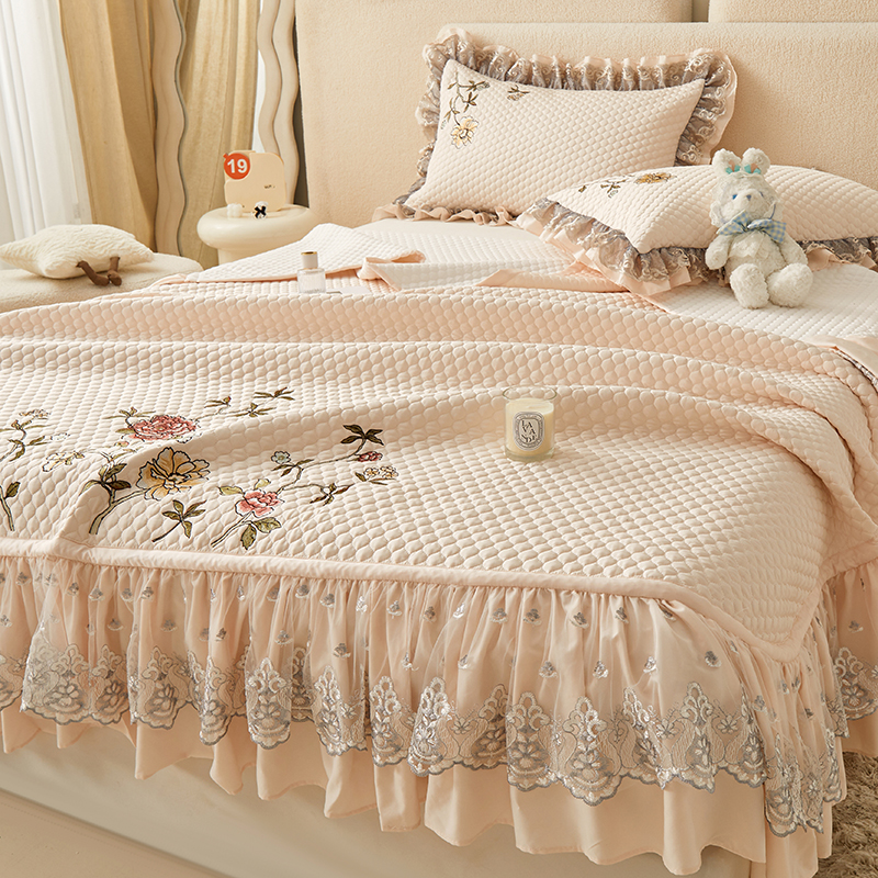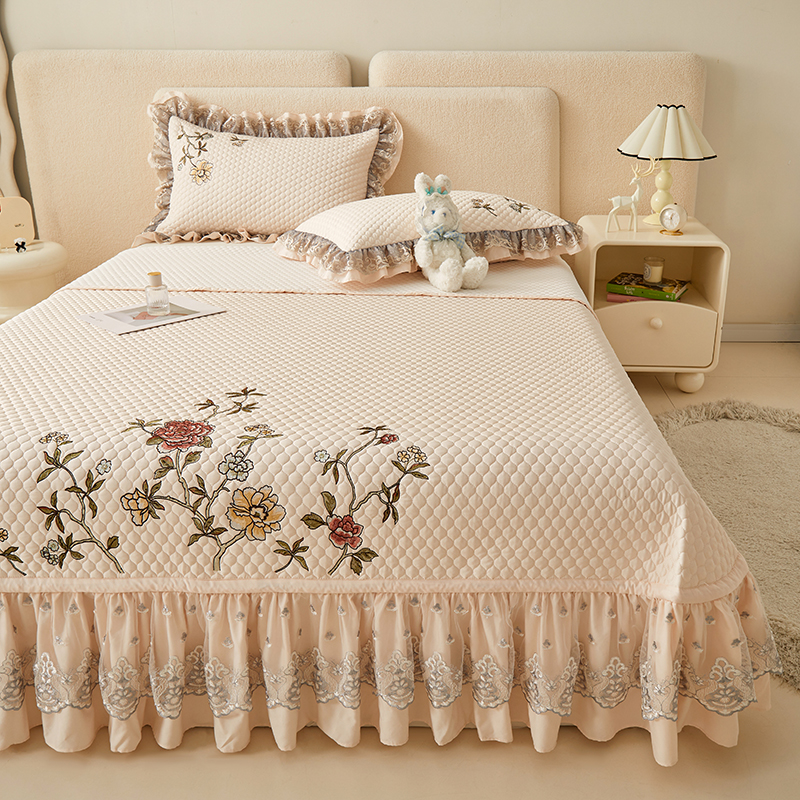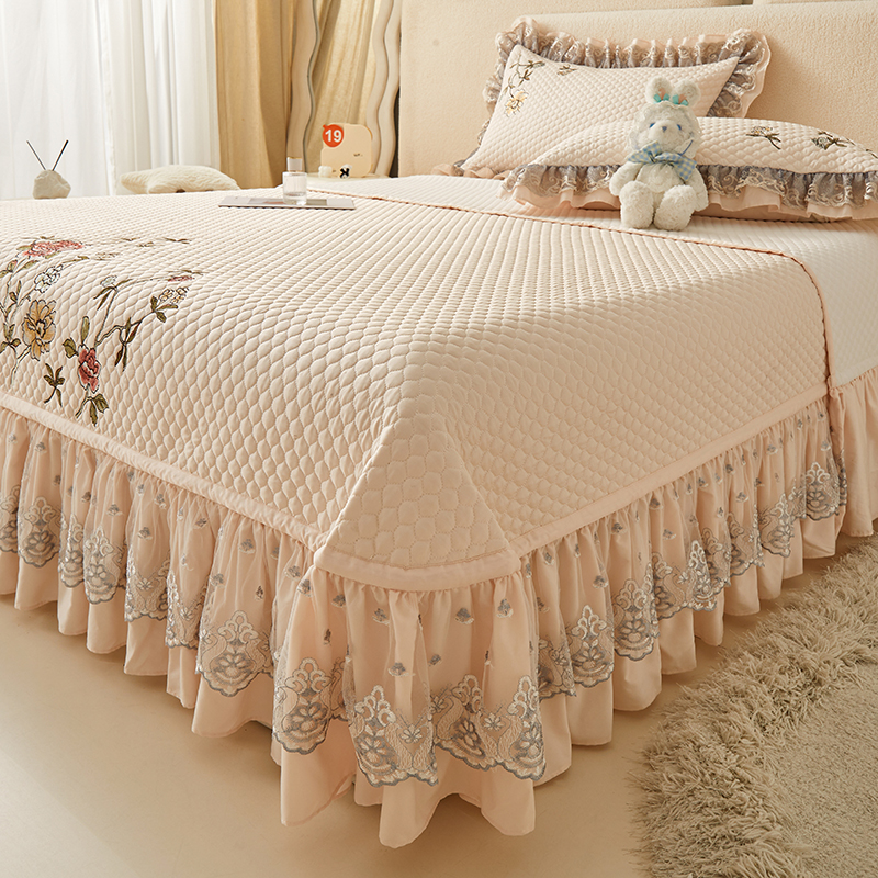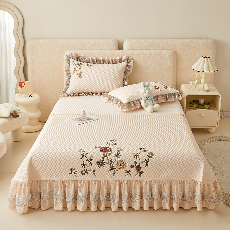 紫碧螺家纺 2024新款刺绣花边床裙式床盖(仿天丝) 玉色
