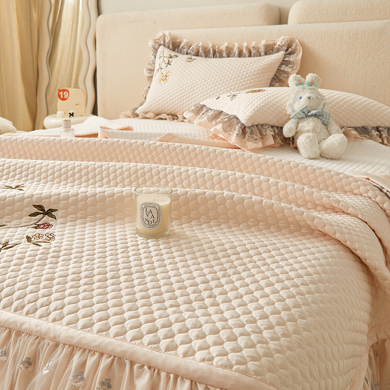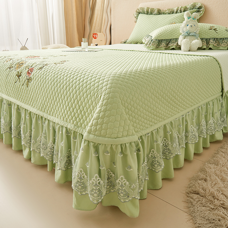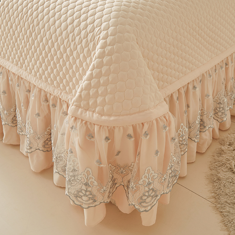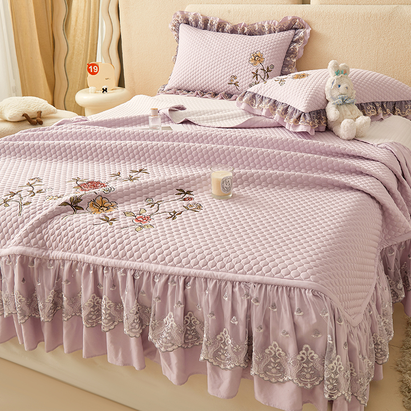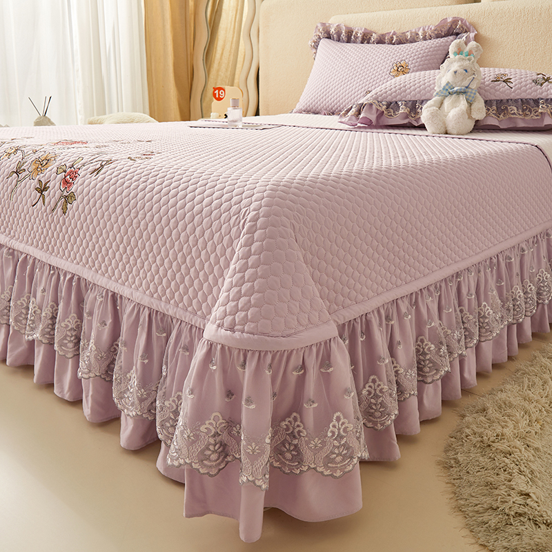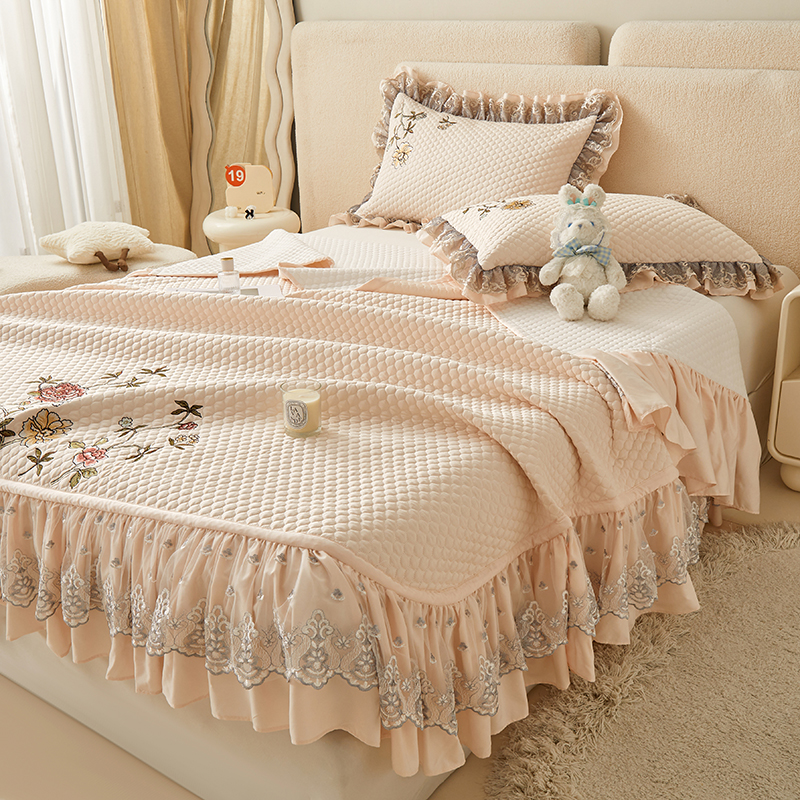 紫碧螺家纺 2024新款刺绣花边床裙式床盖(仿天丝) 玉色