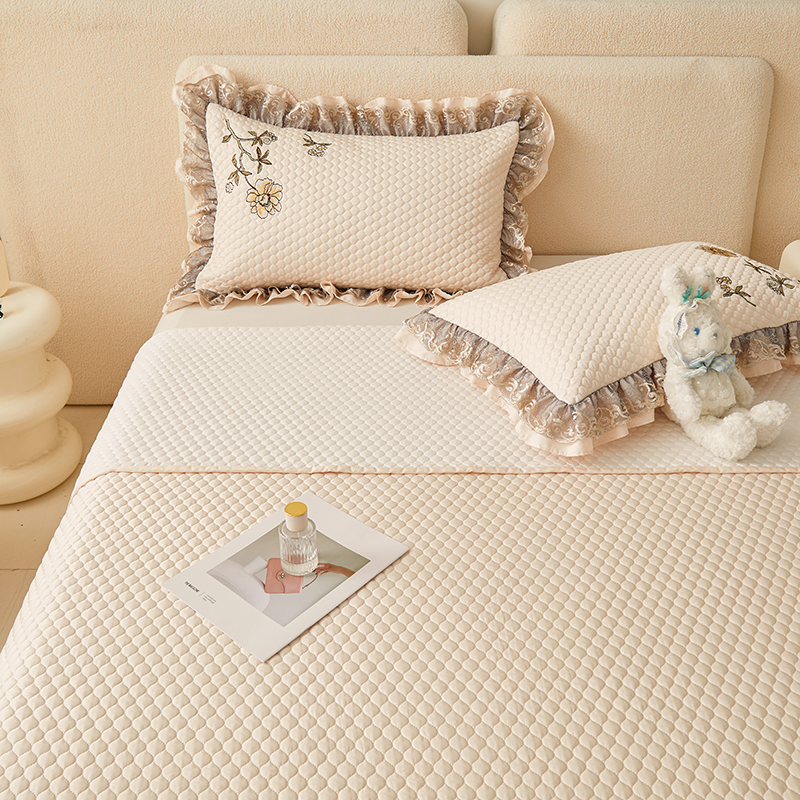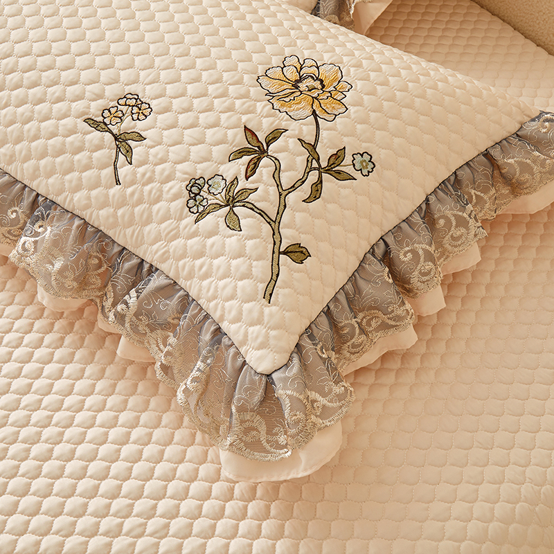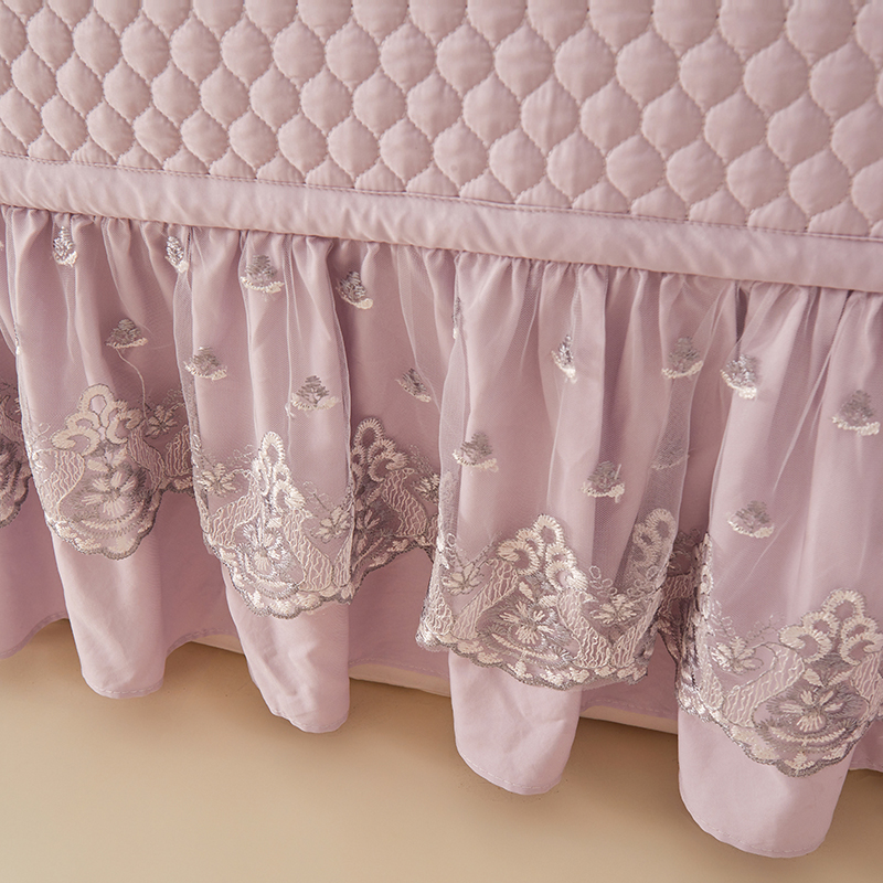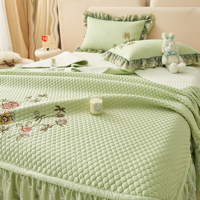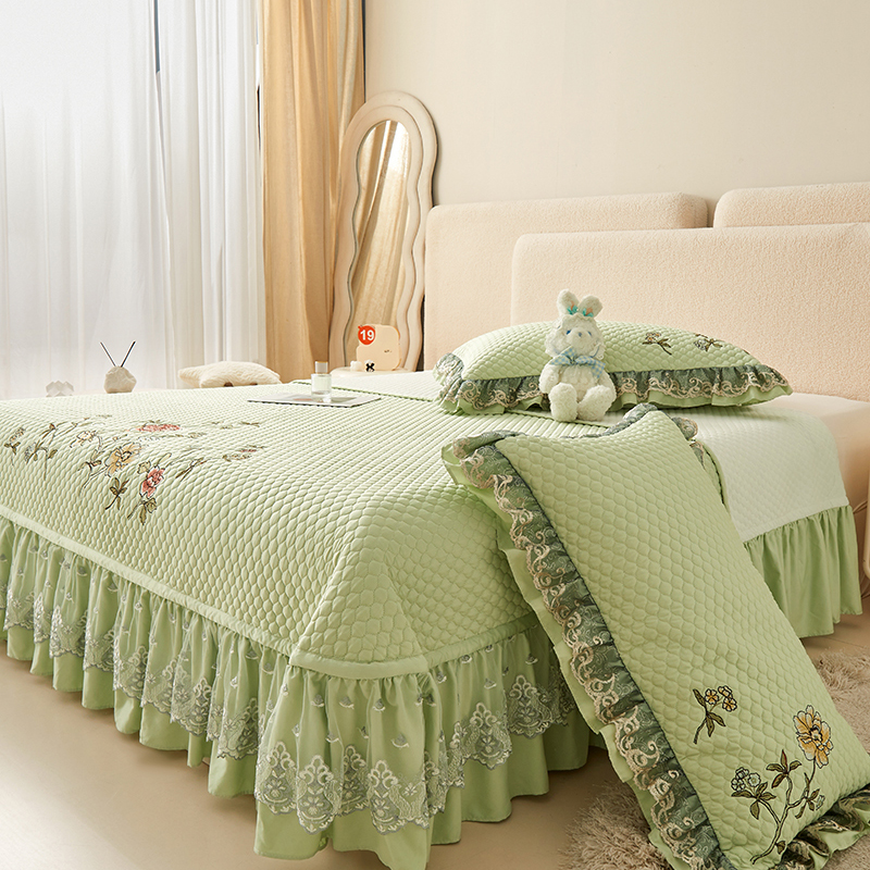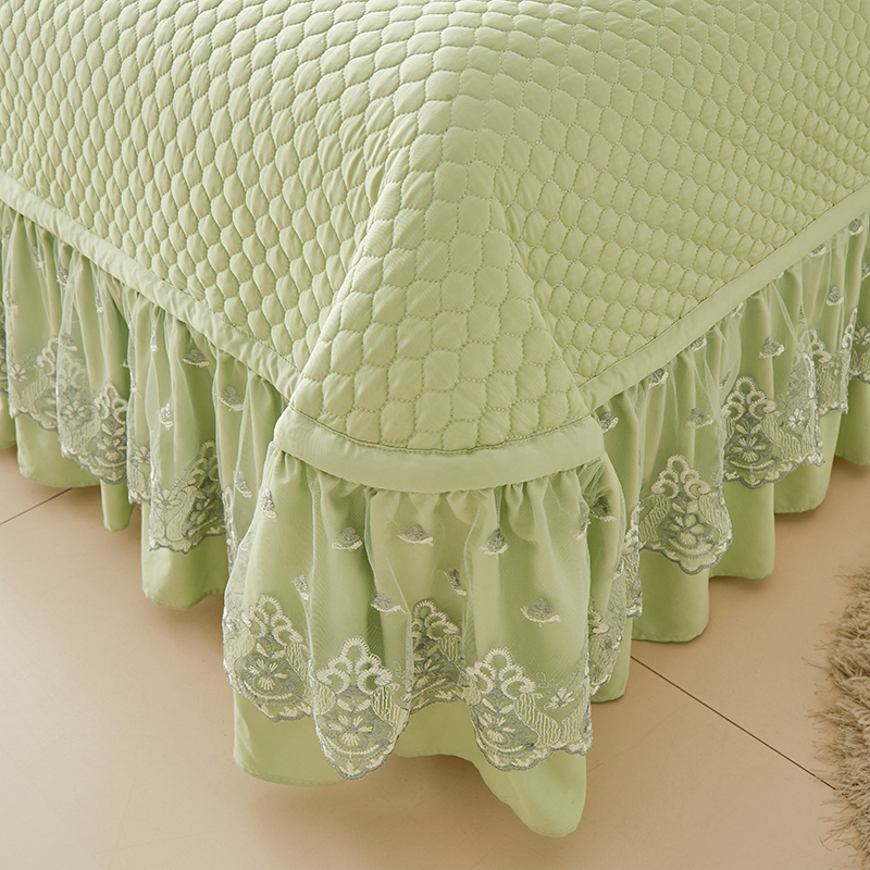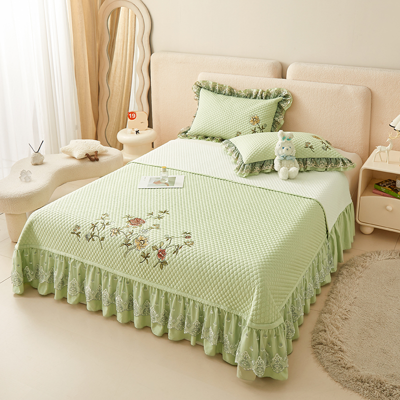 紫碧螺家纺 2024新款刺绣花边床裙式床盖(仿天丝) 玉色