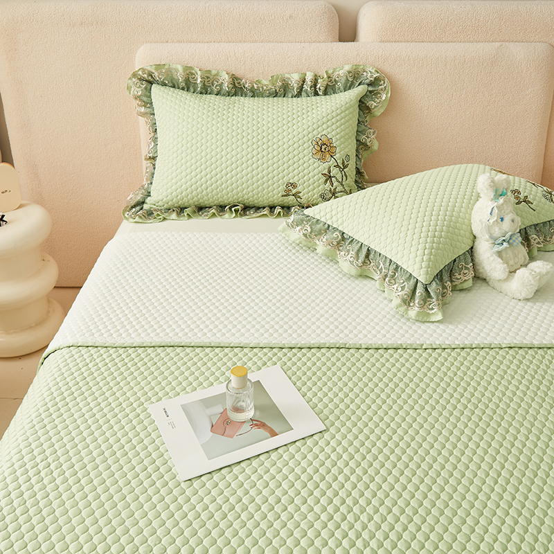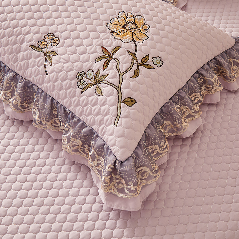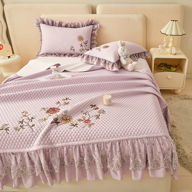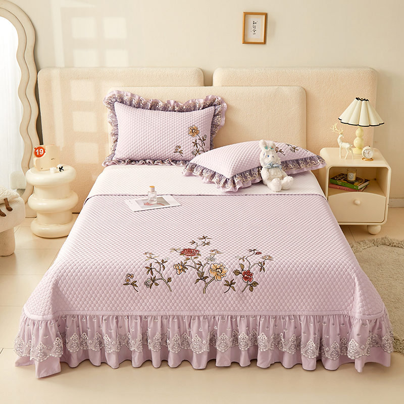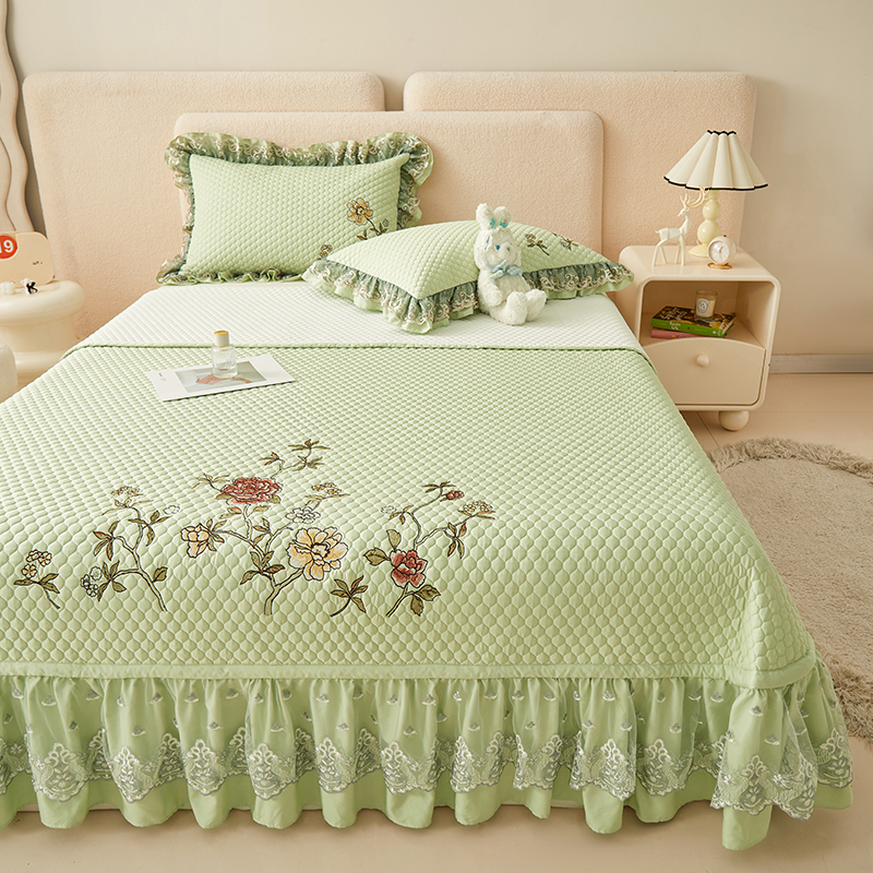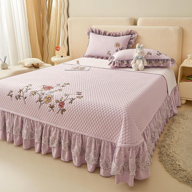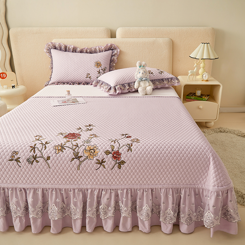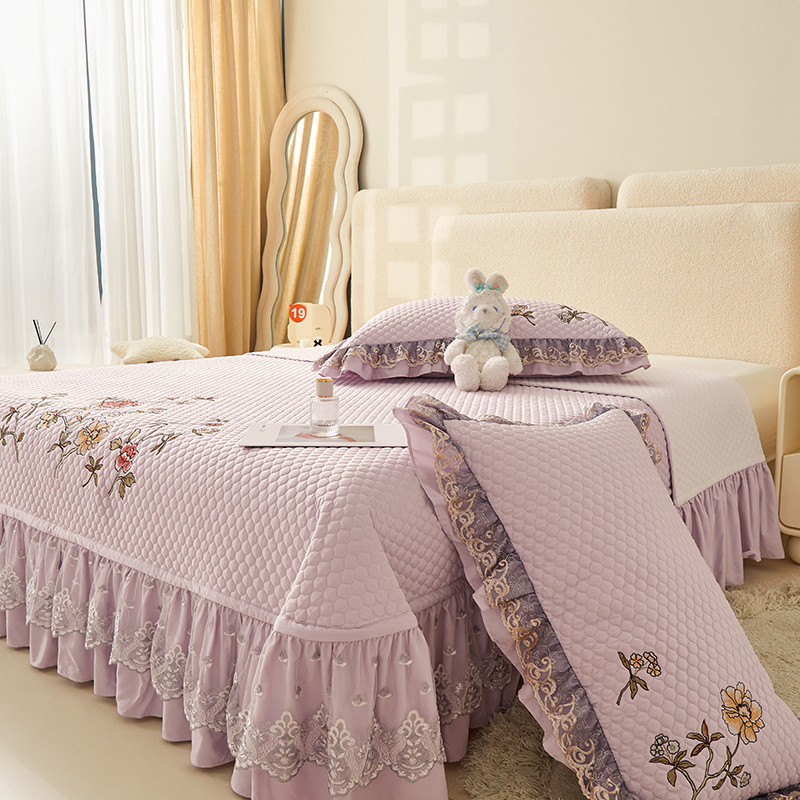 (总)紫碧螺家纺 2025新款牛奶绒绗绣裙式床盖三件套,暖黄,银灰,绿色,粉色,奶白,浅紫