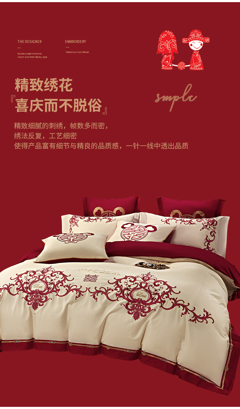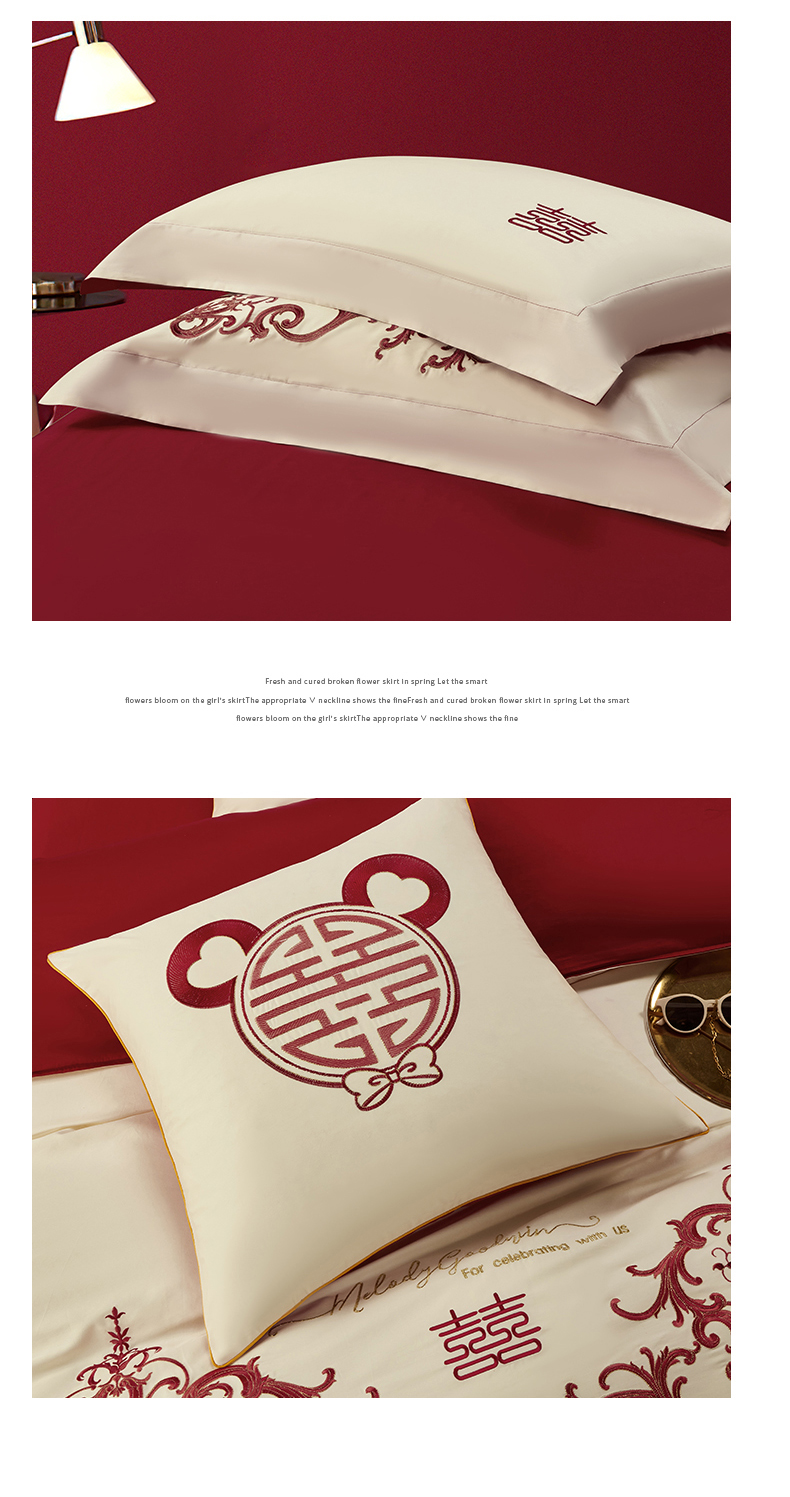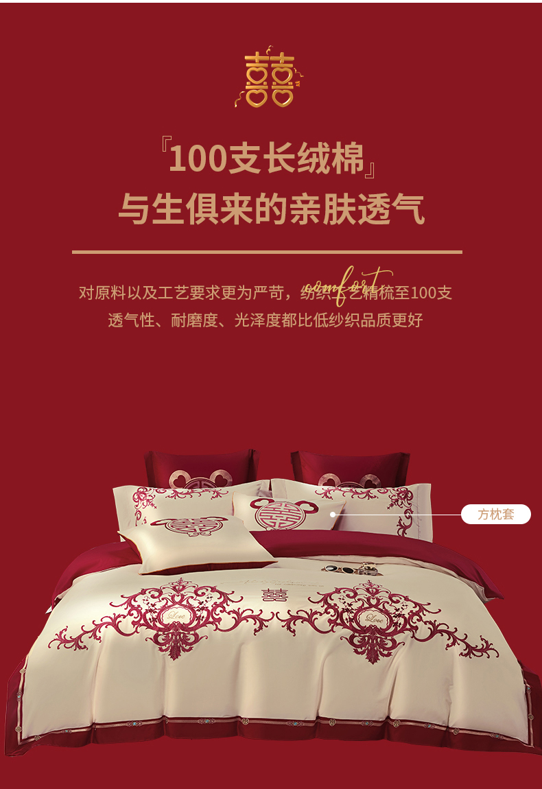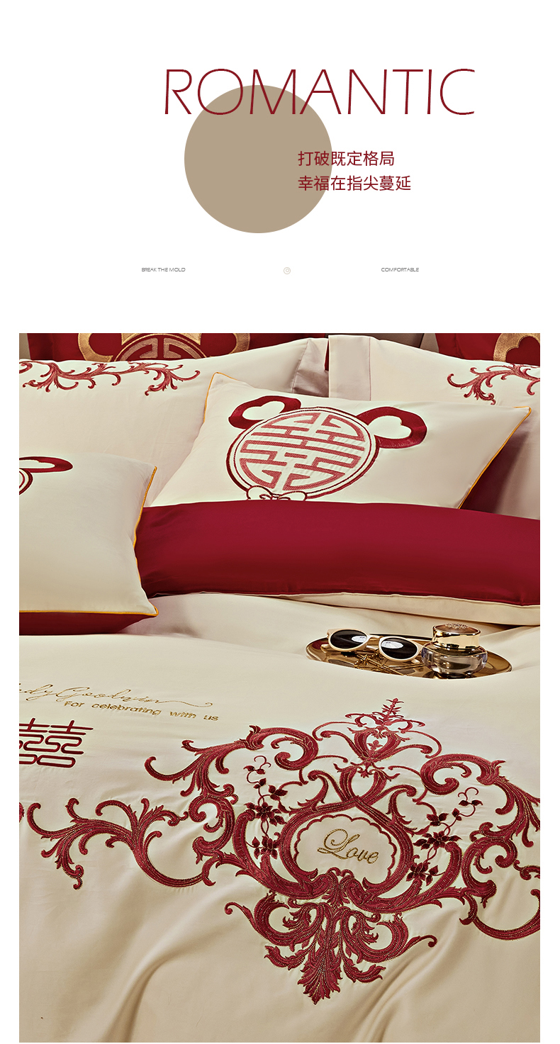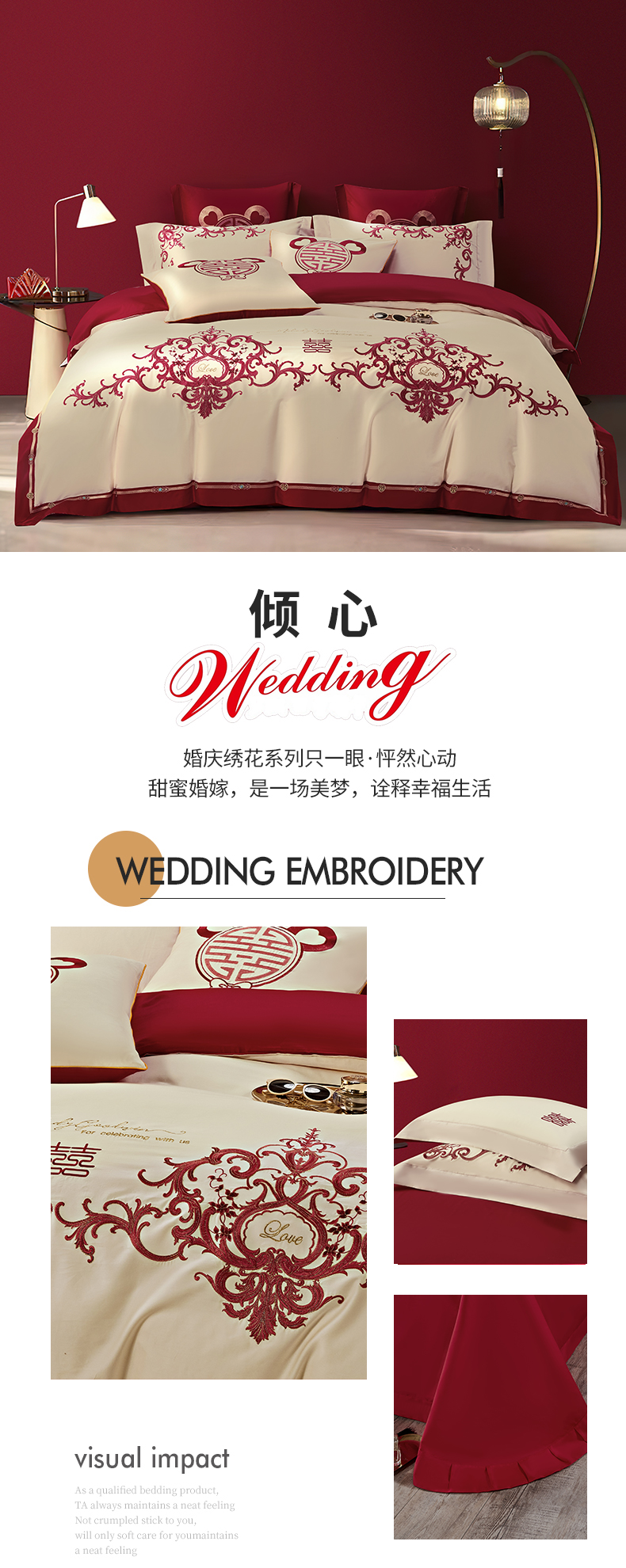 当前位置: 91家纺网 > 商品网购 > 床品套件 > 四件套 > 婚庆四件套 > 玉雅家纺 2025新款100支长绒棉高档提花刺绣婚庆四件套 倾心