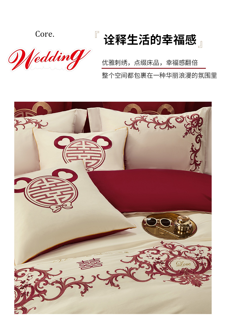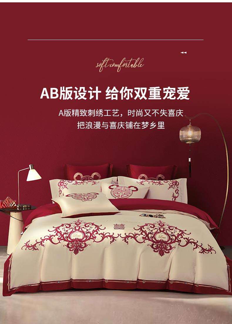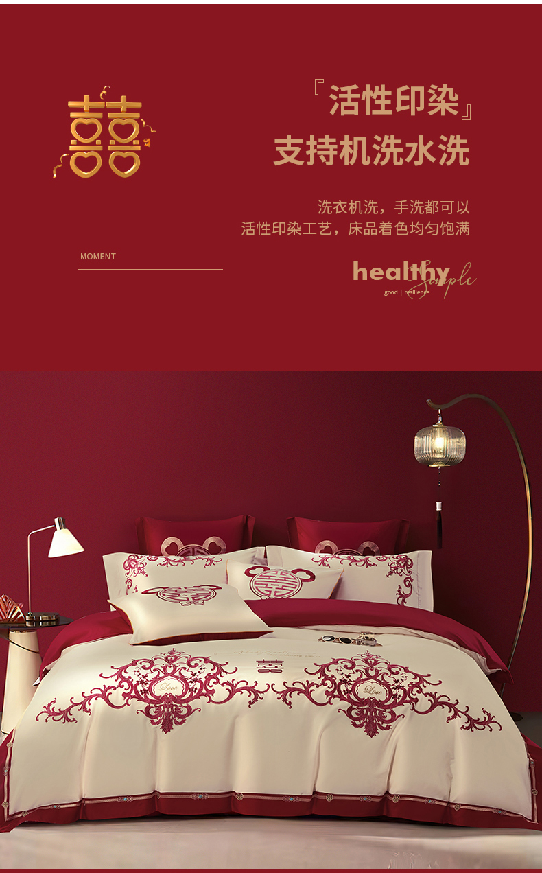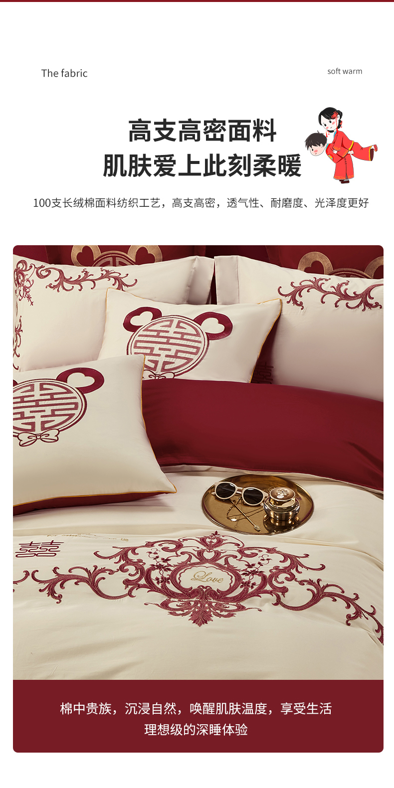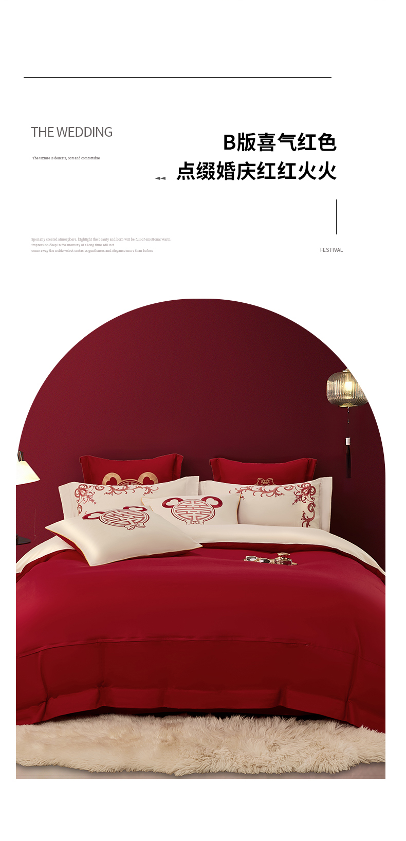 当前位置: 91家纺网 > 商品网购 > 床品套件 > 四件套 > 婚庆四件套 > 玉雅家纺 2025新款100支长绒棉高档提花刺绣婚庆四件套 倾心