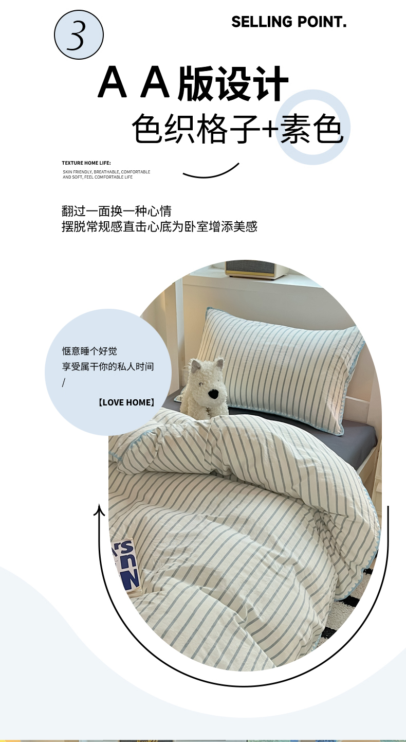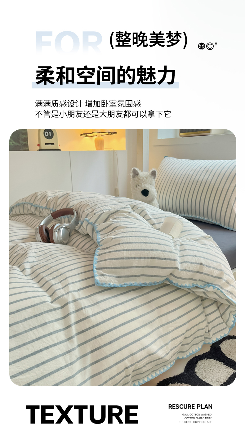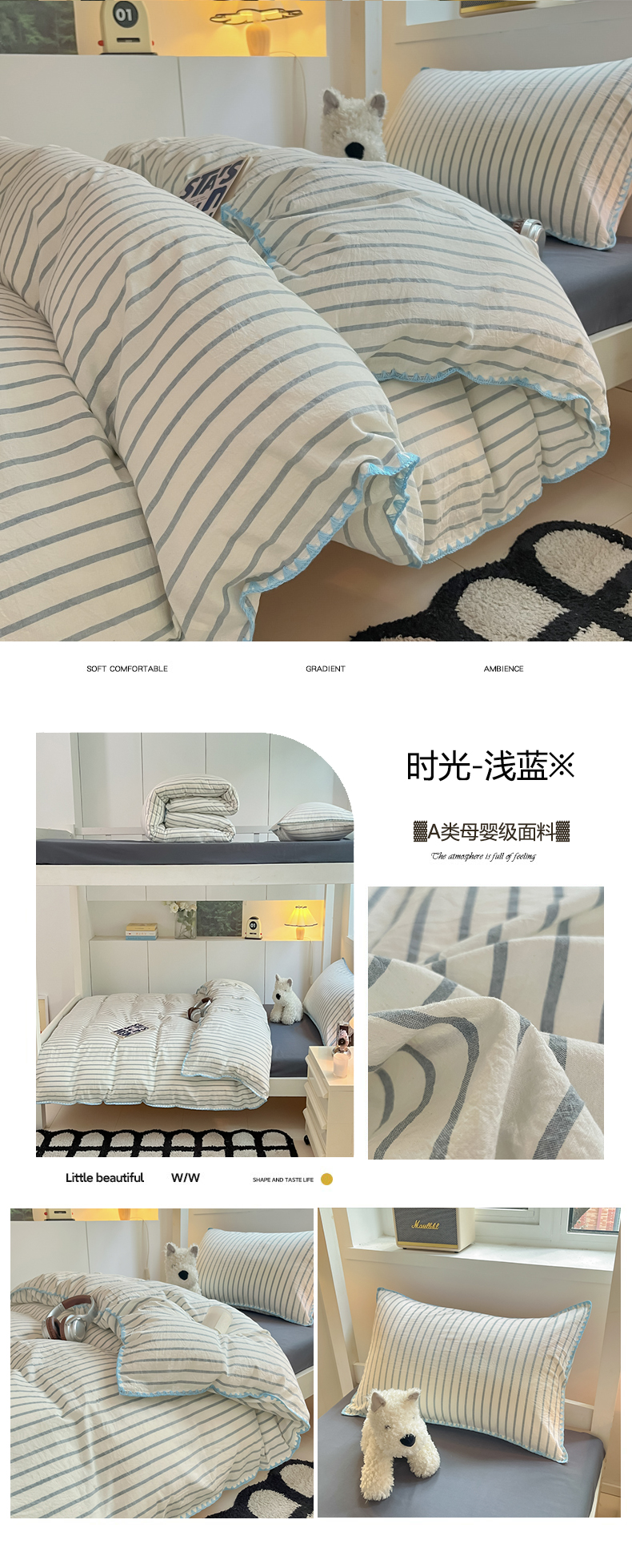 吉象家纺 2025新款全棉水洗棉三角针学生三件套四件套 时光-浅蓝