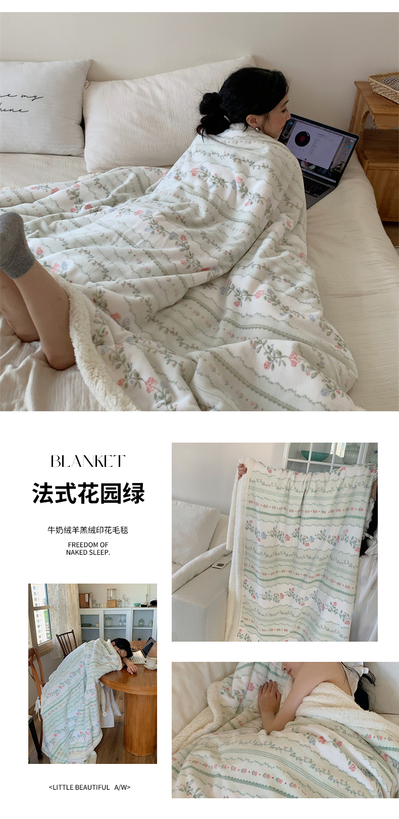 商品名称:桃喜 2024新款亲肤舒适牛奶绒羊羔绒毛毯 法式花园绿