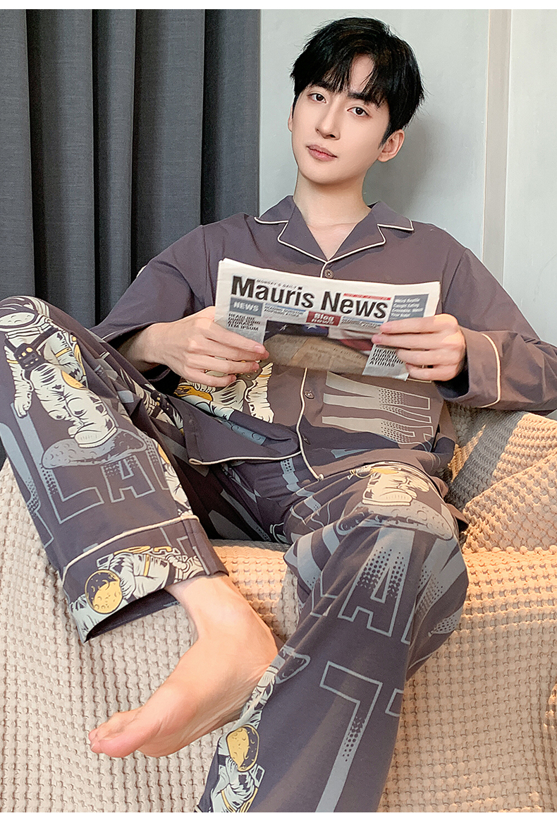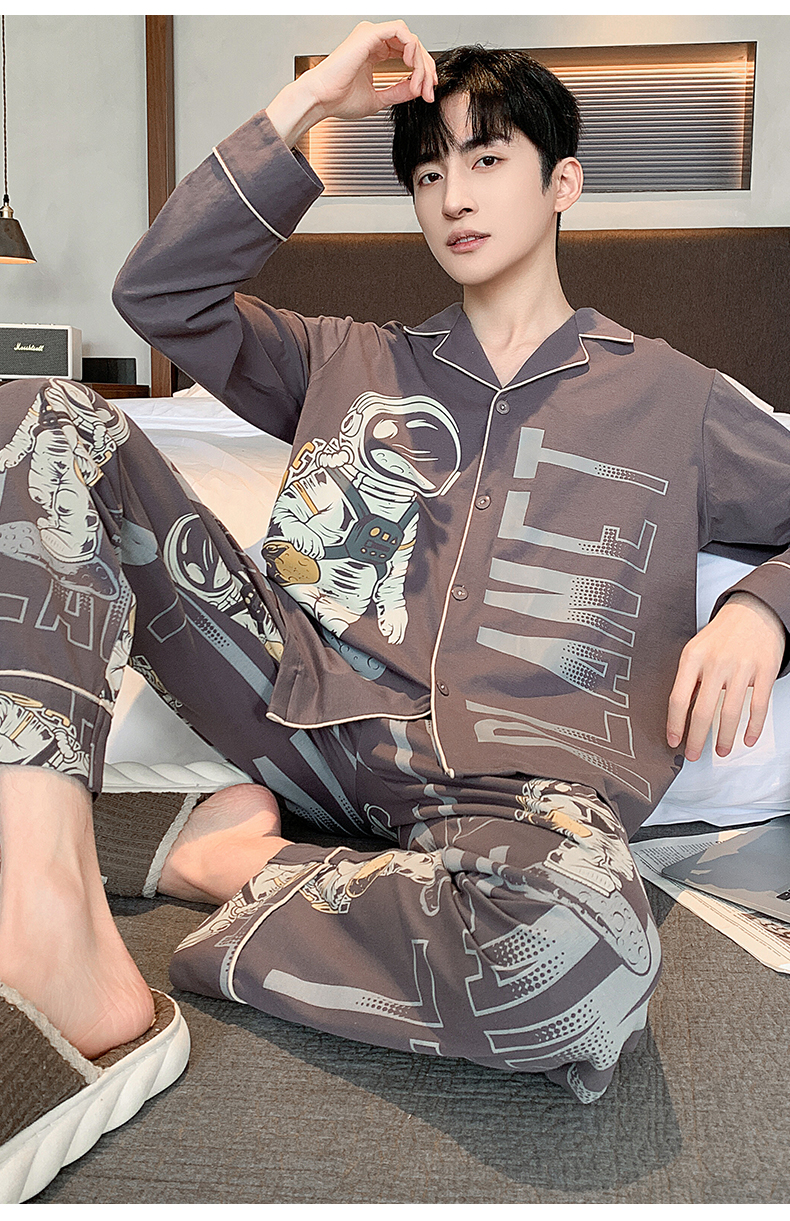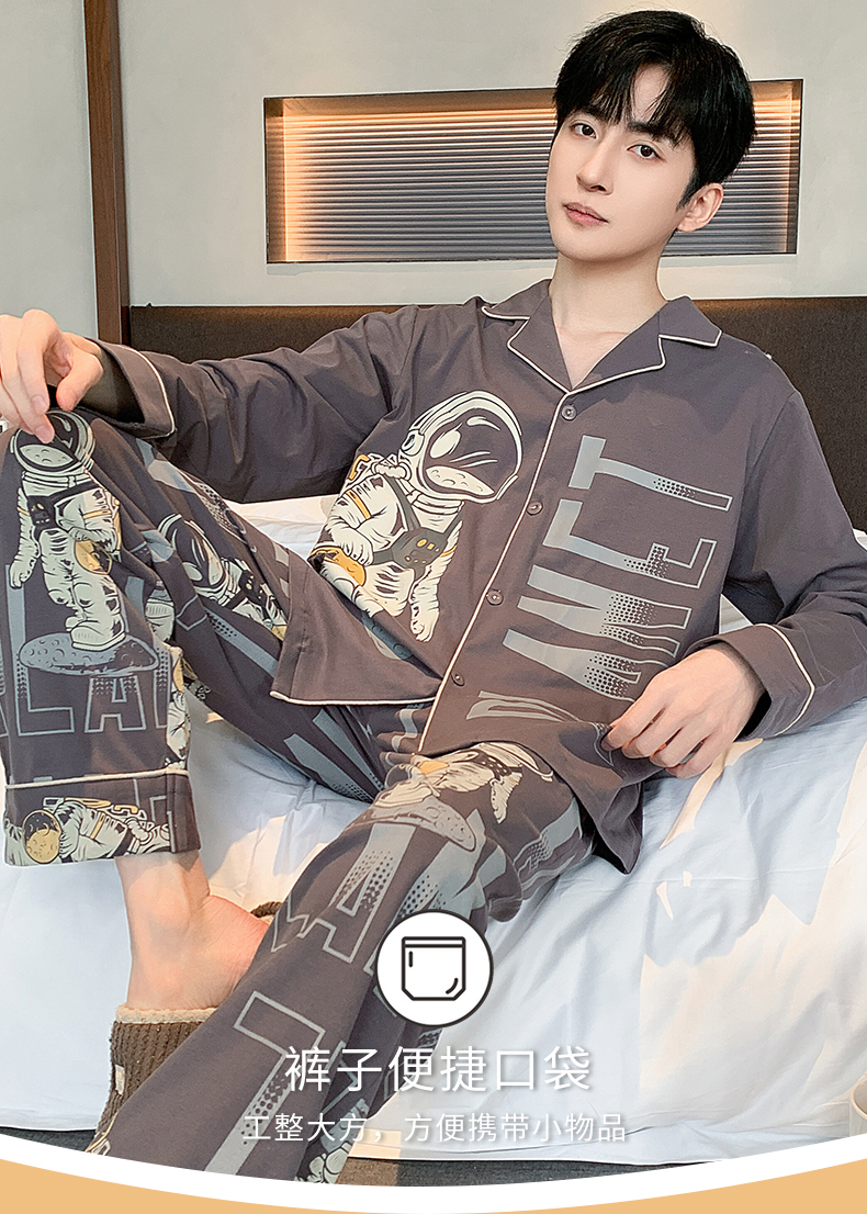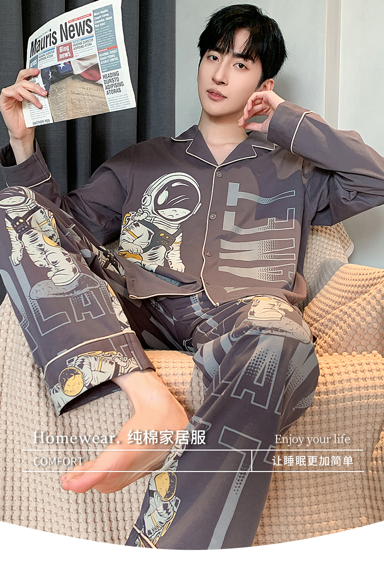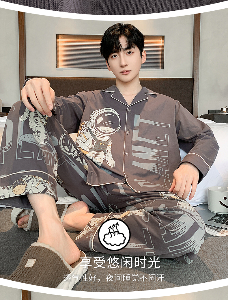 春秋季新款纯棉休闲简约睡衣高级质量家居服夏季男士宽松舒适睡衣翻领 89318