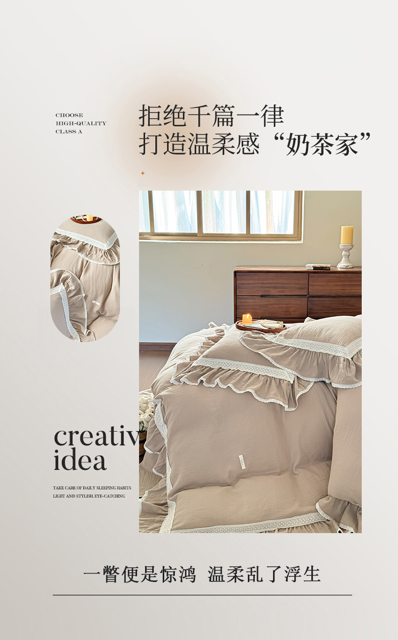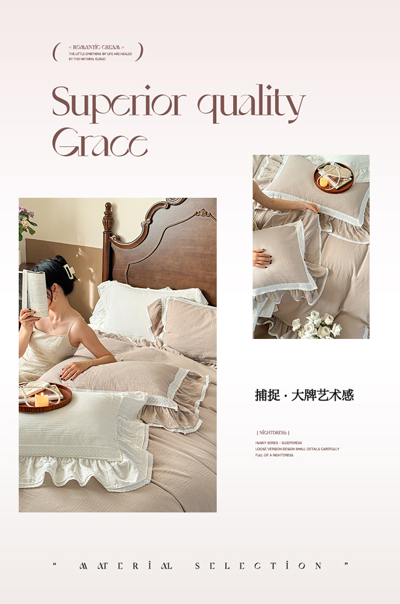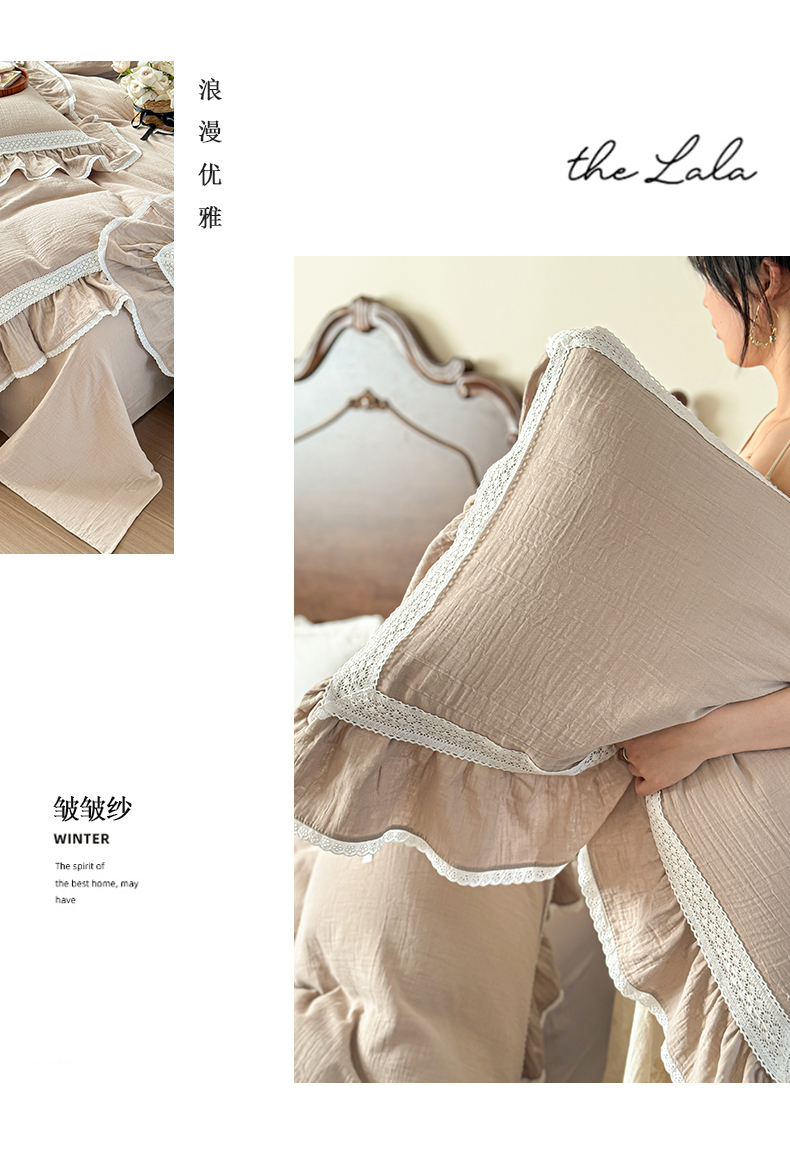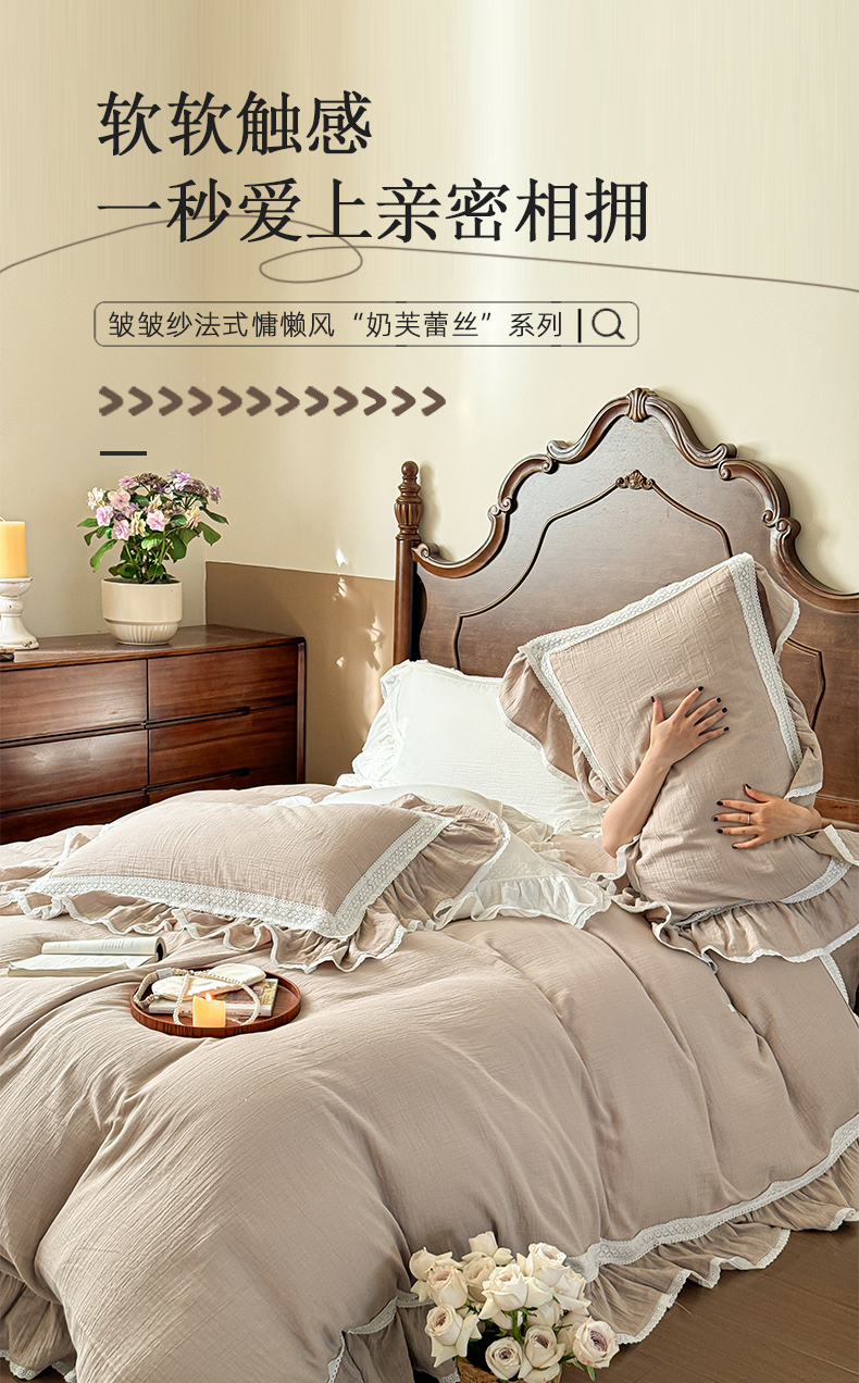 商品名称:玛奇朵 2024新款皱皱纱法式慵懒风奶芙蕾丝系列四件套 奶芙蕾丝-奶灰