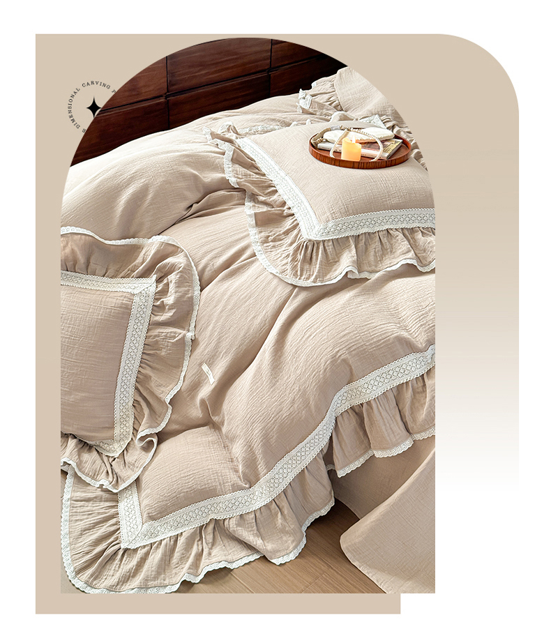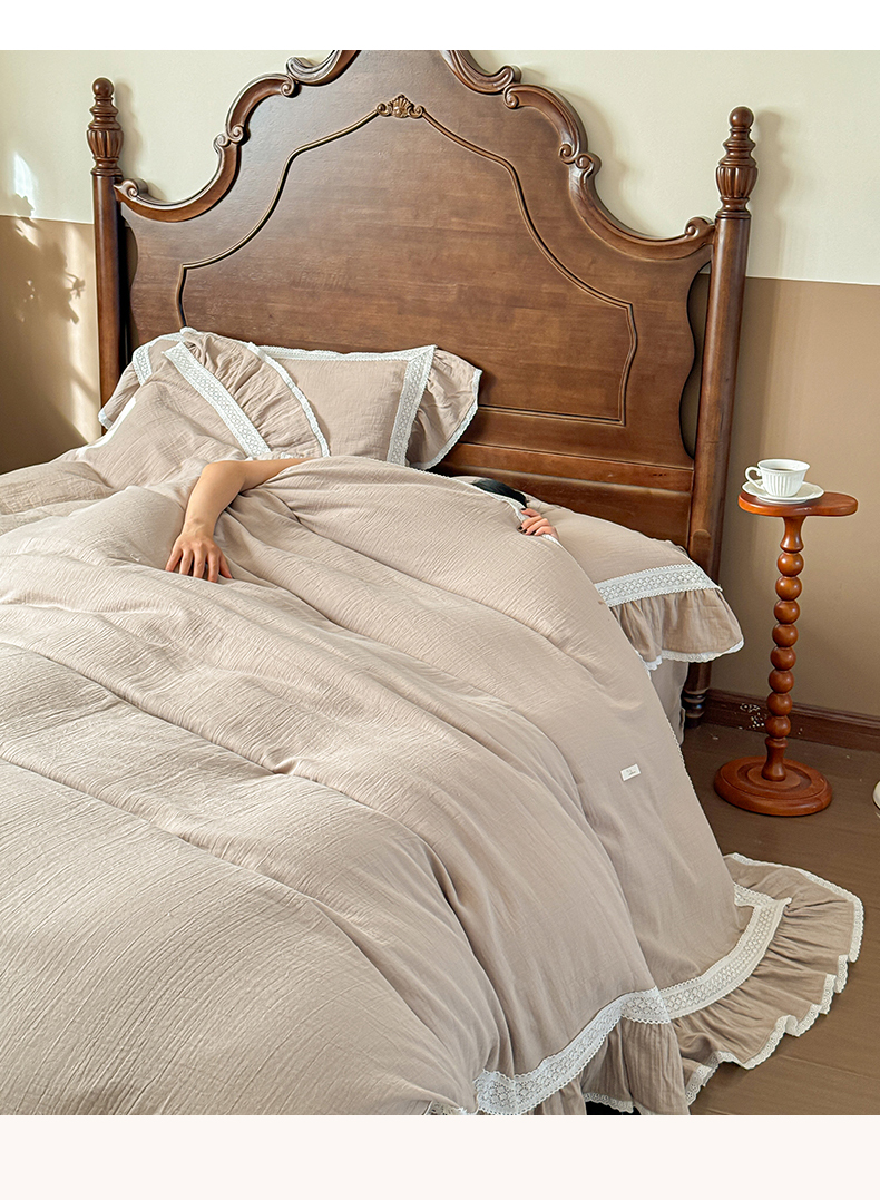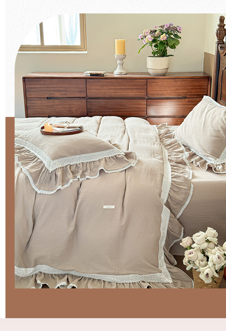 玛奇朵 2024新款皱皱纱法式慵懒风奶芙蕾丝系列四件套 奶芙蕾丝-奶灰