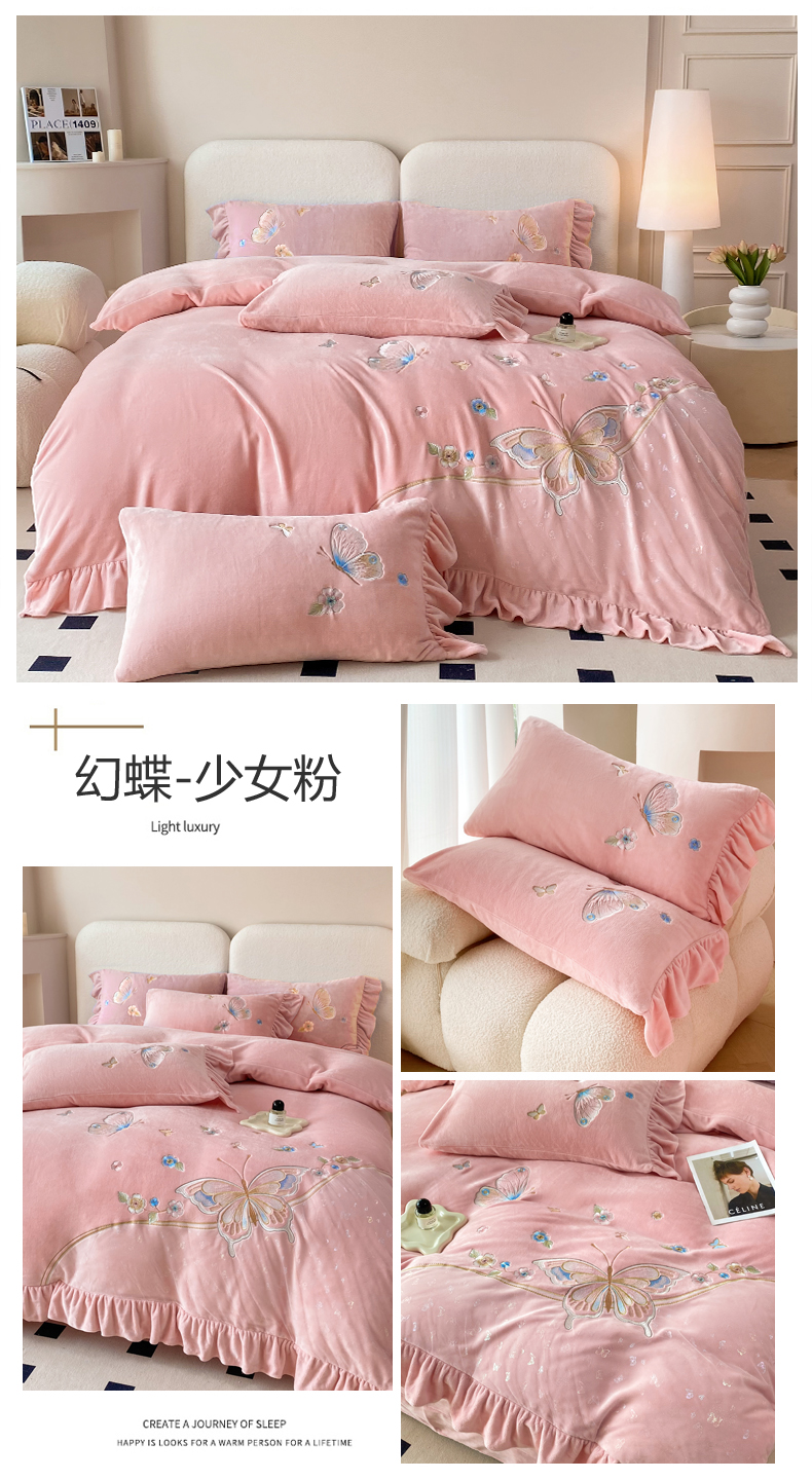 航途席业 2025新款高克重牛奶绒刺绣四件套-梦幻蝶舞 梦幻蝶舞-淡粉