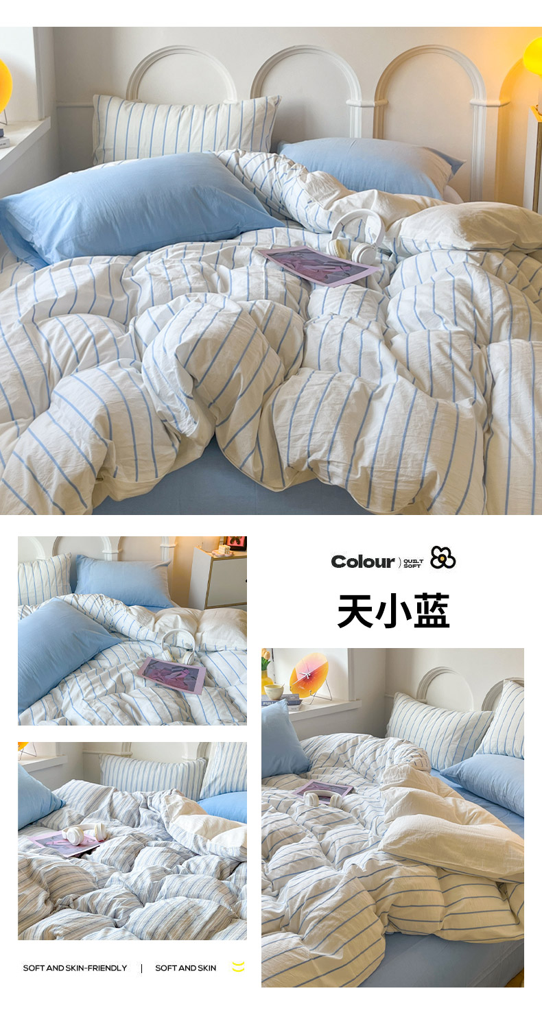 商品名称:千朵 2024新款撞色条纹色织提花水洗棉被套四件套 天小蓝