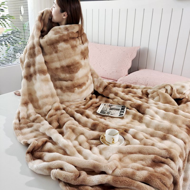 千荨 2024新款跨境印花扎染泡泡绒毛盖毯 浅咖