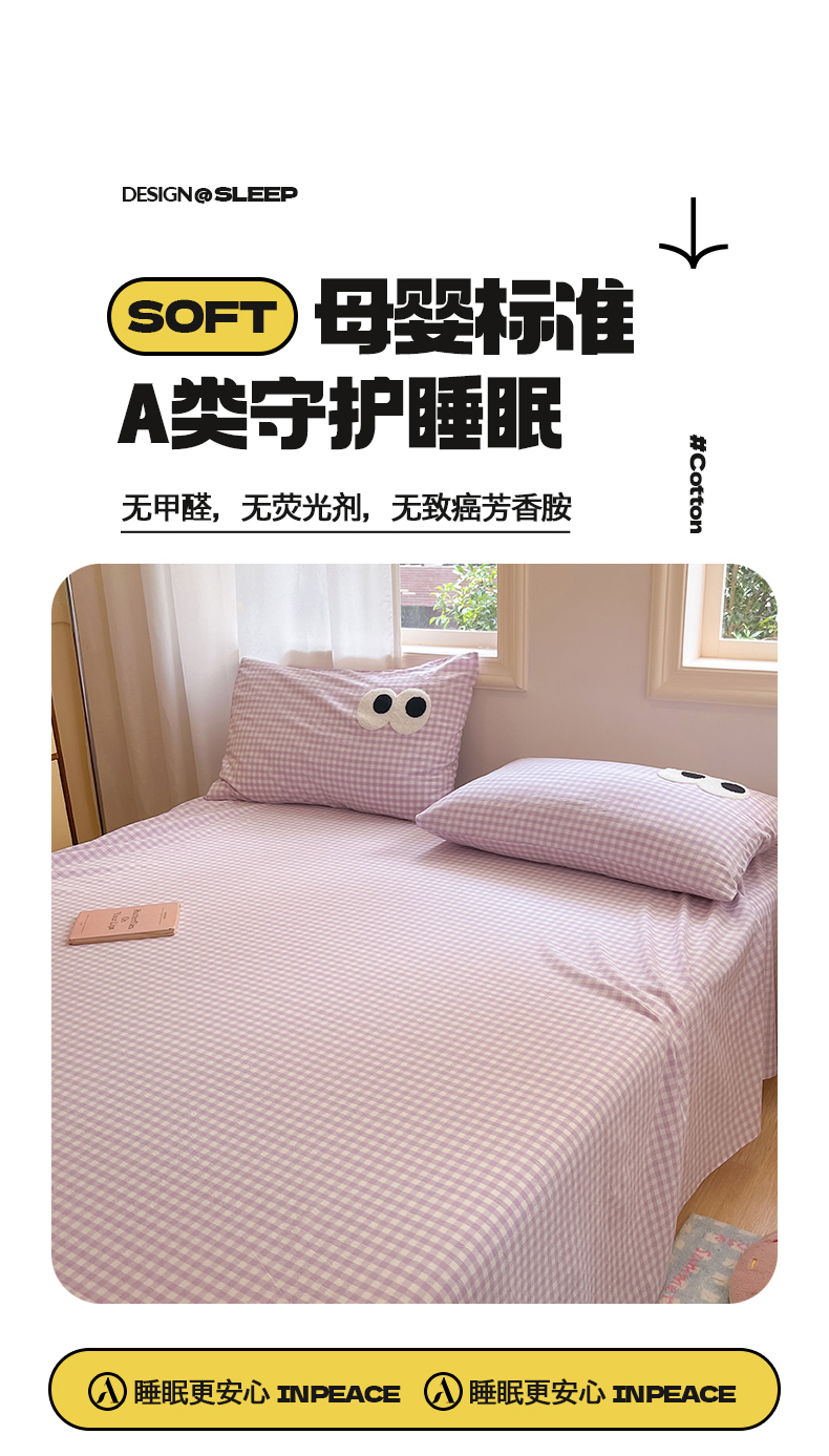 • 91家纺网 家纺一手货源 找家纺 桃子 2024新款ins纯棉色织水洗毛巾绣大眼仔单床单 色织水洗棉-大眼仔紫格