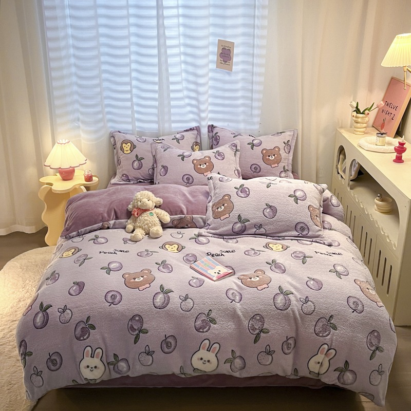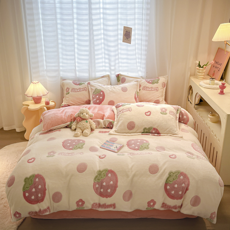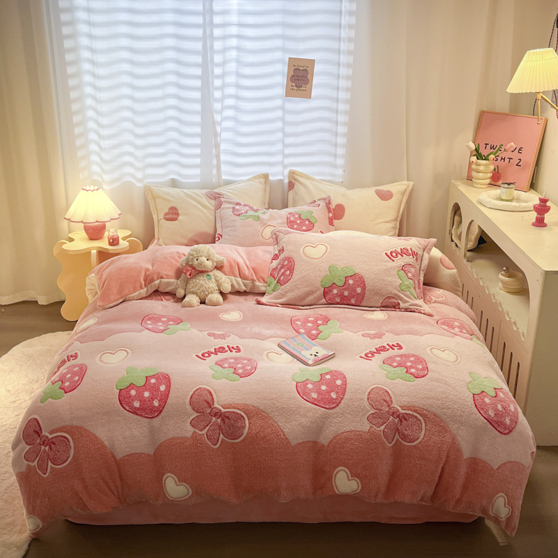 韩巢家纺 2025新款高克重印花牛奶绒床品四件套 爱心小樱桃,爱心小樱桃