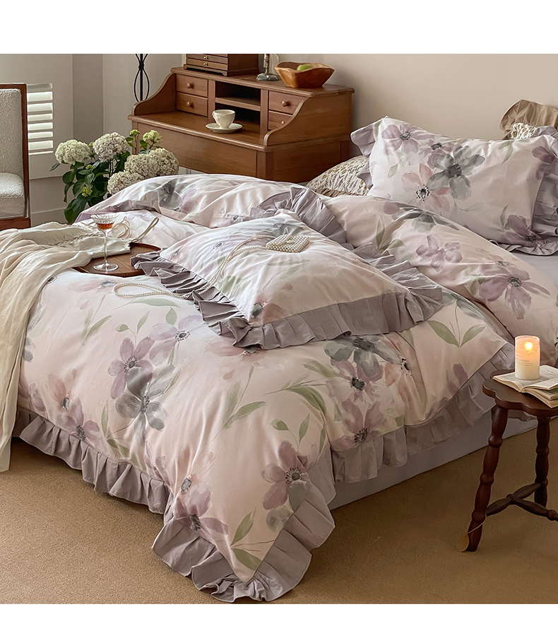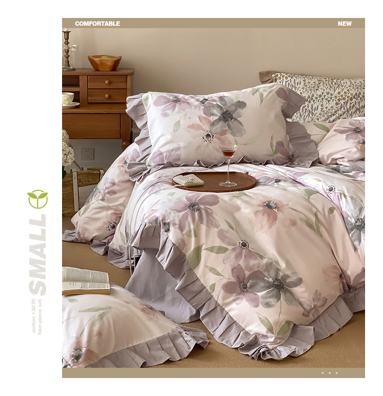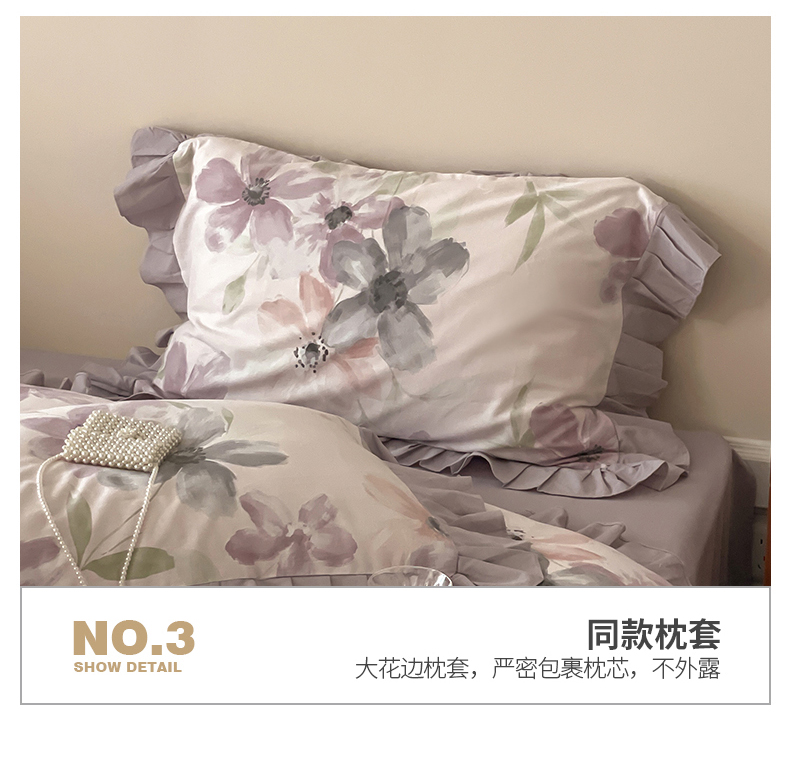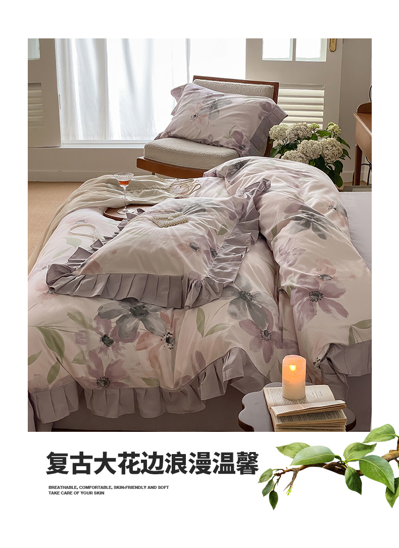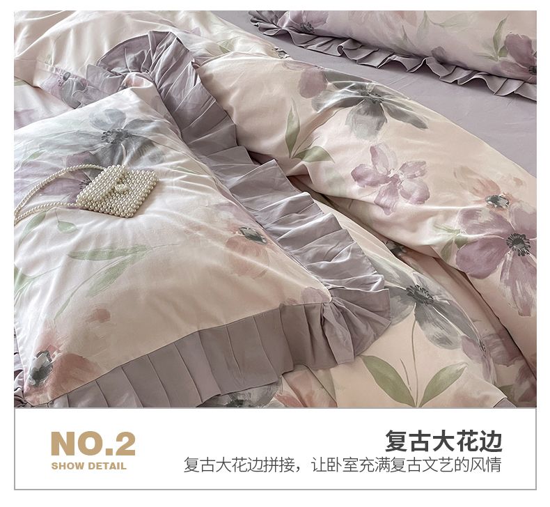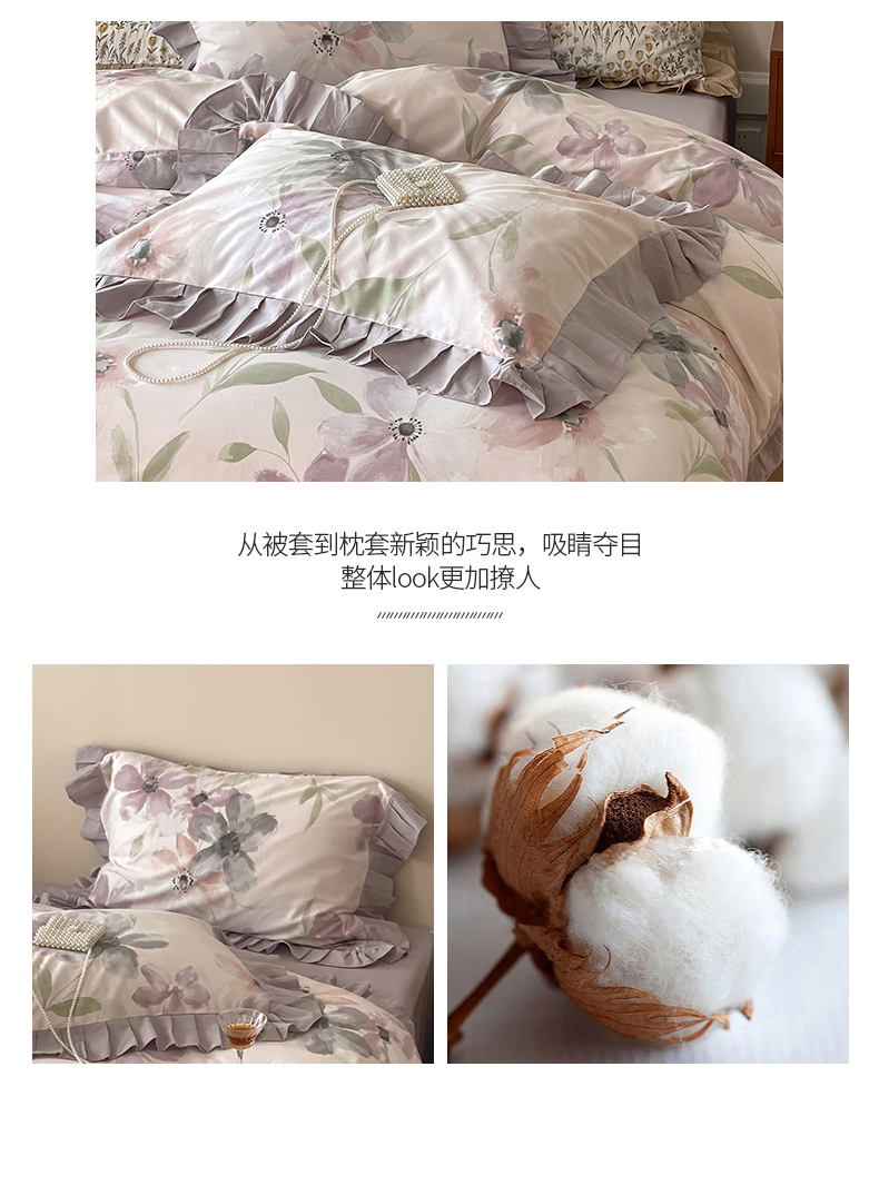 (总)窝米 2025新款数码印花100支长绒棉纯棉工艺花边款四件套-晚意,晚意