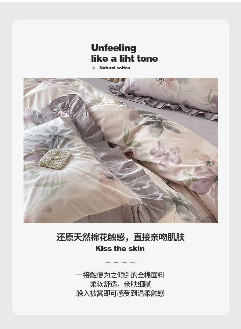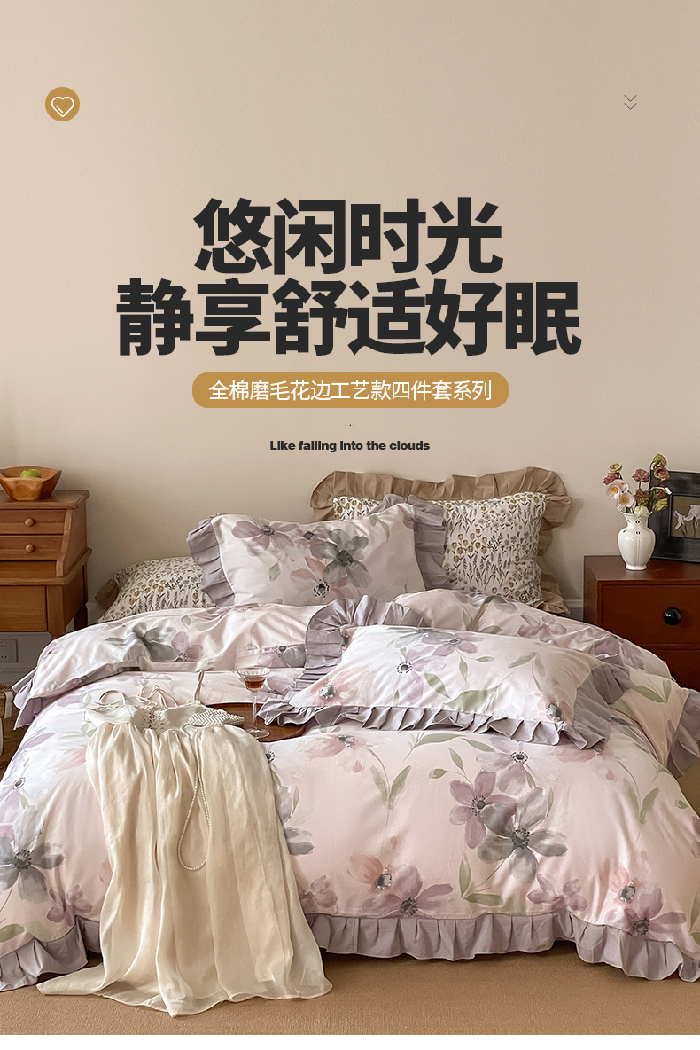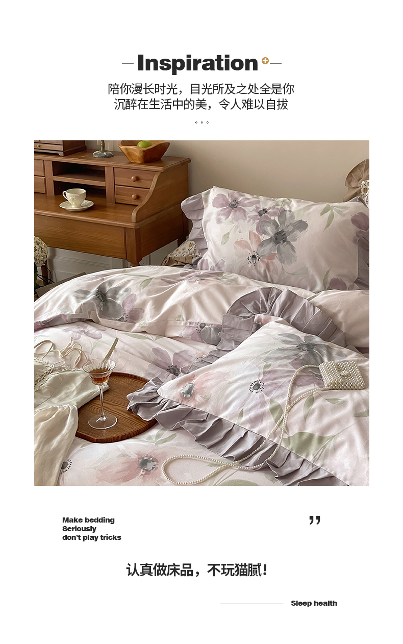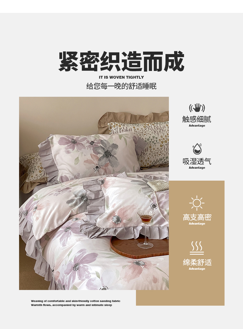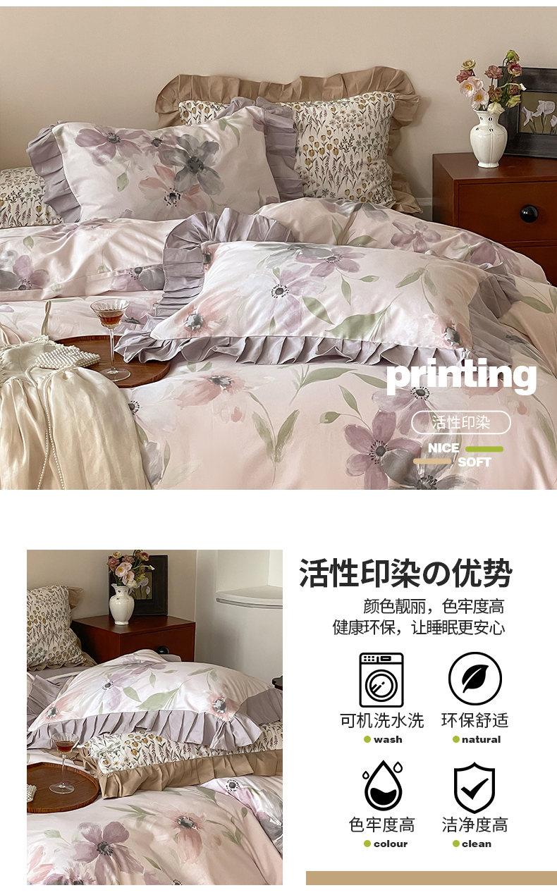 (总)窝米 2025新款数码印花100支长绒棉纯棉工艺花边款四件套-晚意,晚意