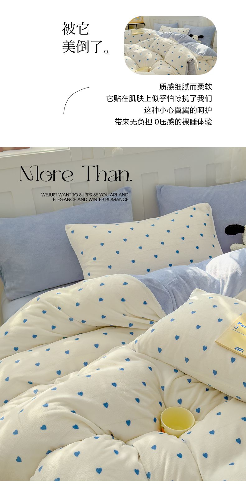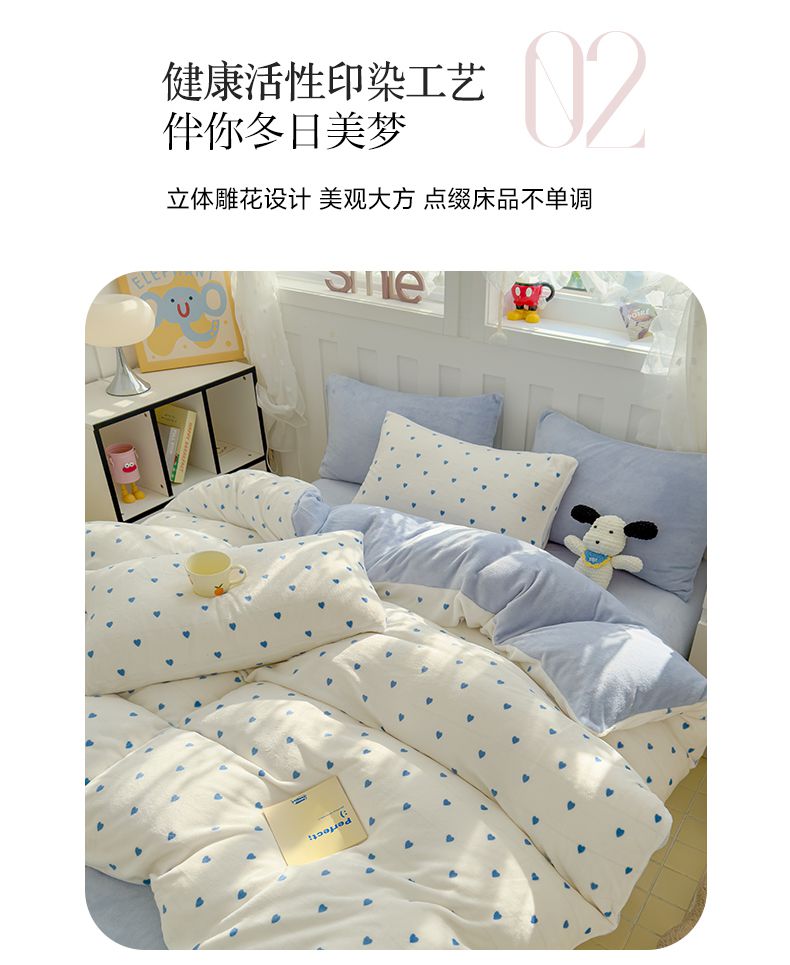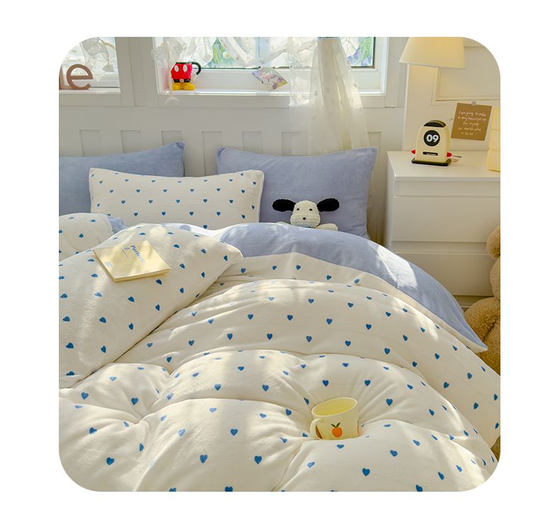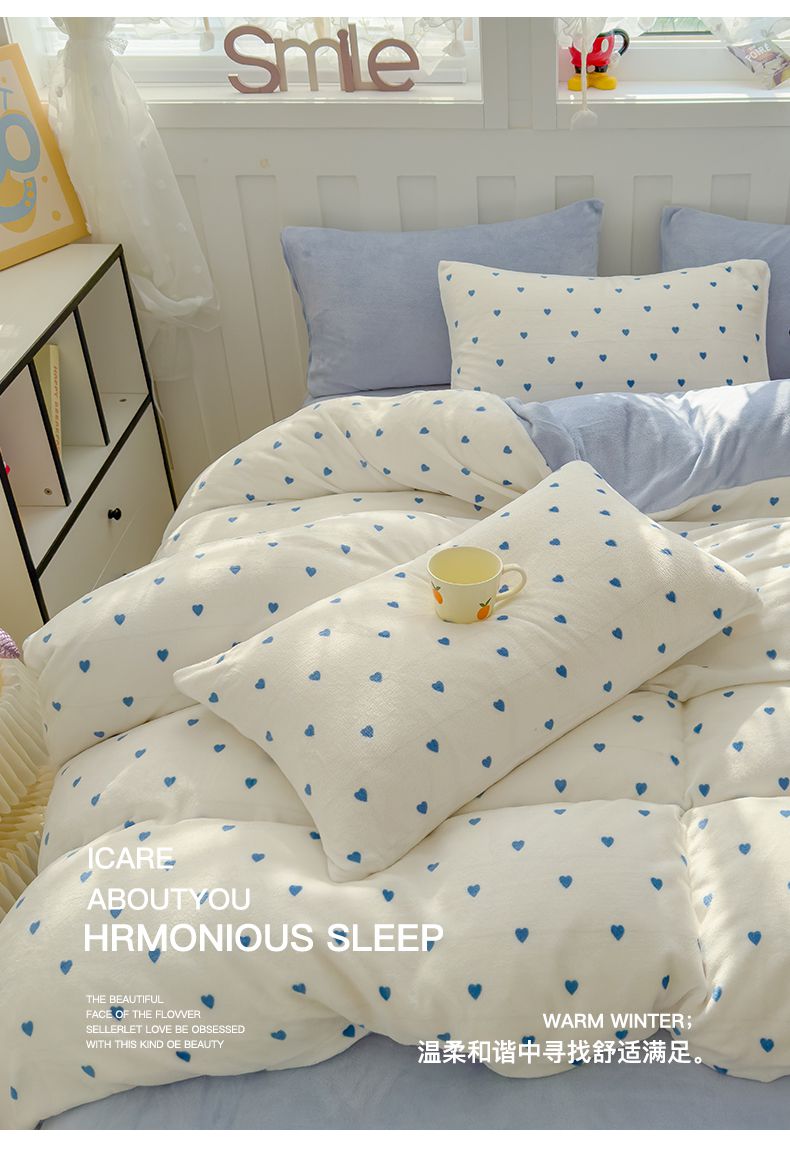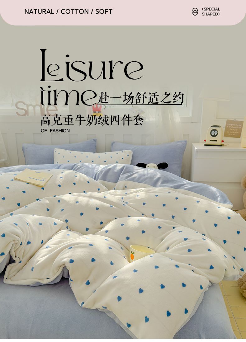 当前位置: 91家纺网 > 商品网购 > 床品套件 > 四件套 > 牛奶绒四件套 > 2024新款高克重亲肤牛奶绒四件套-场景一 蓝爱心