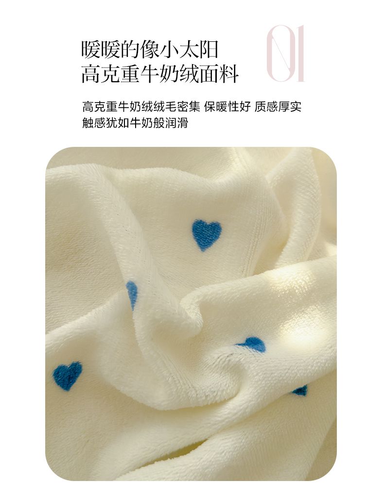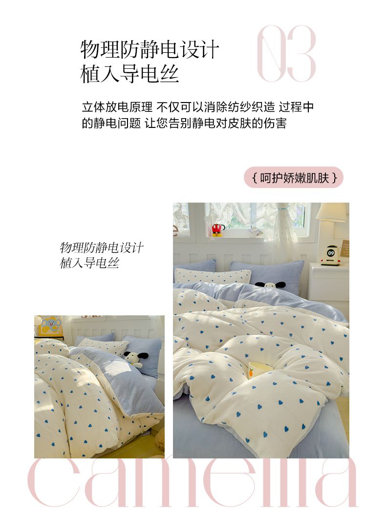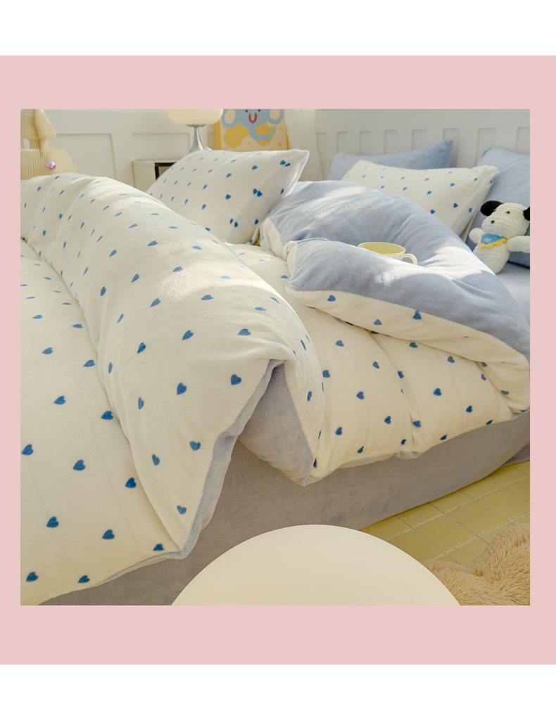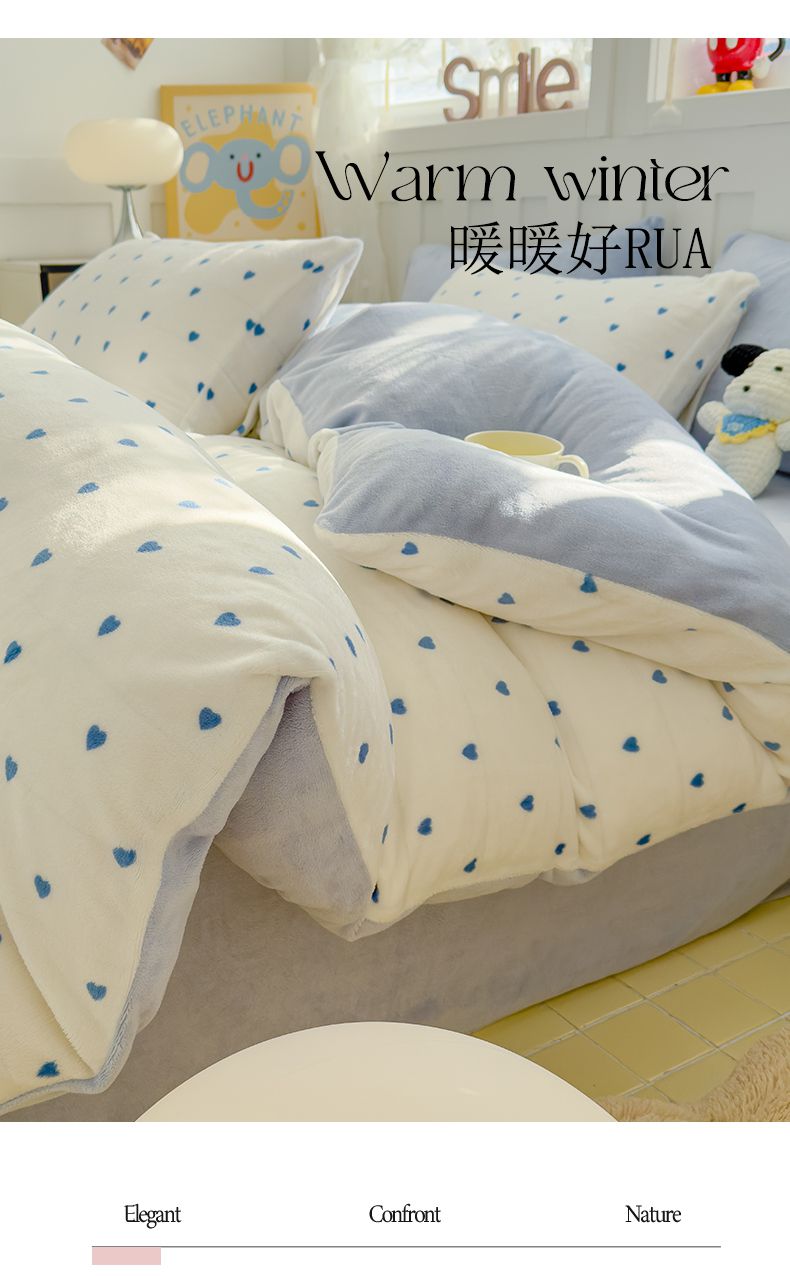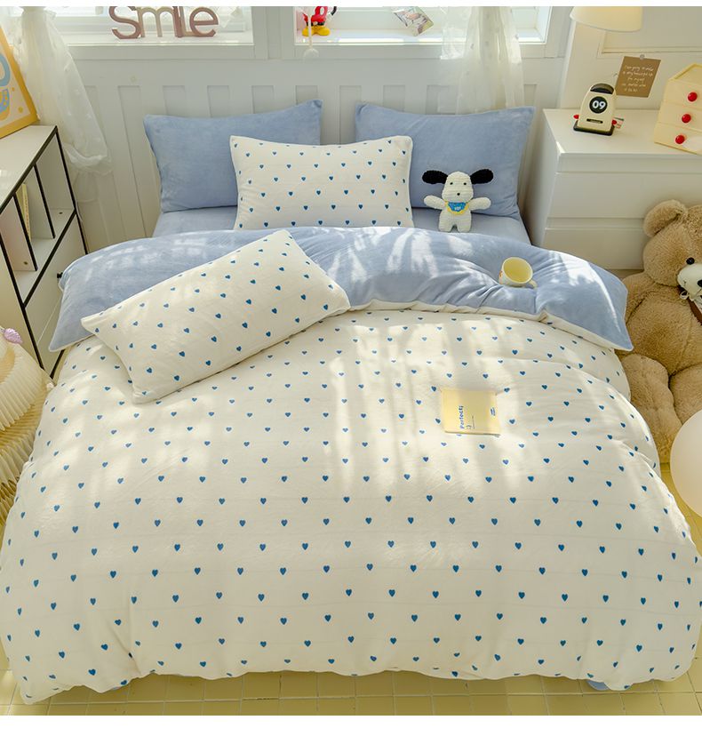当前位置: 91家纺网 > 商品网购 > 床品套件 > 四件套 > 牛奶绒四件套 > 2024新款高克重亲肤牛奶绒四件套-场景一 蓝爱心