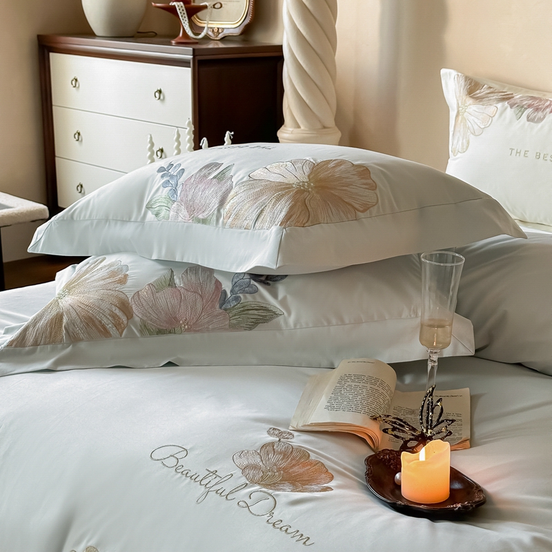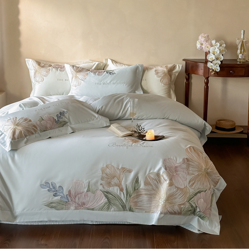 沐晴 2024秋冬新款100支长绒棉纯色绣花宽边工艺款四件套 墨雨云间-蓝