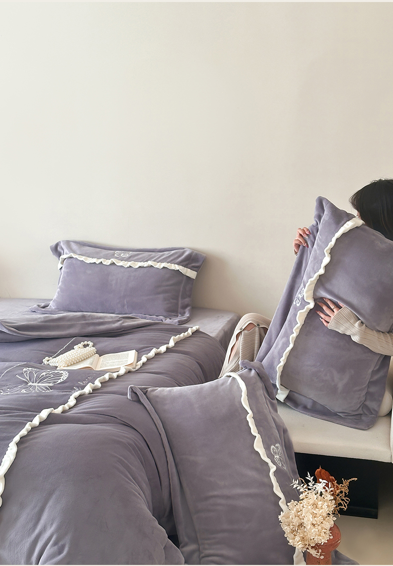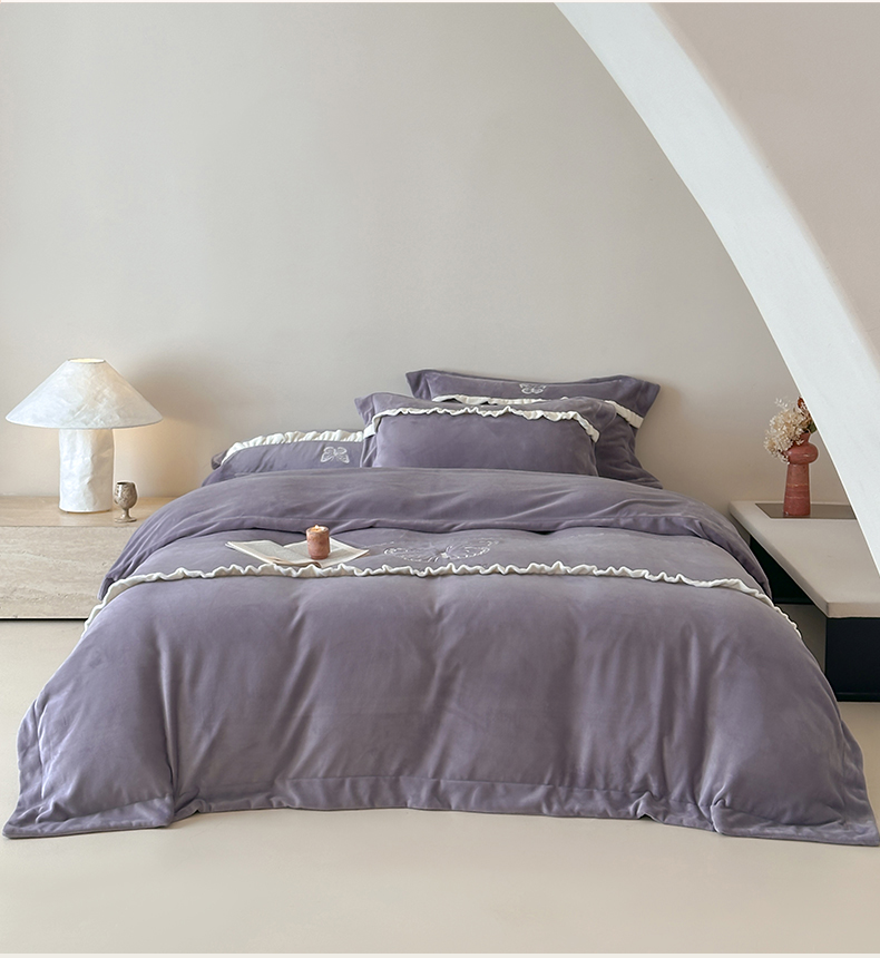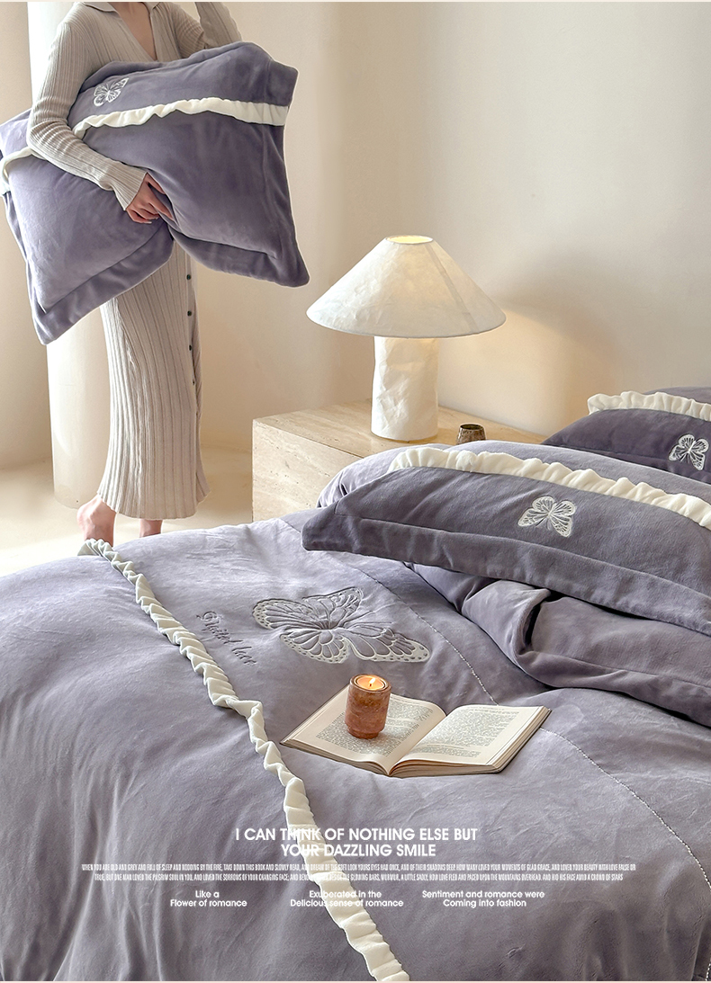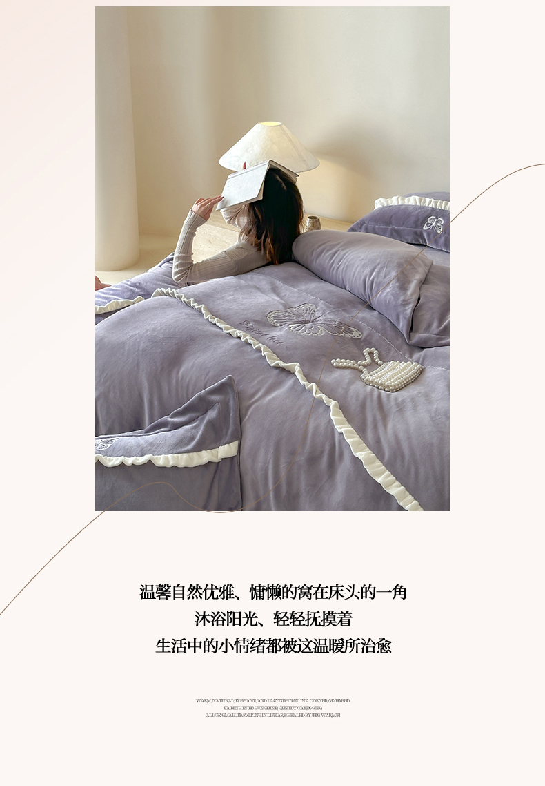 2024新款牛奶绒刺绣花边四件套-蝶音 梦紫灰