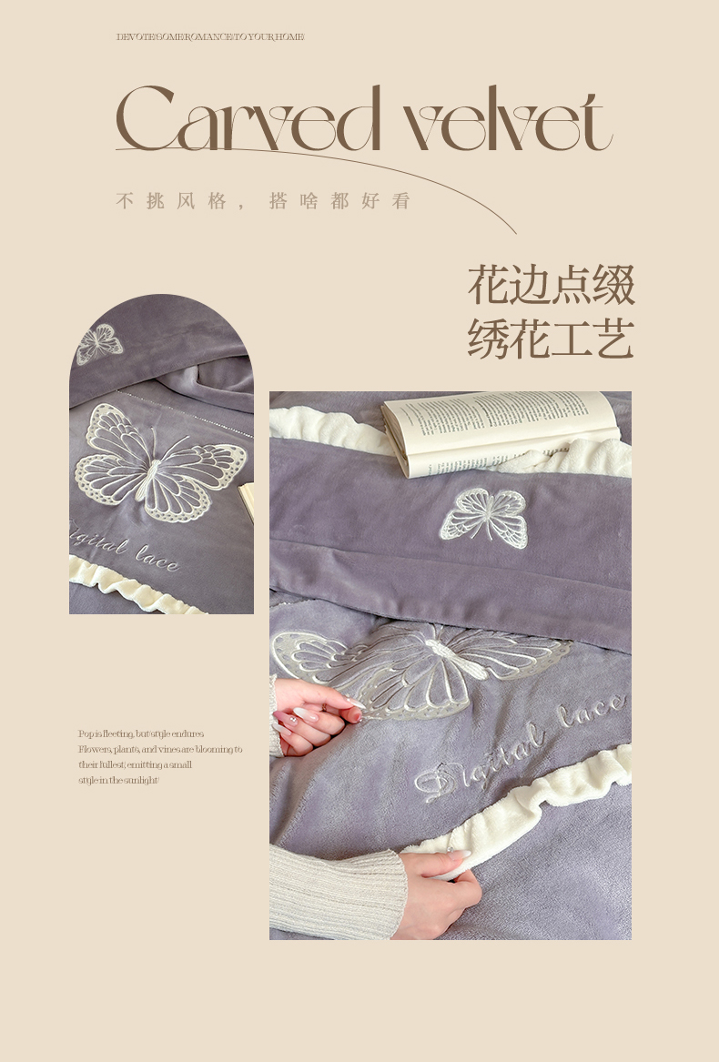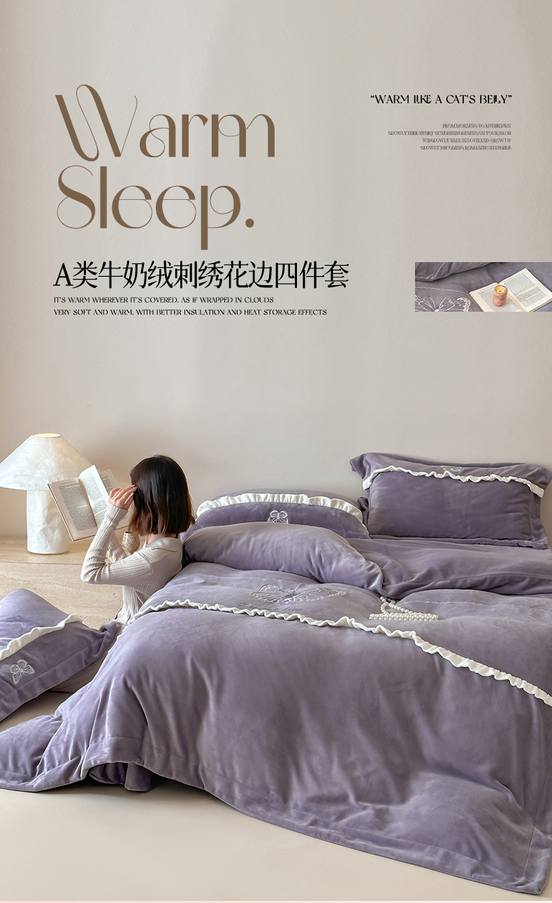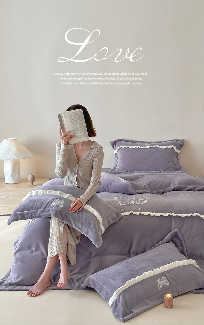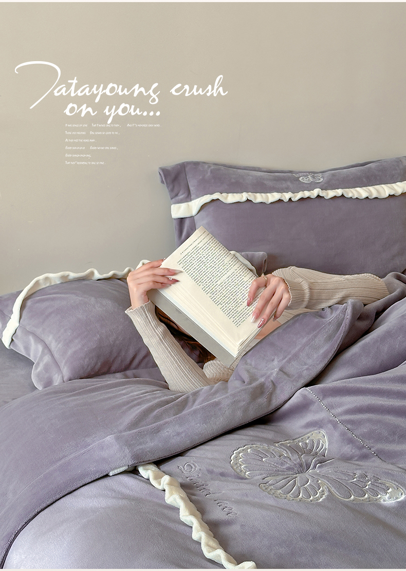 2024新款牛奶绒刺绣花边四件套-蝶音 梦紫灰