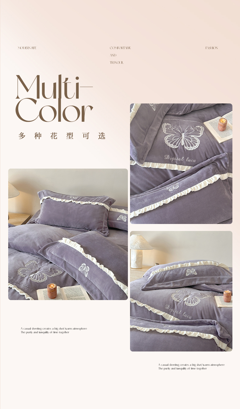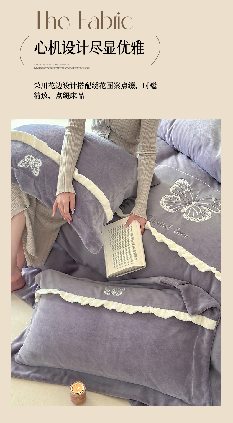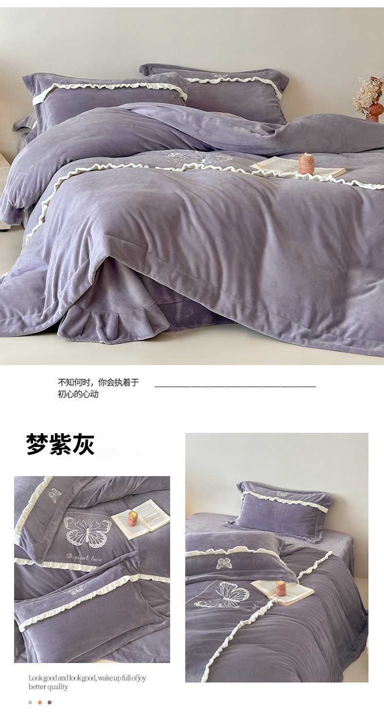 商品名称:2024新款牛奶绒刺绣花边四件套-蝶音 梦紫灰