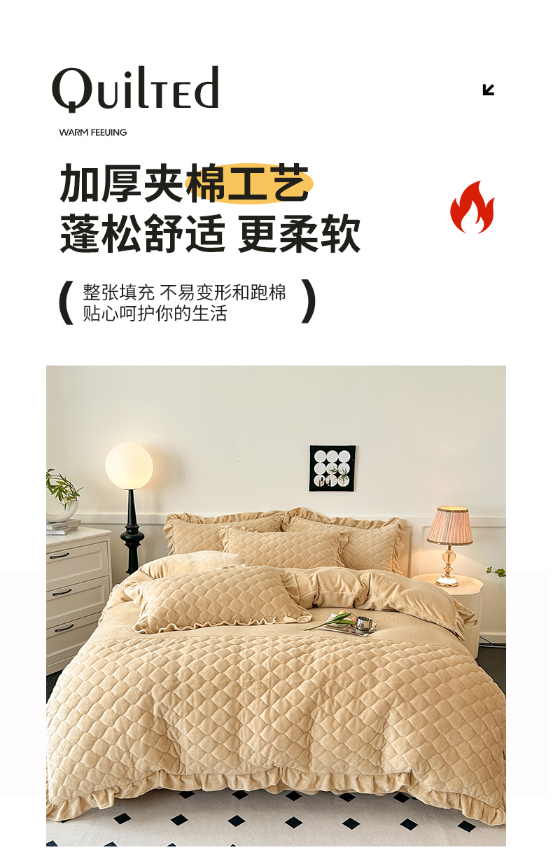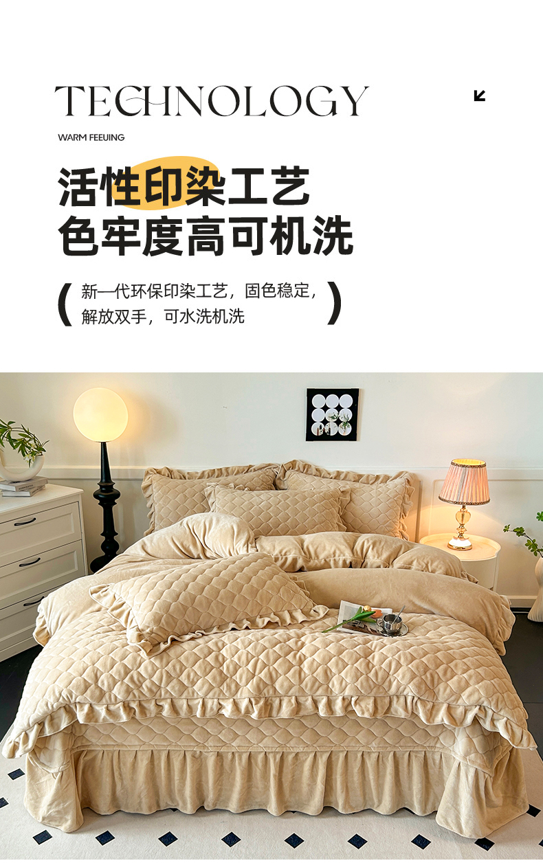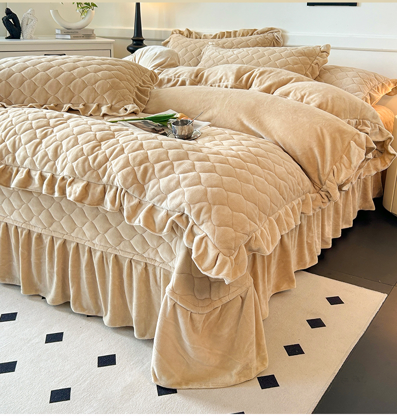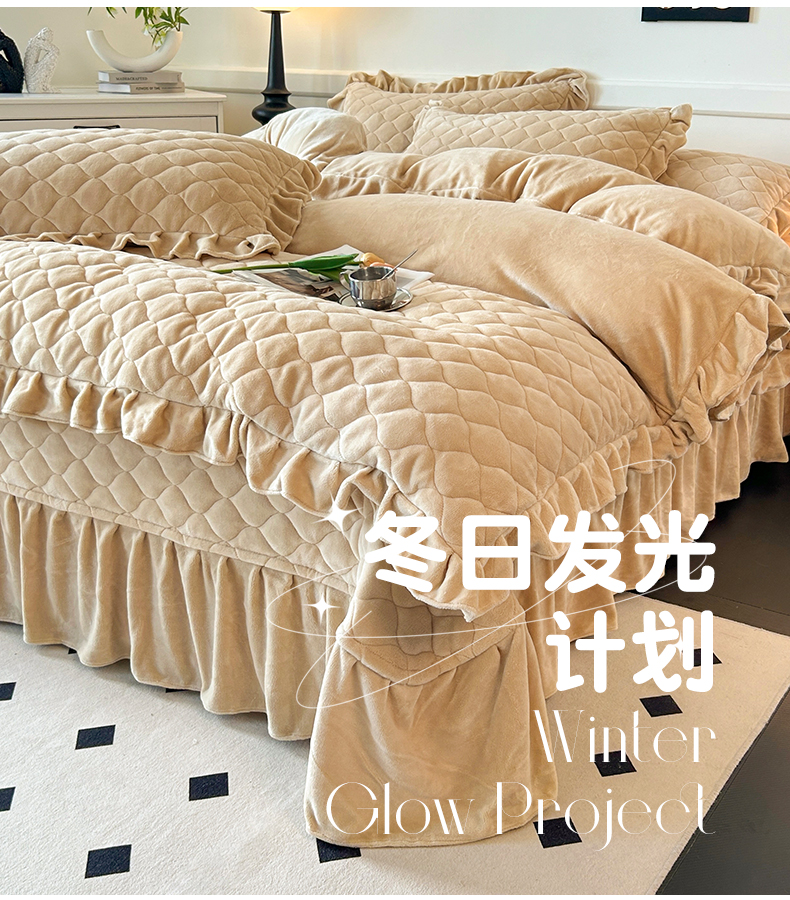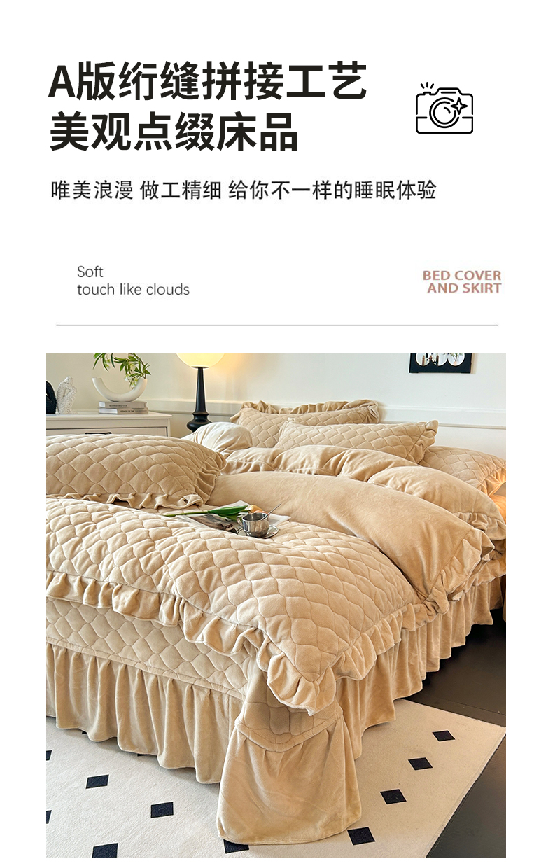 (总)屹成家纺2025新款水晶绒夹棉绗缝床裙四件套(塞纳河畔)四件套起售价不低于230元,大红,豆沙,翡翠绿,粉玉,橄榄绿,蔚蓝,银灰