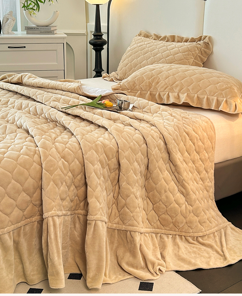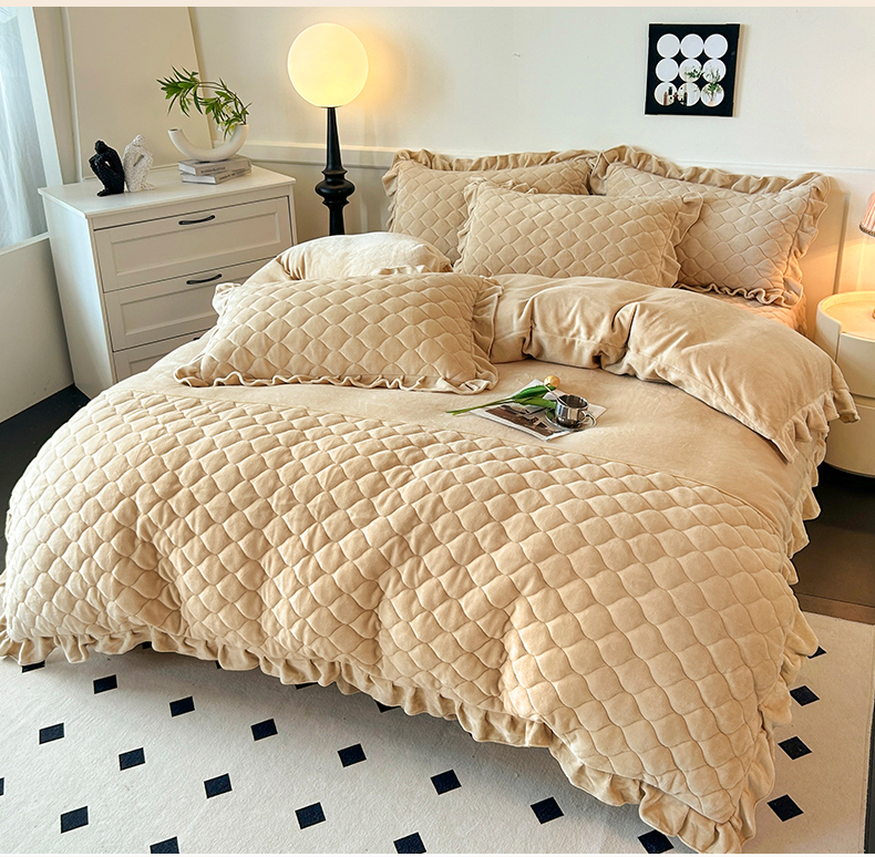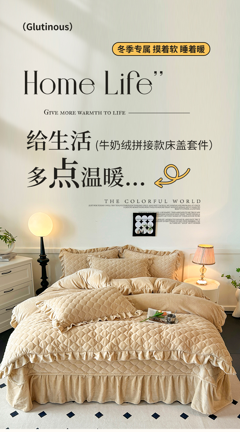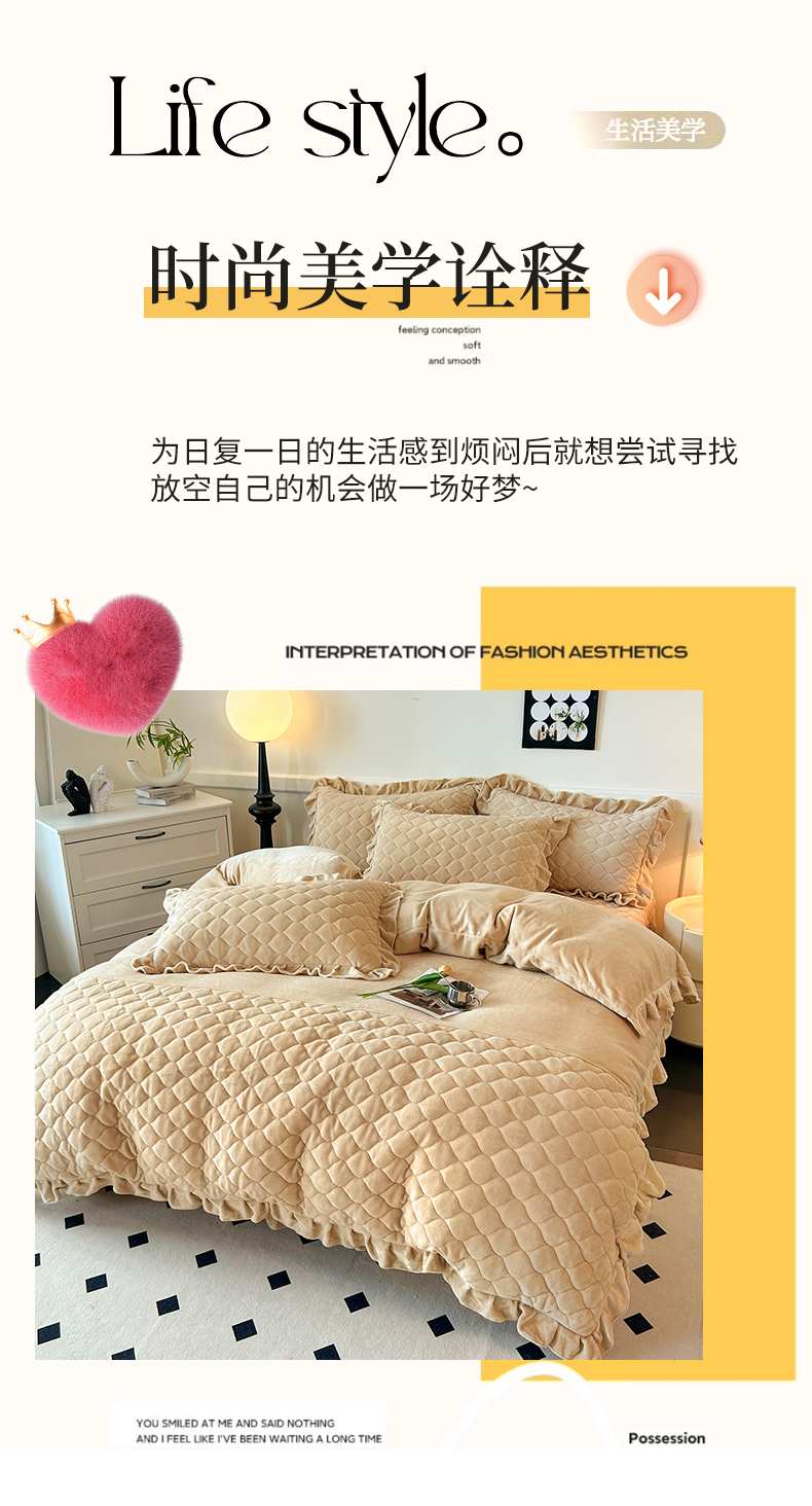 (总)屹成家纺2025新款水晶绒夹棉绗缝床裙四件套(塞纳河畔)四件套起售价不低于230元,大红,豆沙,翡翠绿,粉玉,橄榄绿,蔚蓝,银灰