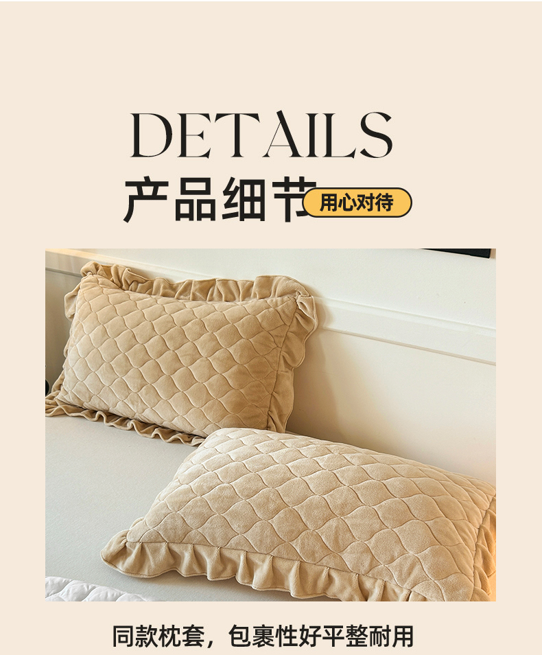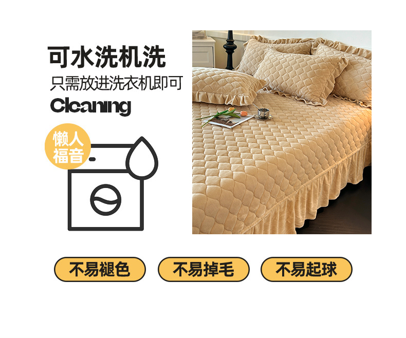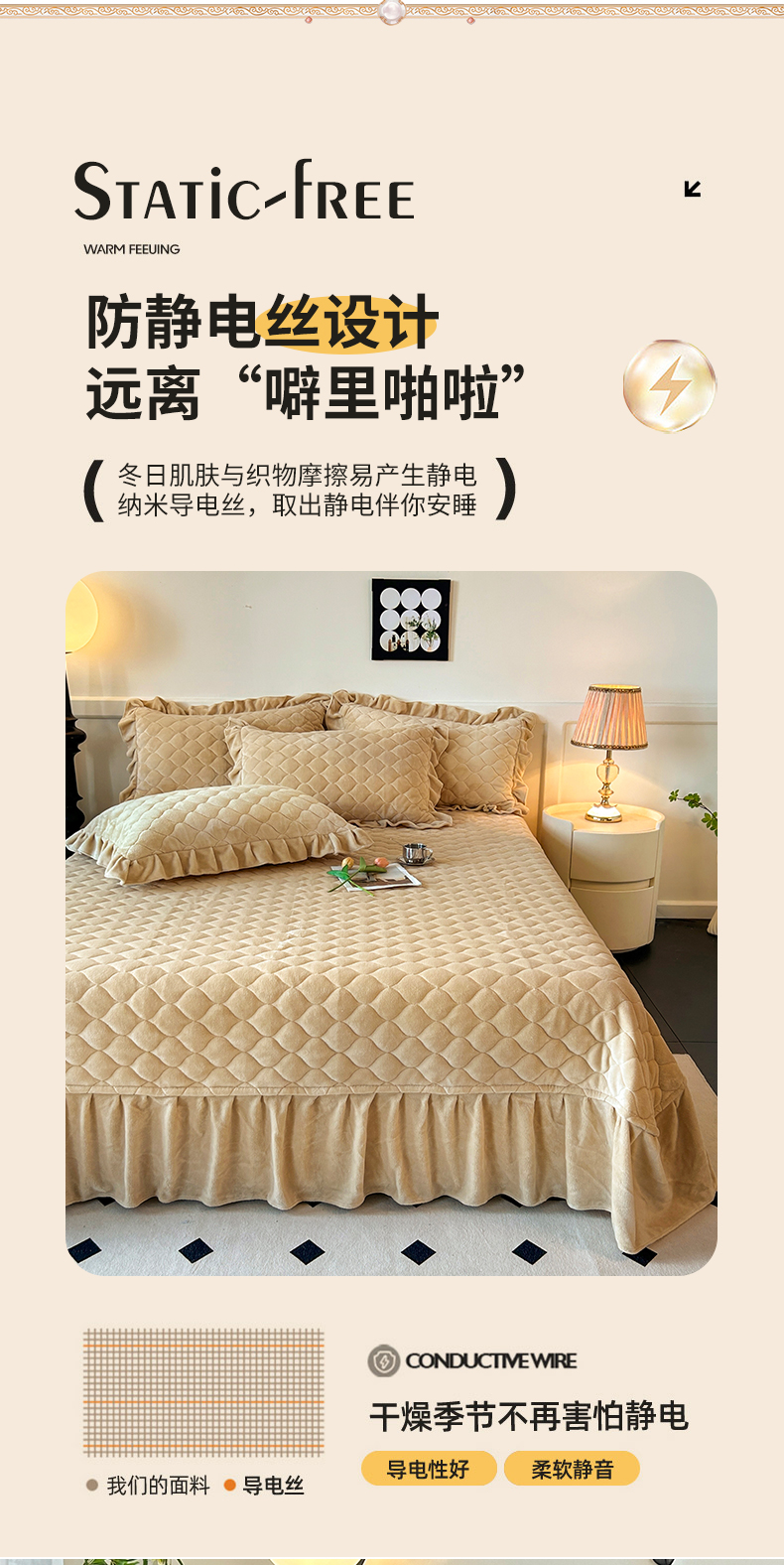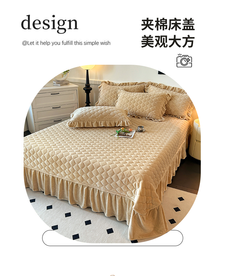 (总)屹成家纺2025新款水晶绒夹棉绗缝蕾丝床裙三件套(塞纳河畔)床裙单件起售价不低于105元,大红,豆沙,翡翠绿,粉玉,橄榄绿,蔚蓝,银灰