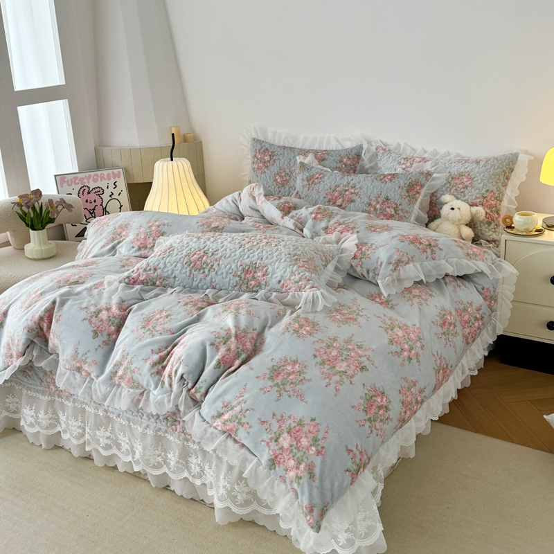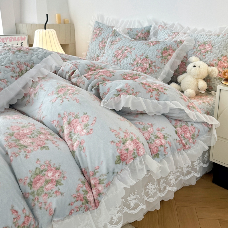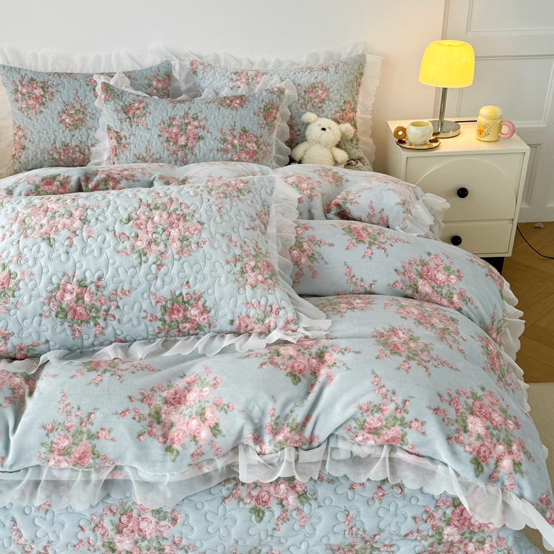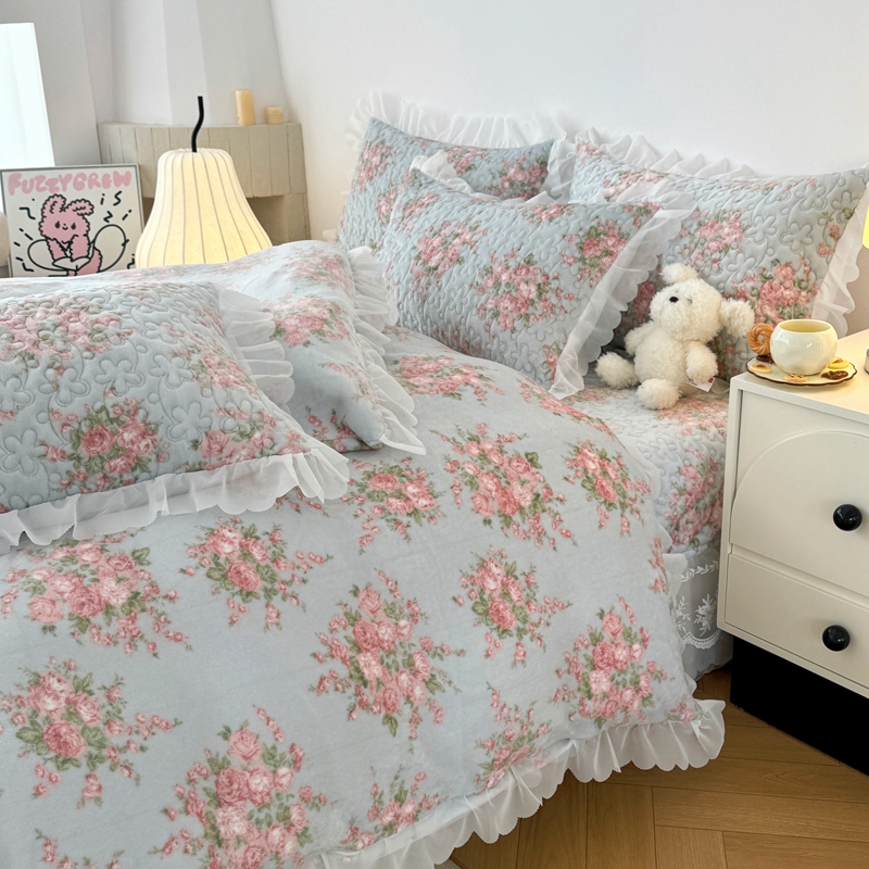 添越 2024新款牛奶绒夹棉床盖三件套四件套 欧风花影