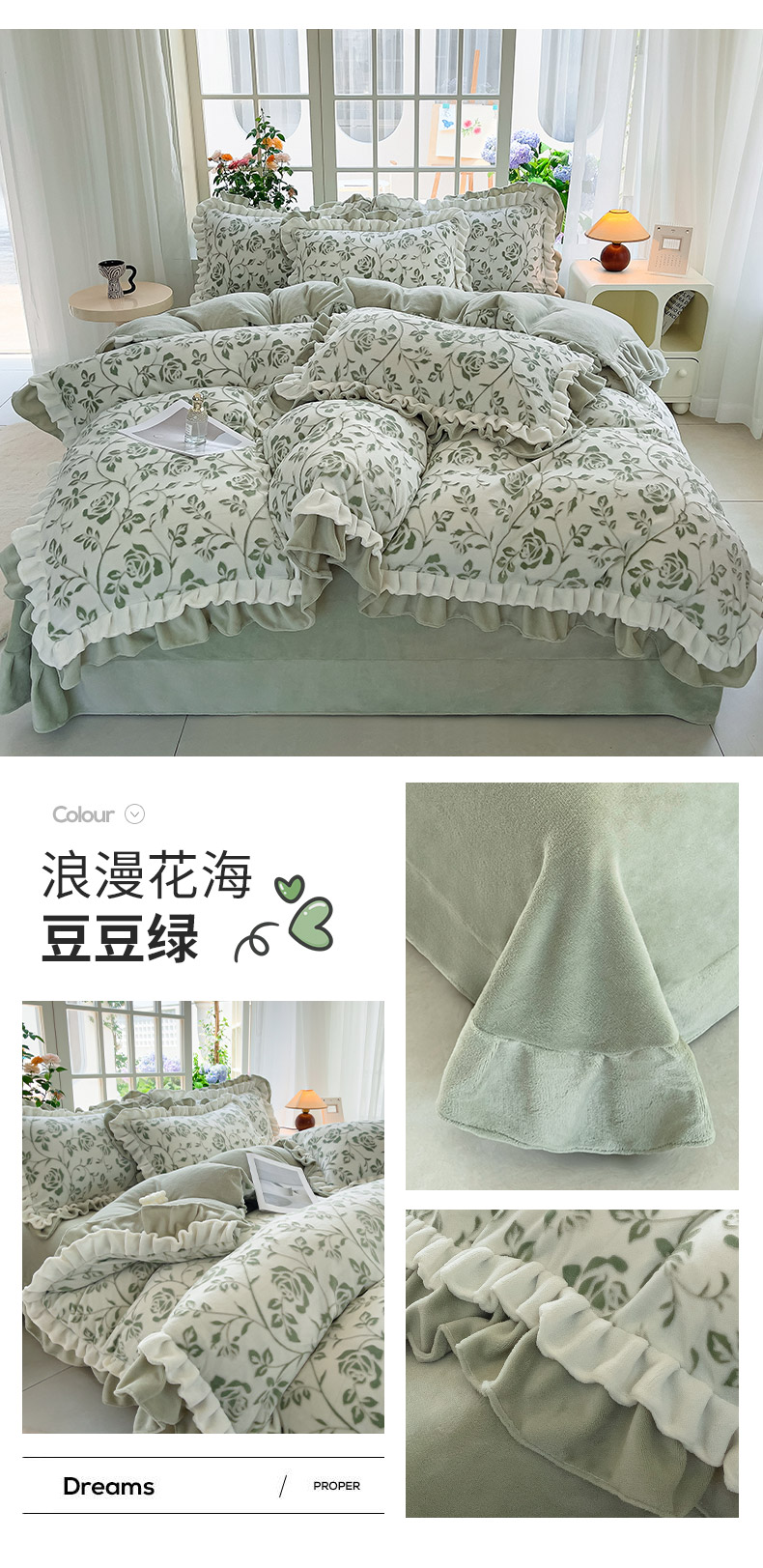 商品名称:(买家秀 爆款不断货)A类母婴级法式牛奶绒雕花四件套珊瑚绒小香风牛奶绒四件套雪花绒四件套雕花绒四件套 浪漫花海-豆豆绿