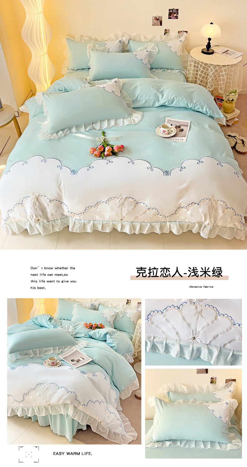 当前位置: 91家纺网 > 商品网购 > 床品套件 > 四件套 > 水洗棉四件套 > 慕语家纺 2025新款韩版高支高密水洗磨毛棉贴布绣四件套-克拉恋人 克拉恋人-浅米绿