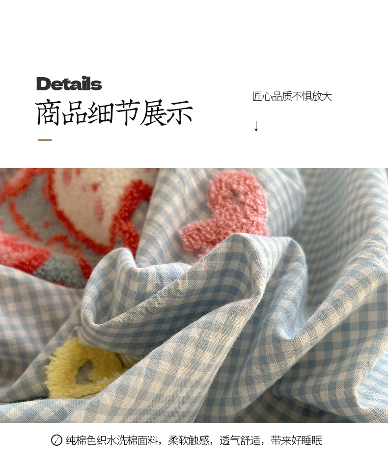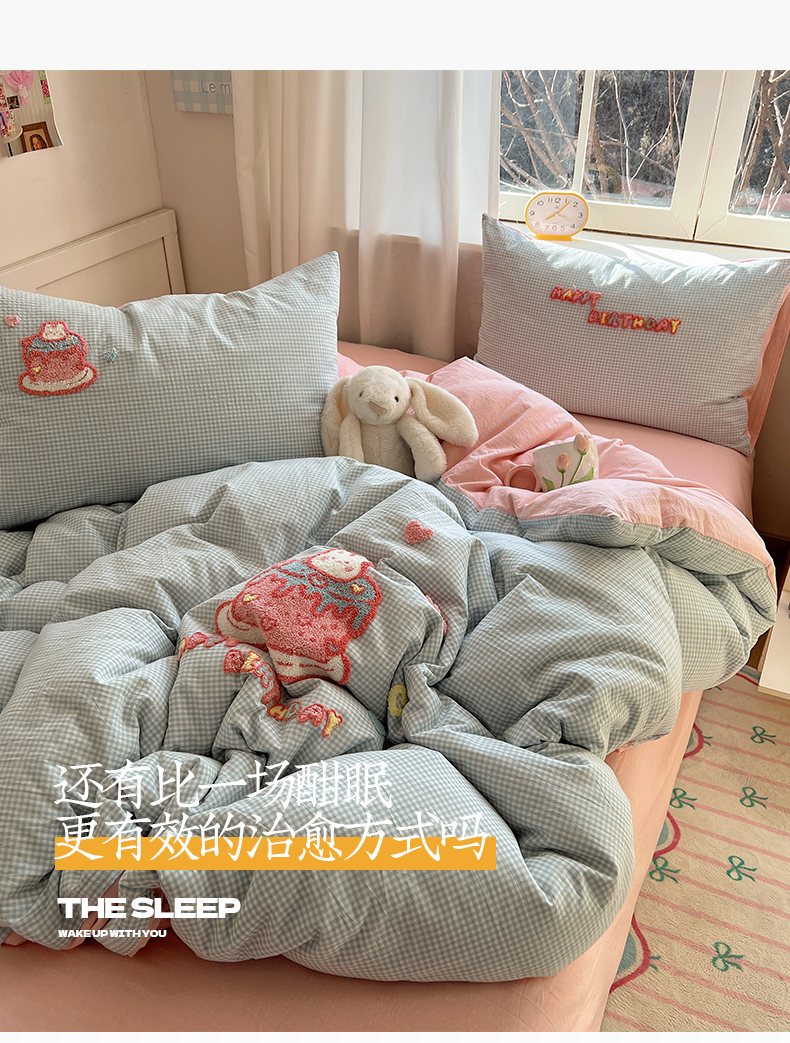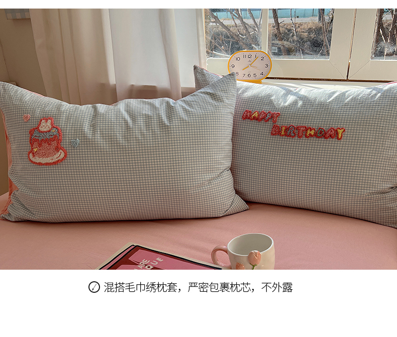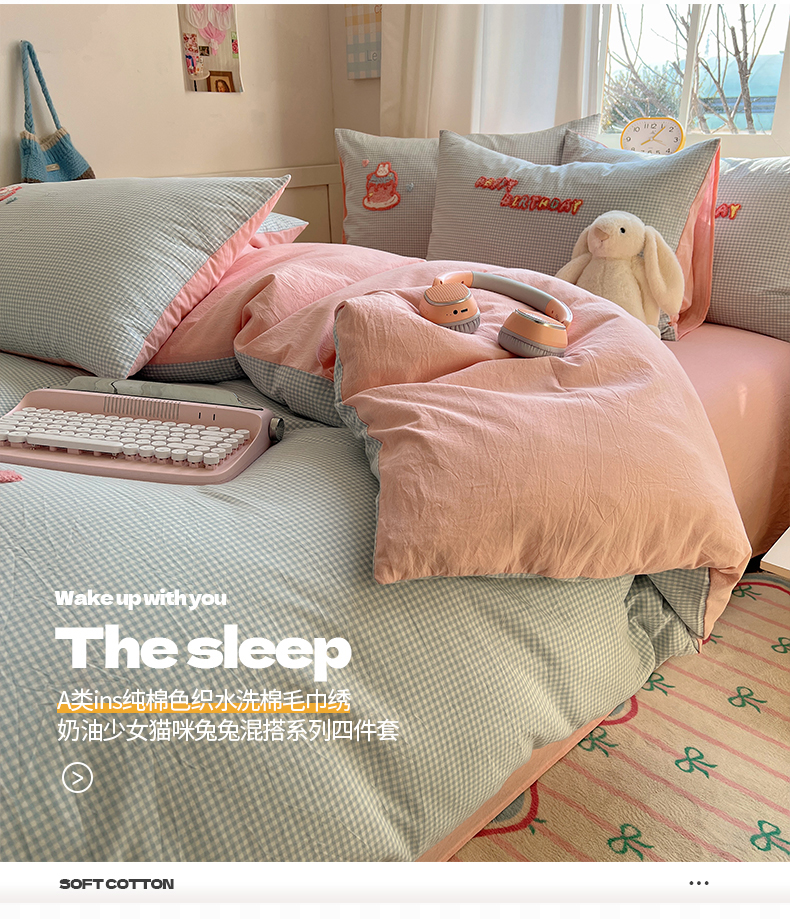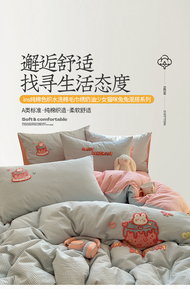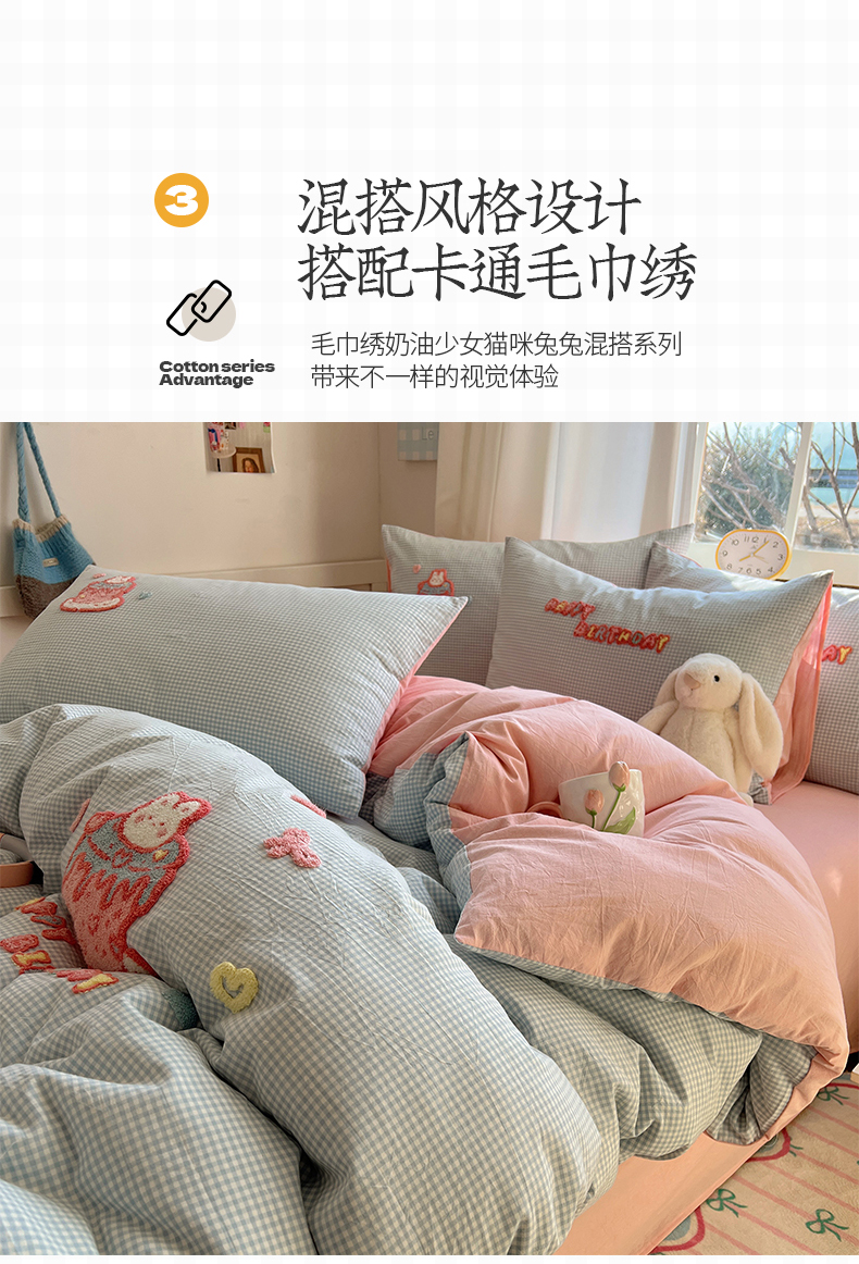 当前位置: 91家纺网 > 商品网购 > 床品套件 > 四件套 > 水洗棉四件套 > 桃子家居 2025新款A类ins纯棉色织水洗棉毛巾绣奶油少女猫咪兔兔混搭系列四件套 色织水洗棉-奶油兔蓝粉