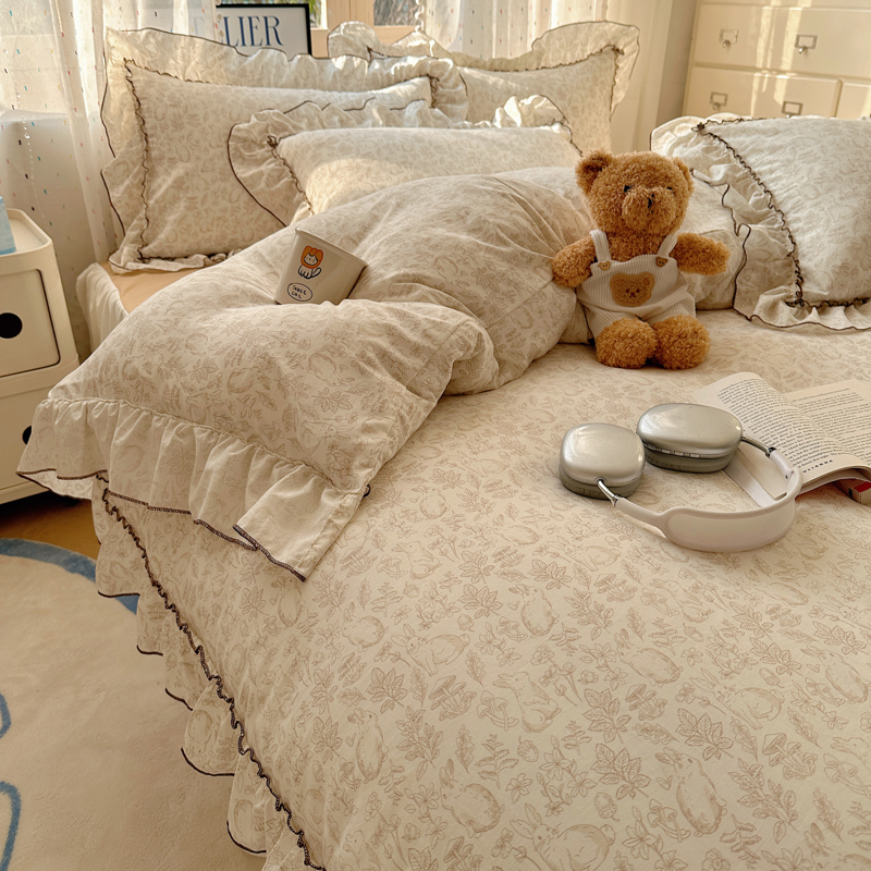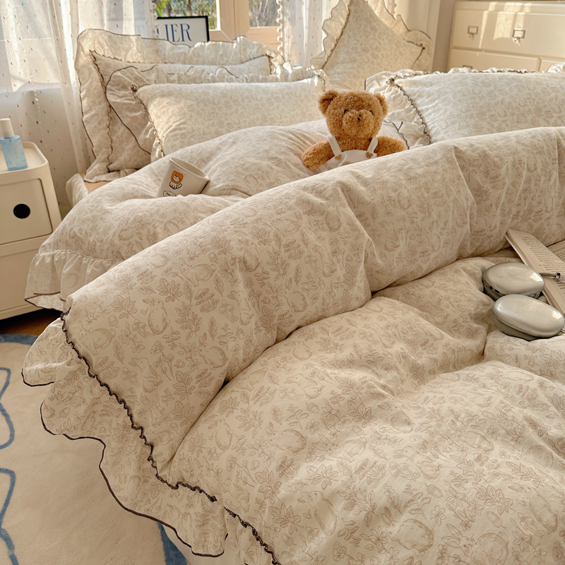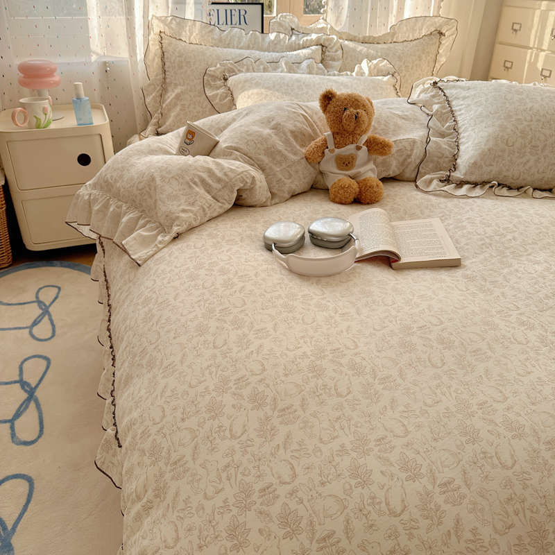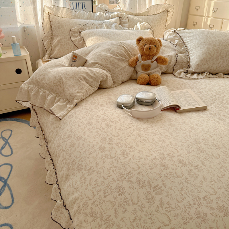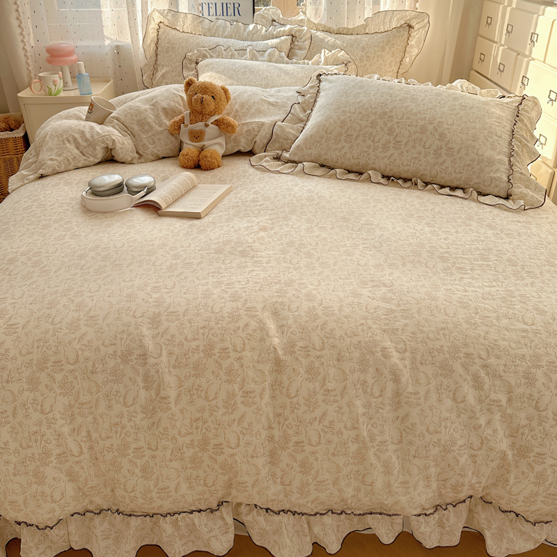 当前位置: 91家纺网 > 商品网购 > 床品套件 > 四件套 > 其它四件套 > 盼季家纺 2025新款公主风花边小清新水洗棉床上四件套床单被套床裙三件套-风格二 兔兔密语
