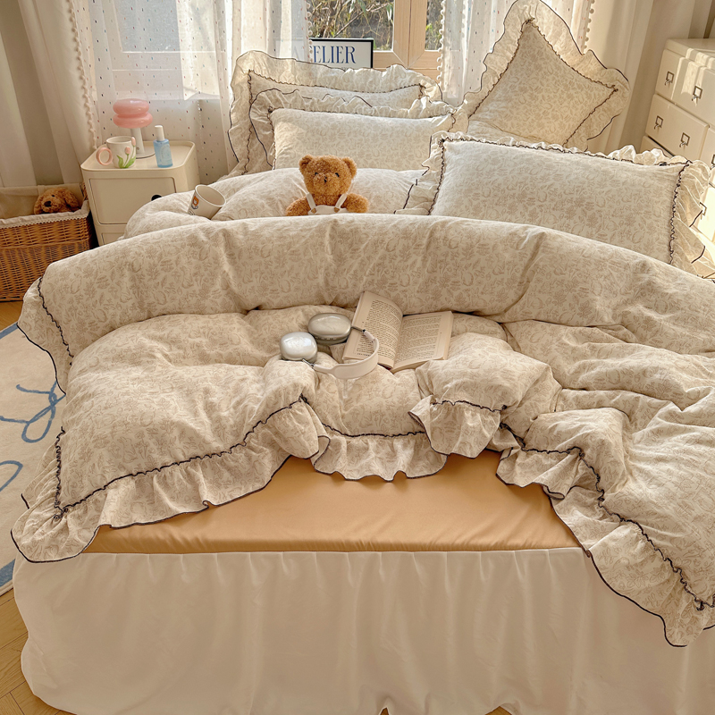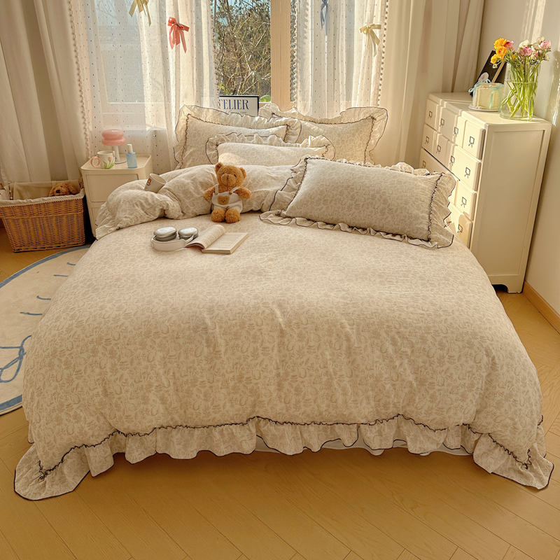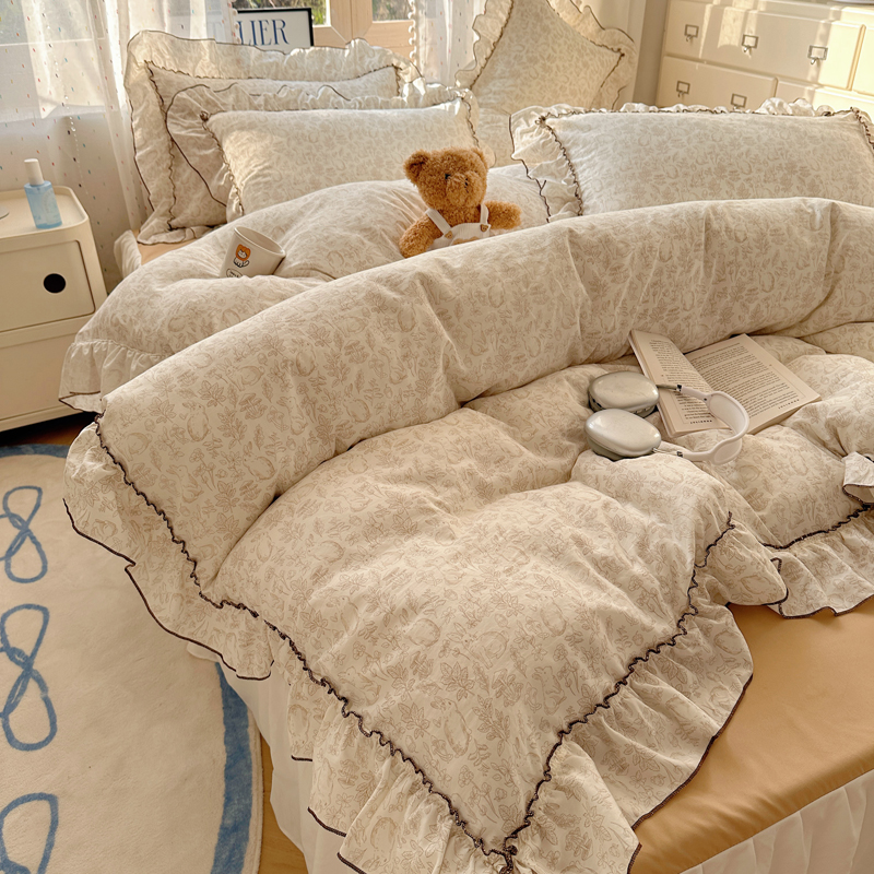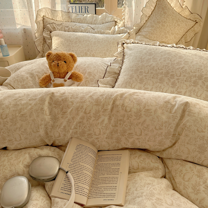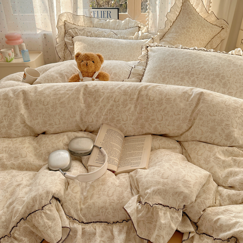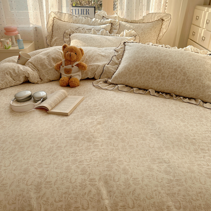 当前位置: 91家纺网 > 商品网购 > 床品套件 > 四件套 > 其它四件套 > 盼季家纺 2025新款公主风花边小清新水洗棉床上四件套床单被套床裙三件套-风格二 兔兔密语