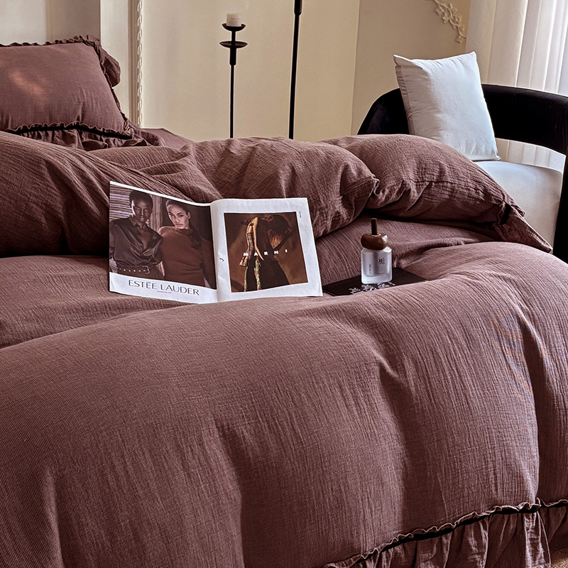 (总)多乐娜 2025年新款轻法式复古风纯棉色织双层纱四件套花边全棉工艺款,沐光栗棕,沐光绿蔓