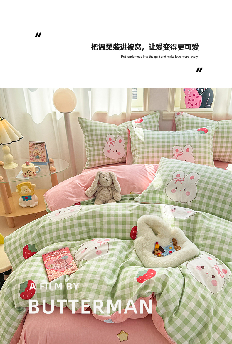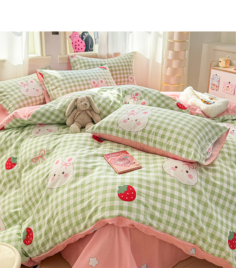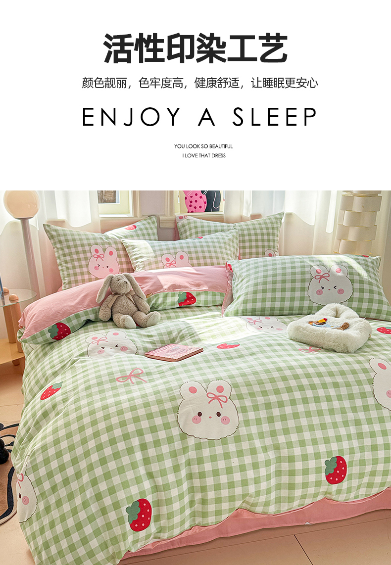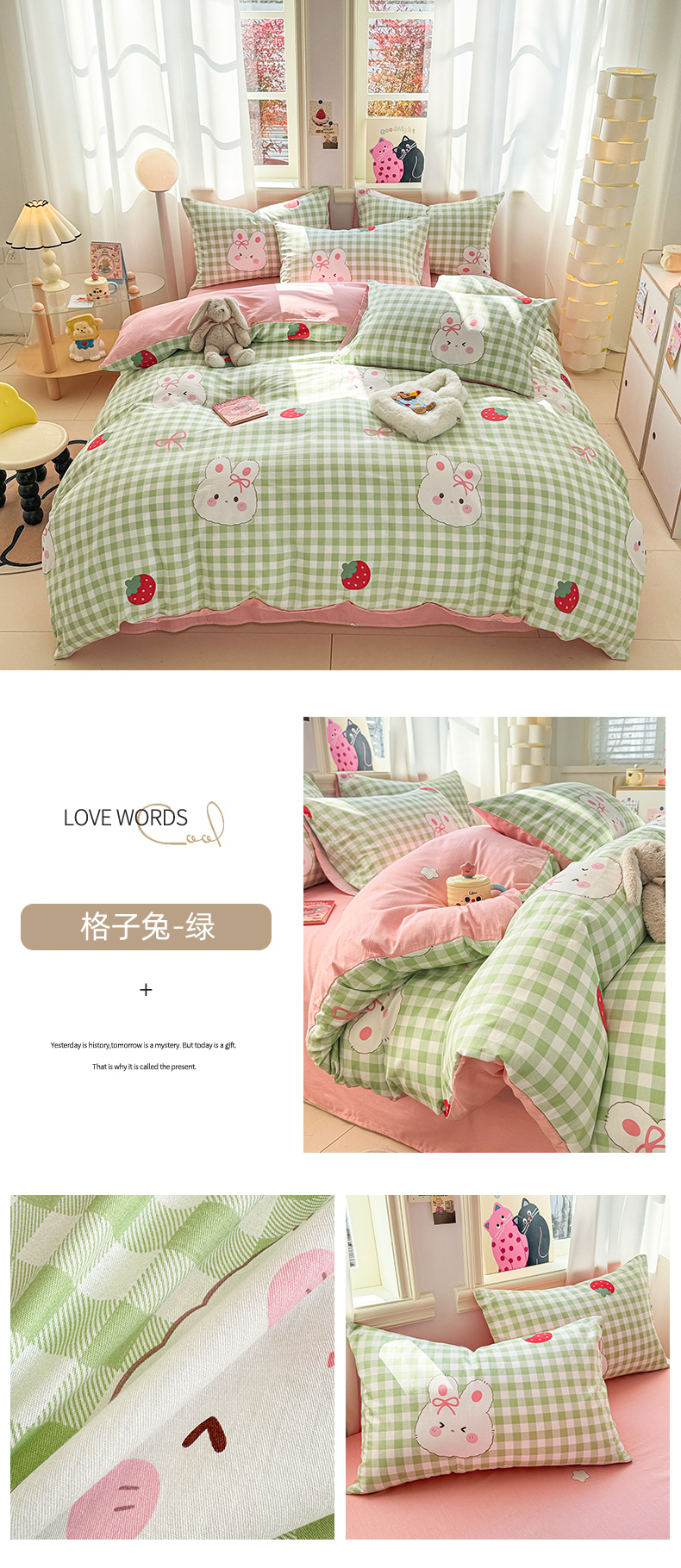 商品名称:简宜家居(朝初家纺) 2025新款40支13070纯棉四件套 格子兔-绿