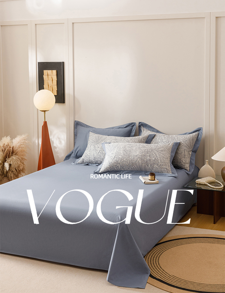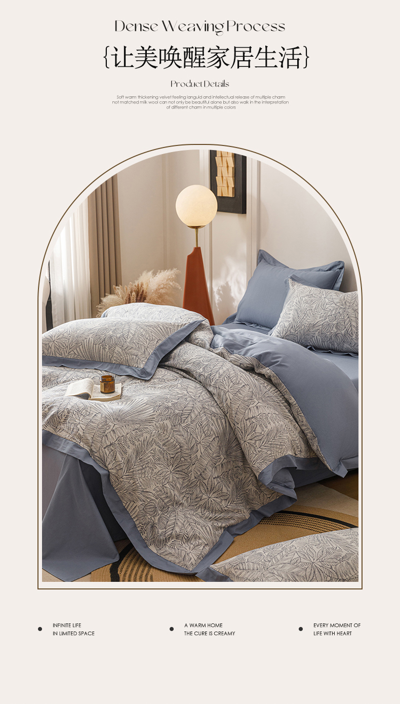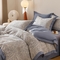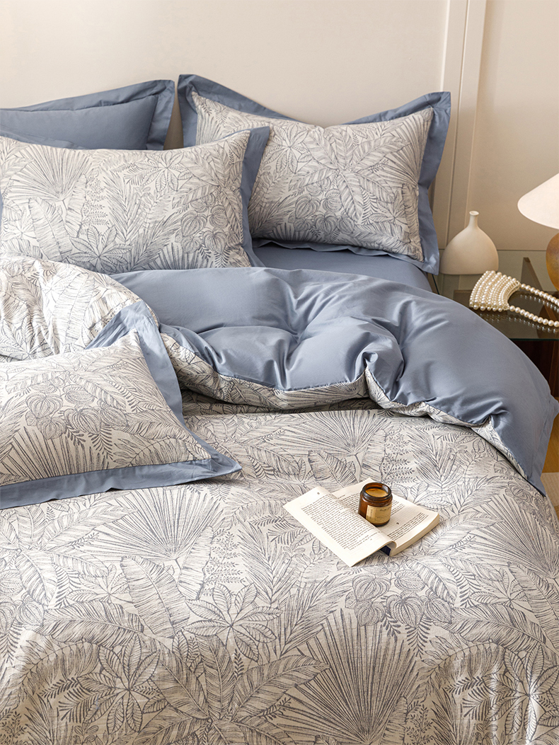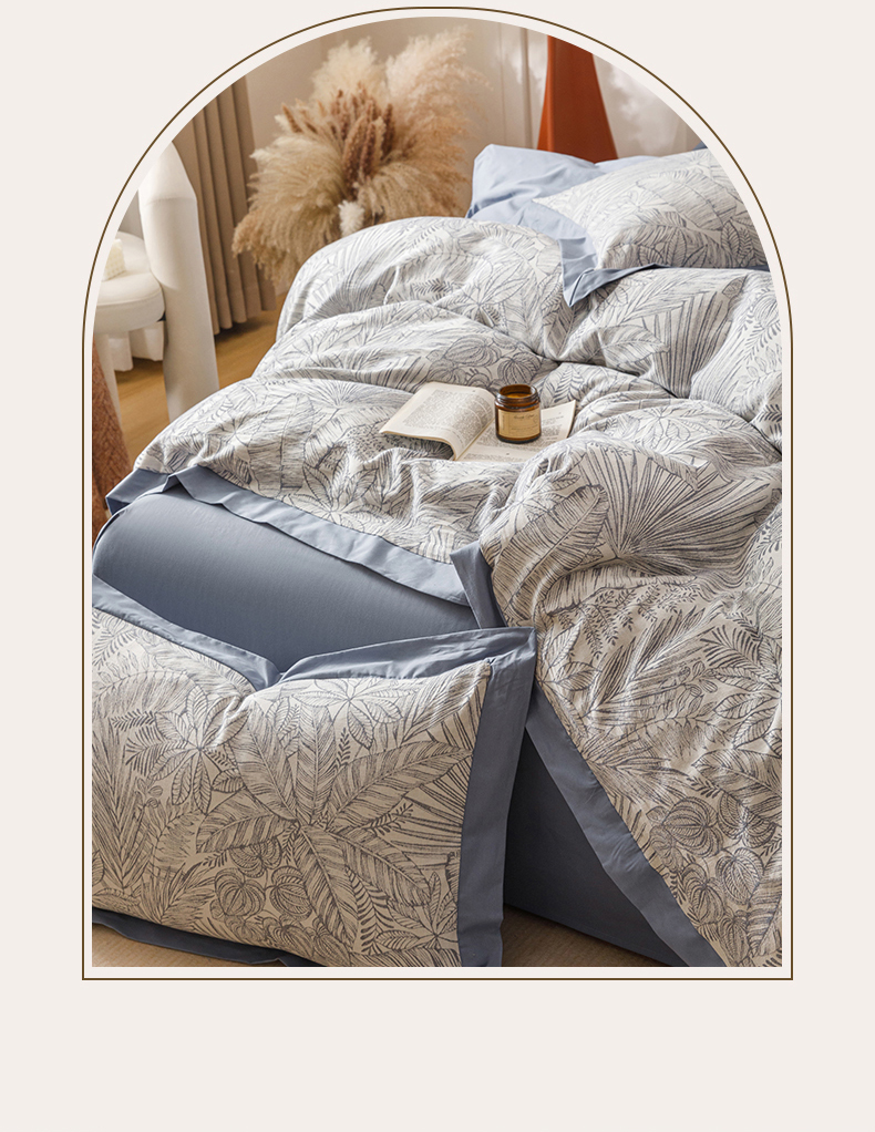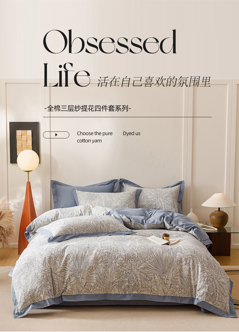 简宜家居(朝初家纺) 2025新款全棉宽边三层纱提花四件套 叶韵-牛仔蓝