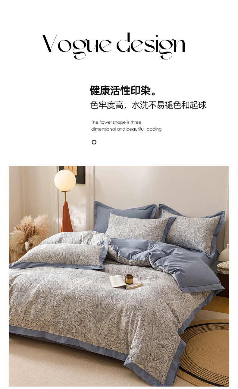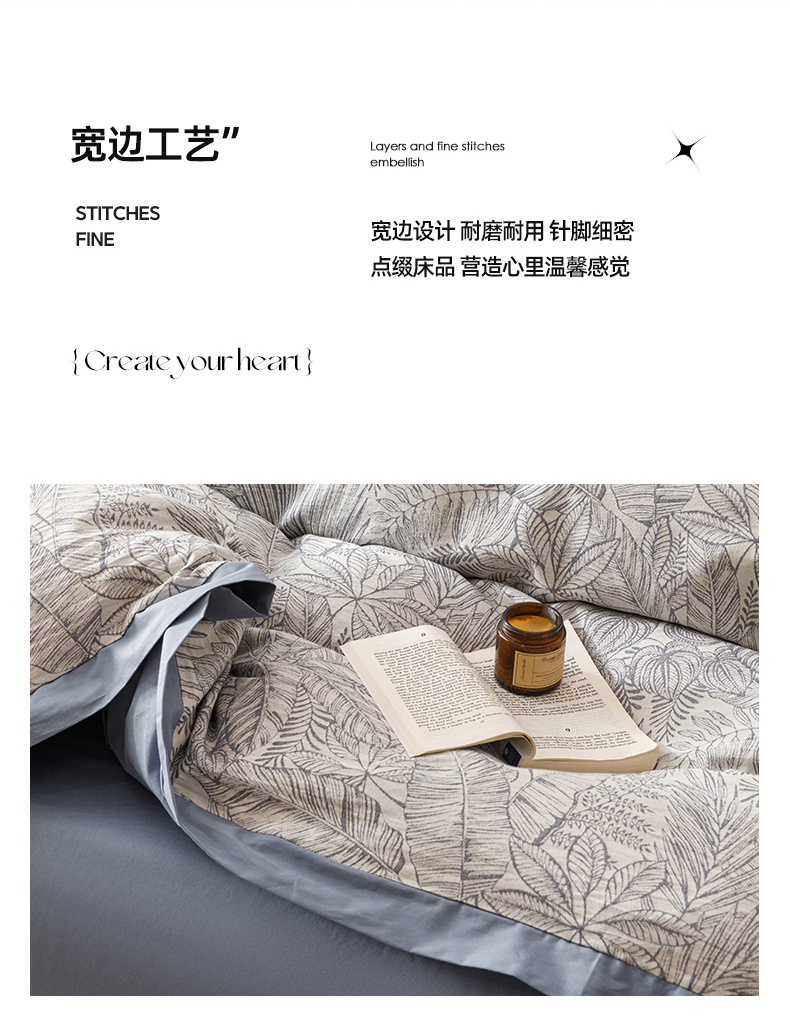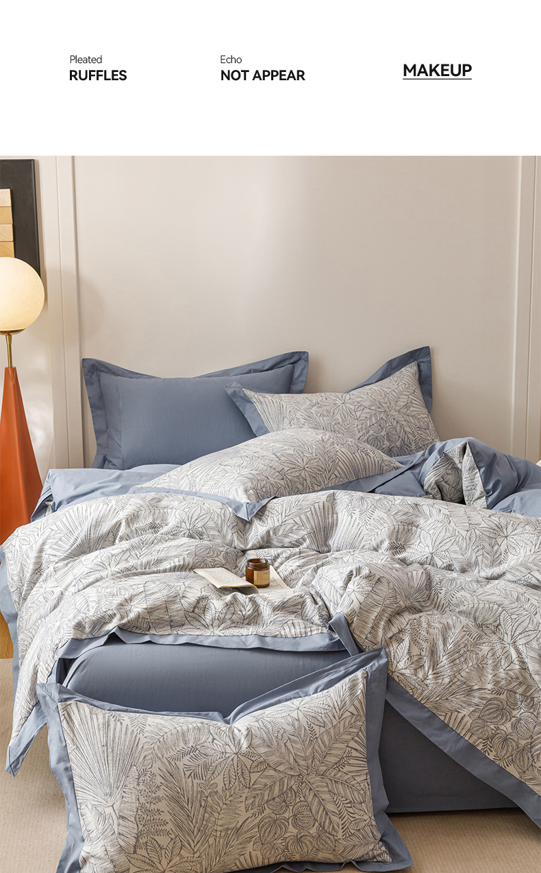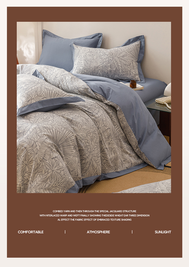 商品名称:简宜家居(朝初家纺) 2025新款全棉宽边三层纱提花四件套 叶韵-牛仔蓝