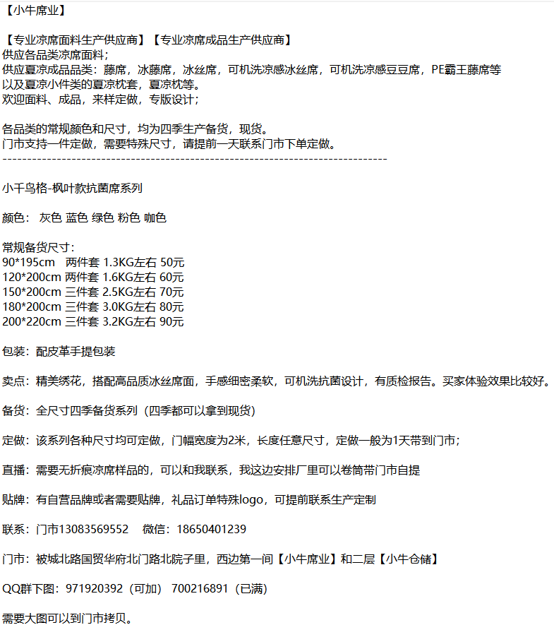 商品名称:(总)小牛席业 2025新款小千鸟格枫叶款冰丝席轻奢风抗菌席凉席藤席冰藤席冰丝席草席竹席乳胶席凉感豆豆席