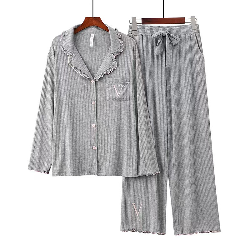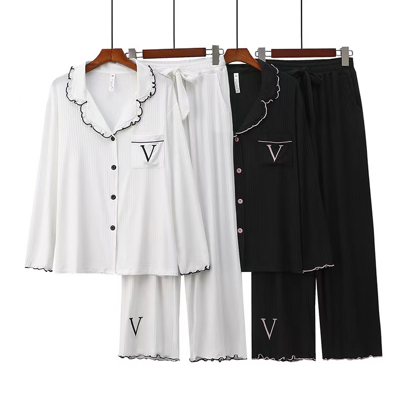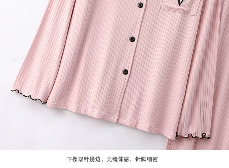 商品名称:(总)洛兰沙家居馆【只代发】【只代发】2025新款外贸欧美风8*5宽坑条莫代尔睡衣女春夏秋开衫翻领长袖长裤家居服