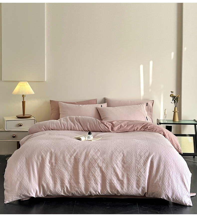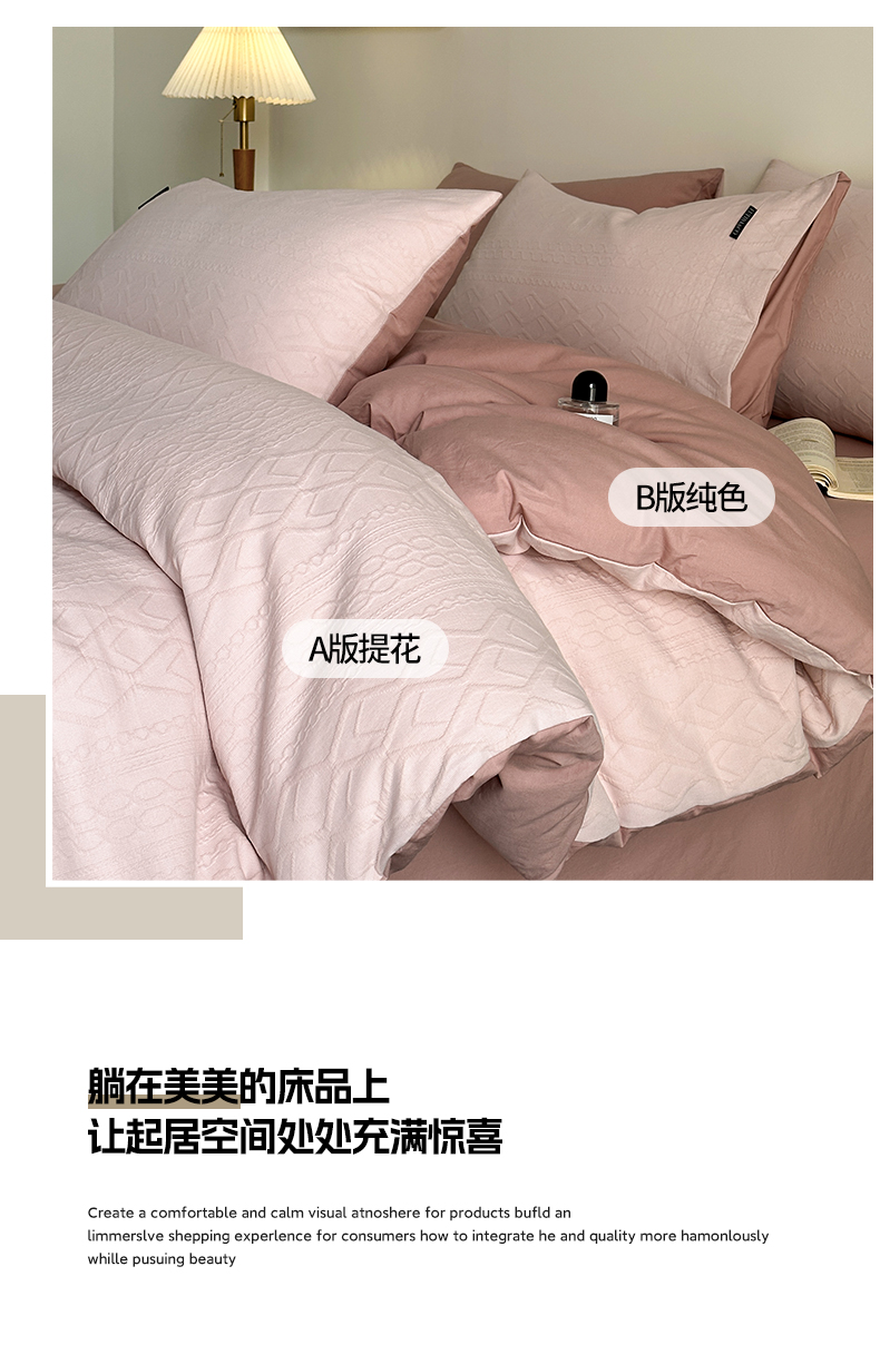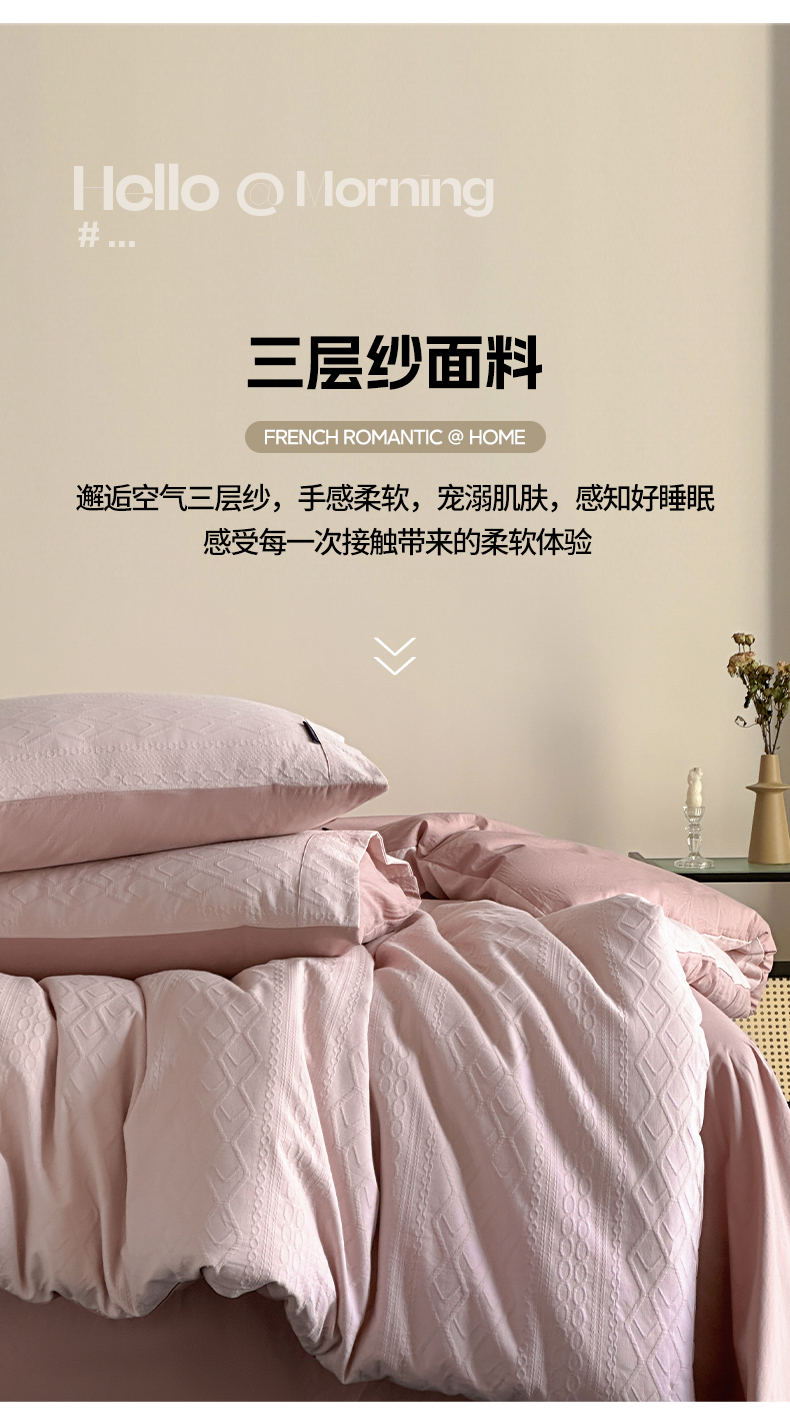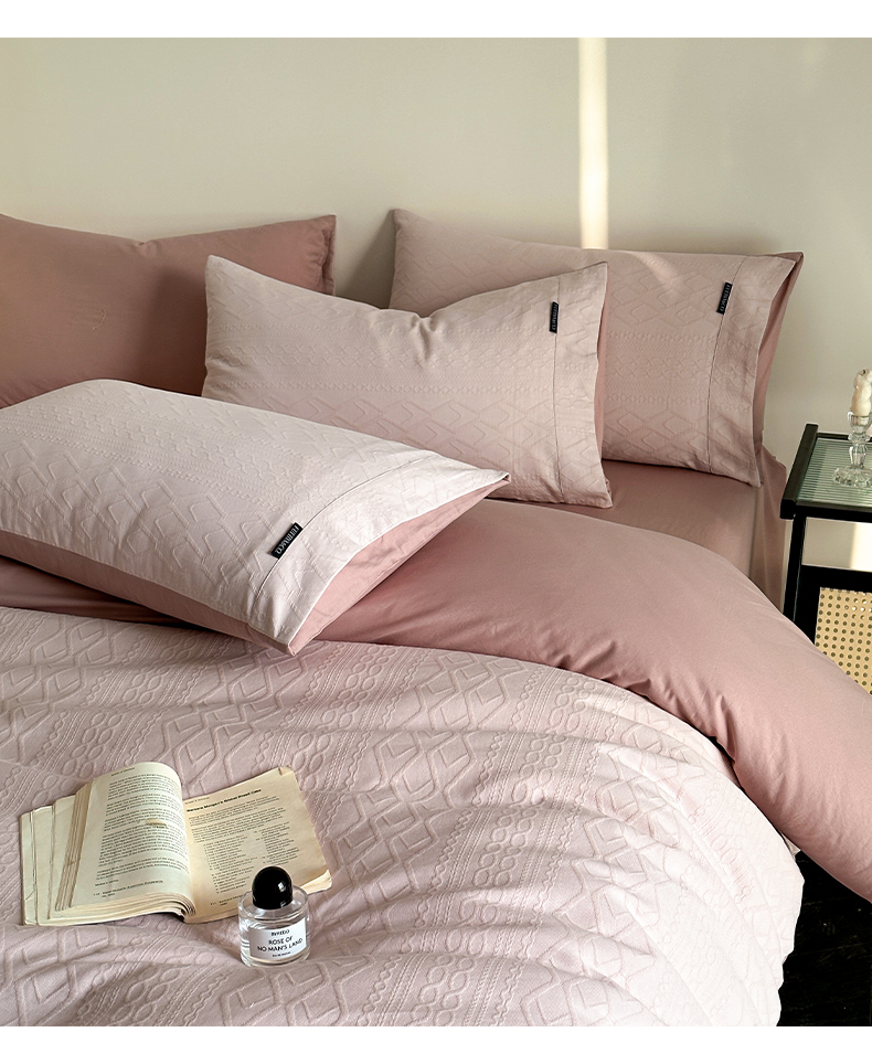 当前位置: 91家纺网 > 商品网购 > 床品套件 > 四件套 > 其它四件套 > 卡巴伦家纺 2025全棉A类空气层三层纱提花四件套 莉莎-藕粉