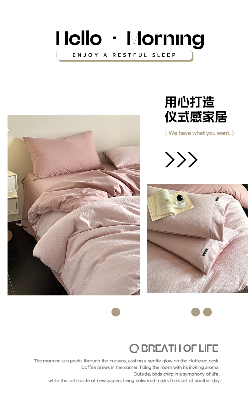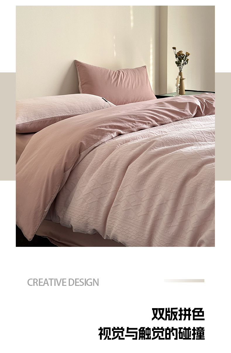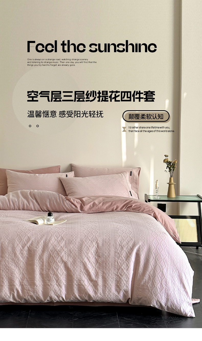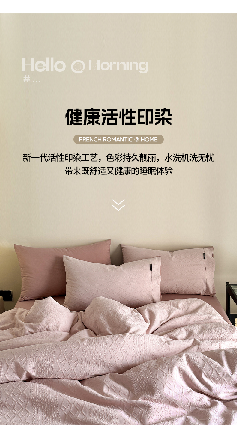 当前位置: 91家纺网 > 商品网购 > 床品套件 > 四件套 > 其它四件套 > 卡巴伦家纺 2025全棉A类空气层三层纱提花四件套 莉莎-藕粉