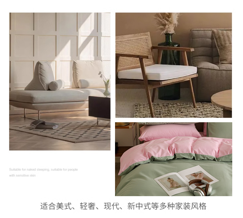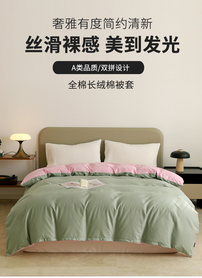 • 91家纺网 家纺一手货源 找家纺 2025年纯色双拼60支纯棉被套 抹茶绿+白桃粉