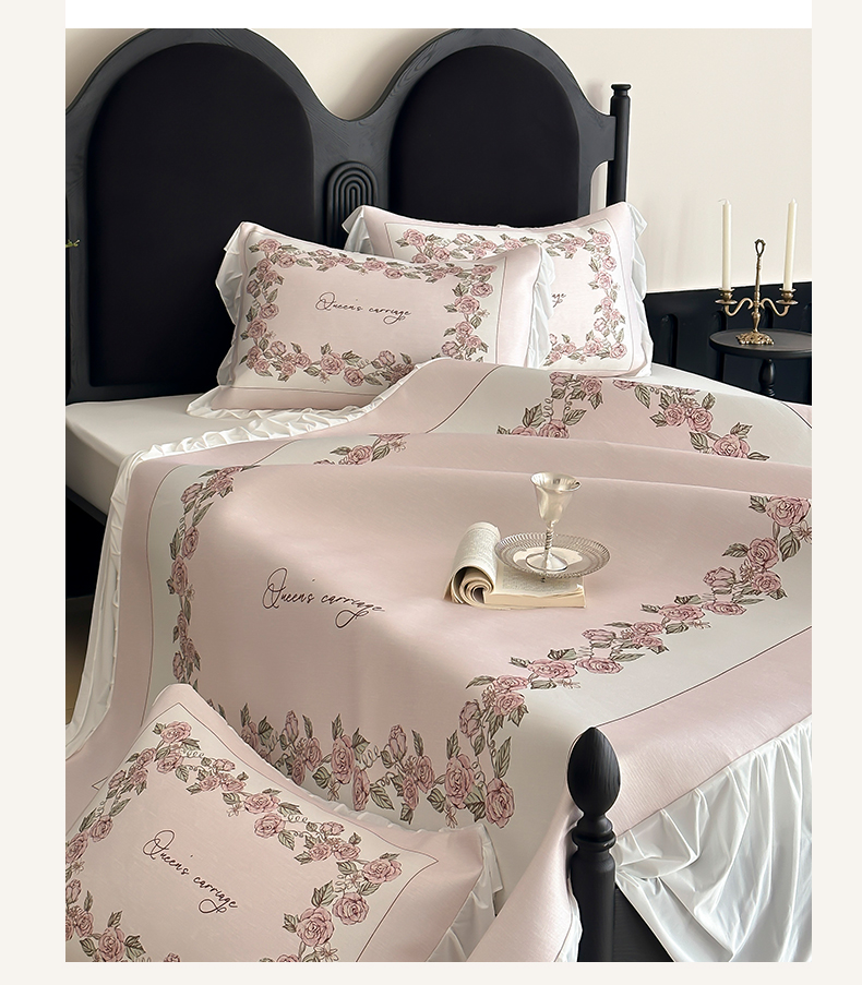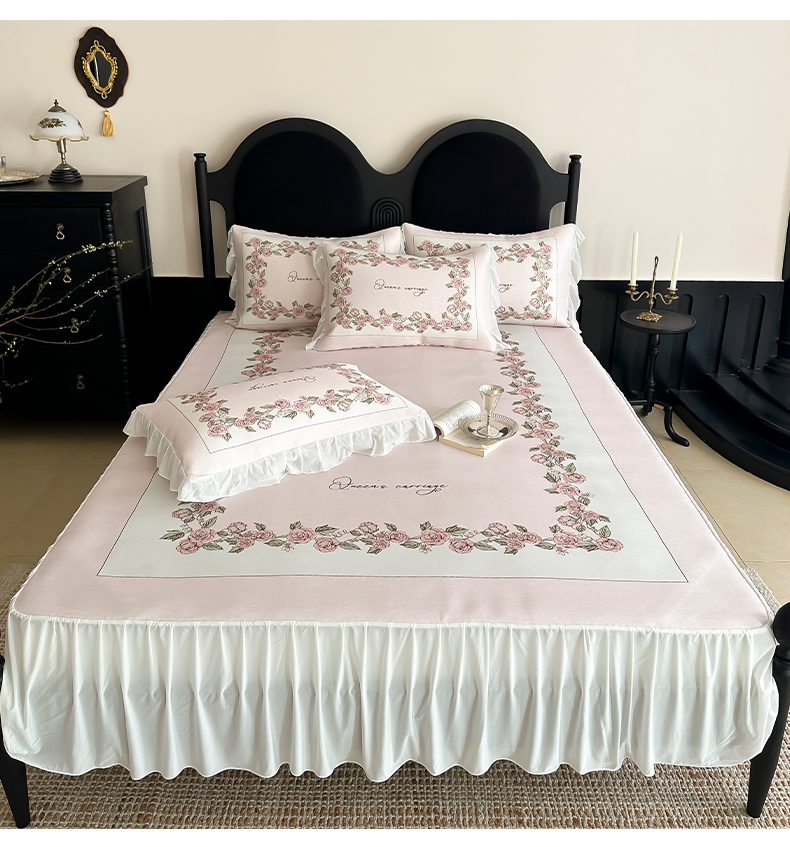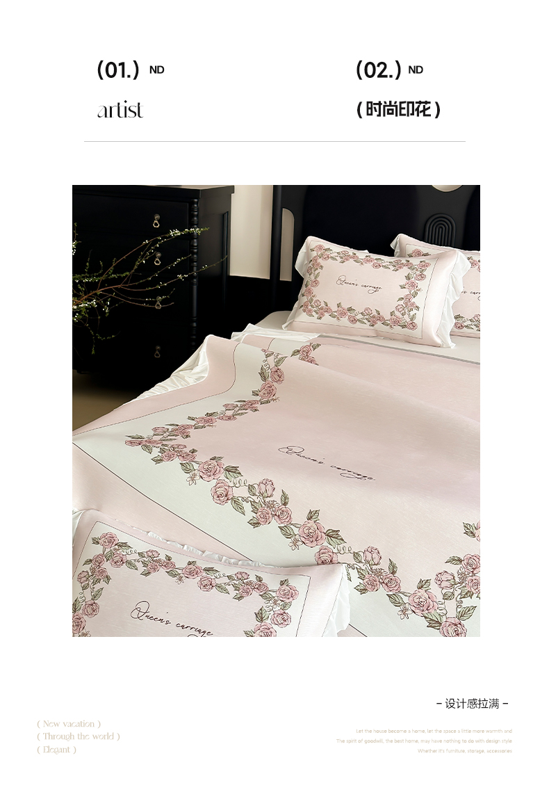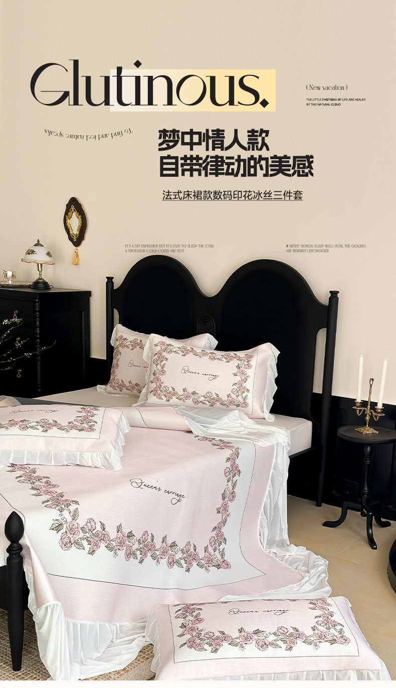 商品名称:三味舒屋 2025新款法式床裙款数码印花冰丝凉席三件套 床裙-花洛丽粉