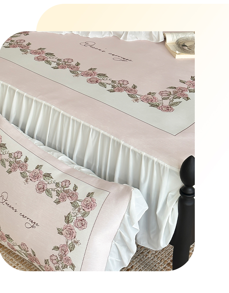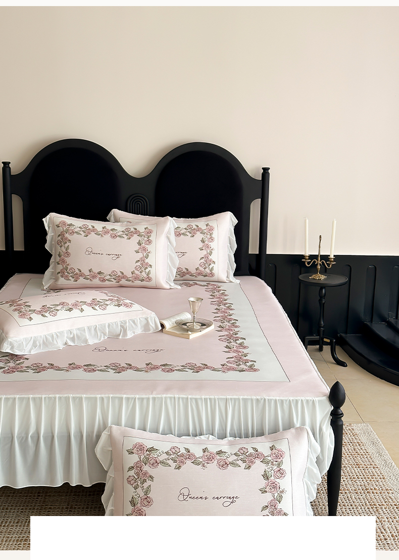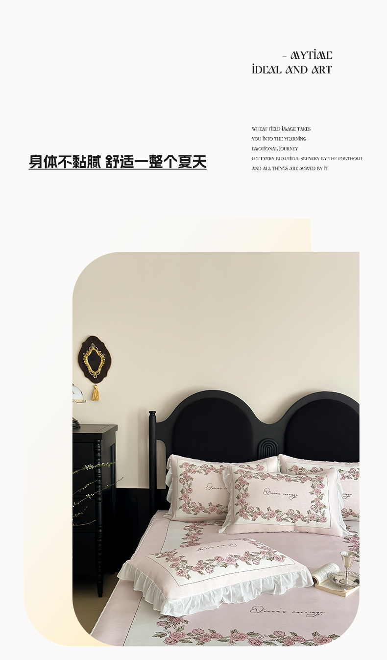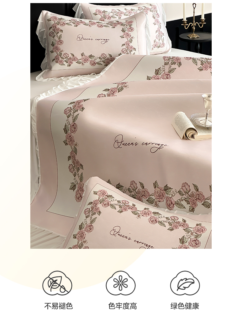 商品名称:三味舒屋 2025新款法式床裙款数码印花冰丝凉席三件套 床裙-花洛丽粉