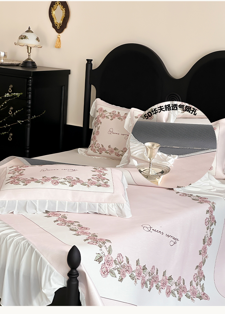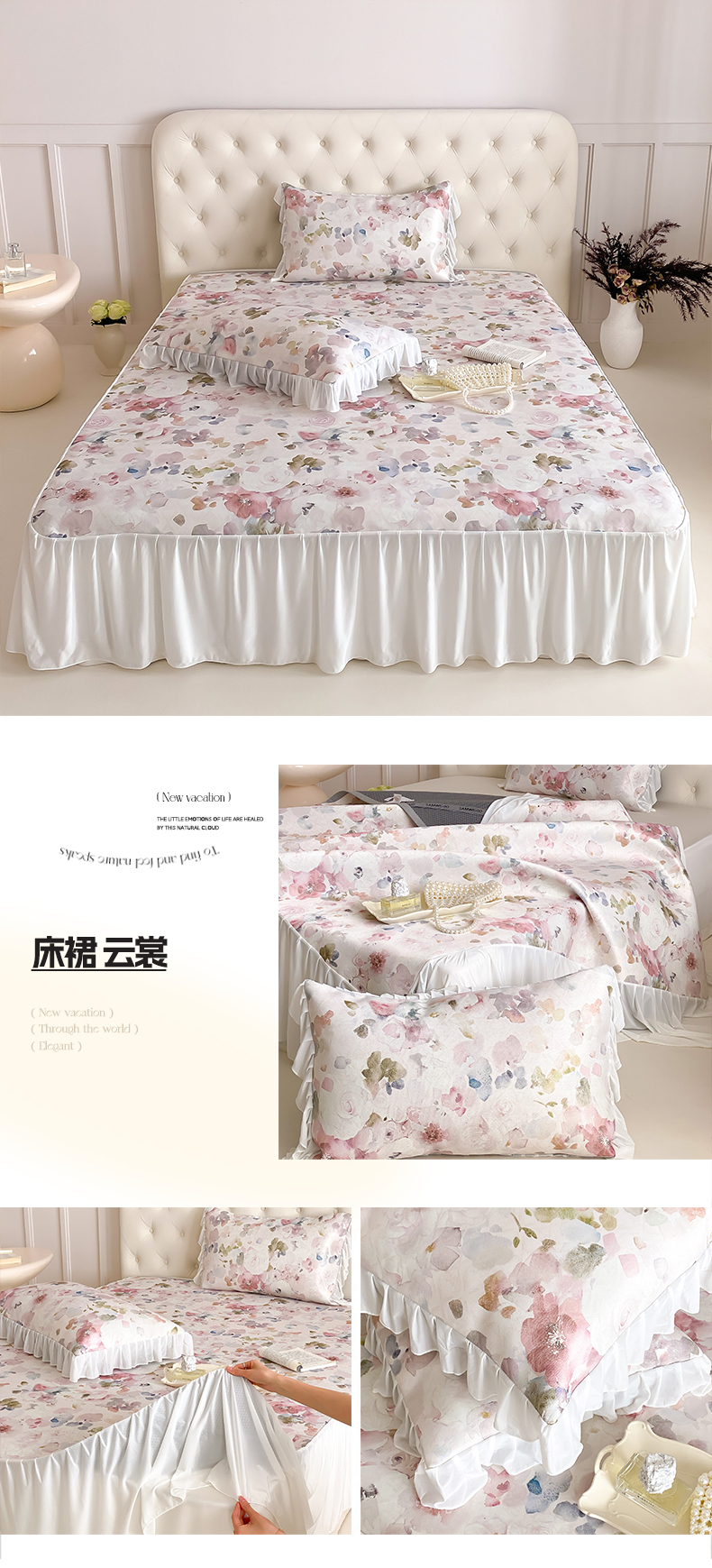 三味舒屋 2025新款法式床裙款数码印花冰丝凉席三件套 床裙-花洛丽粉