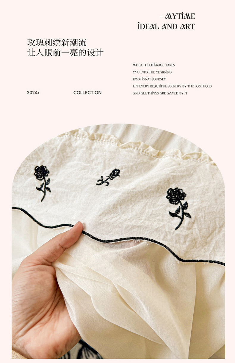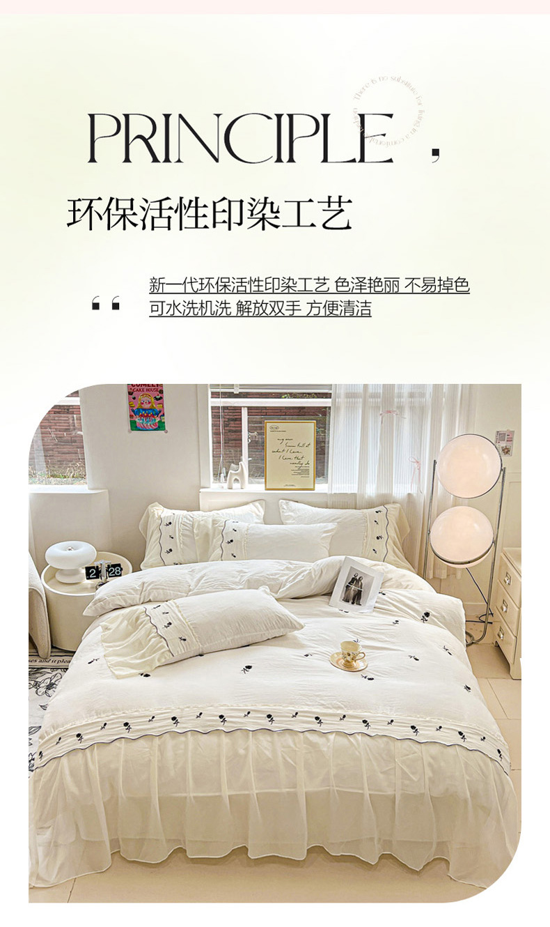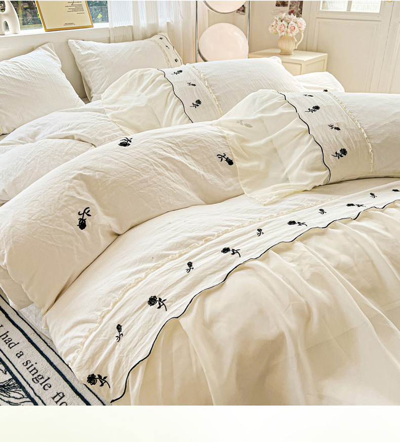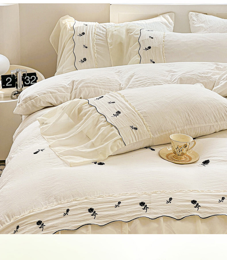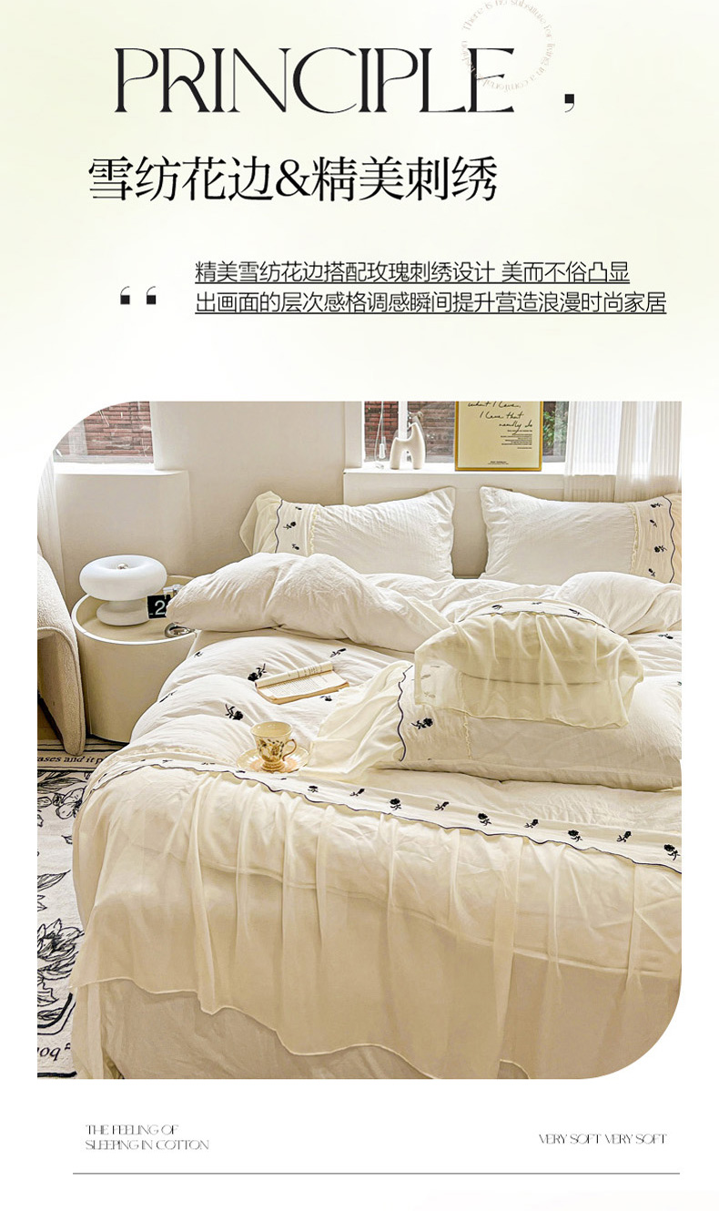 商品名称:艺玲家纺 2025新款水洗棉磨毛刺绣玫瑰蕾丝雪纺花边工艺款四件套 玫瑰仙子-白黑
