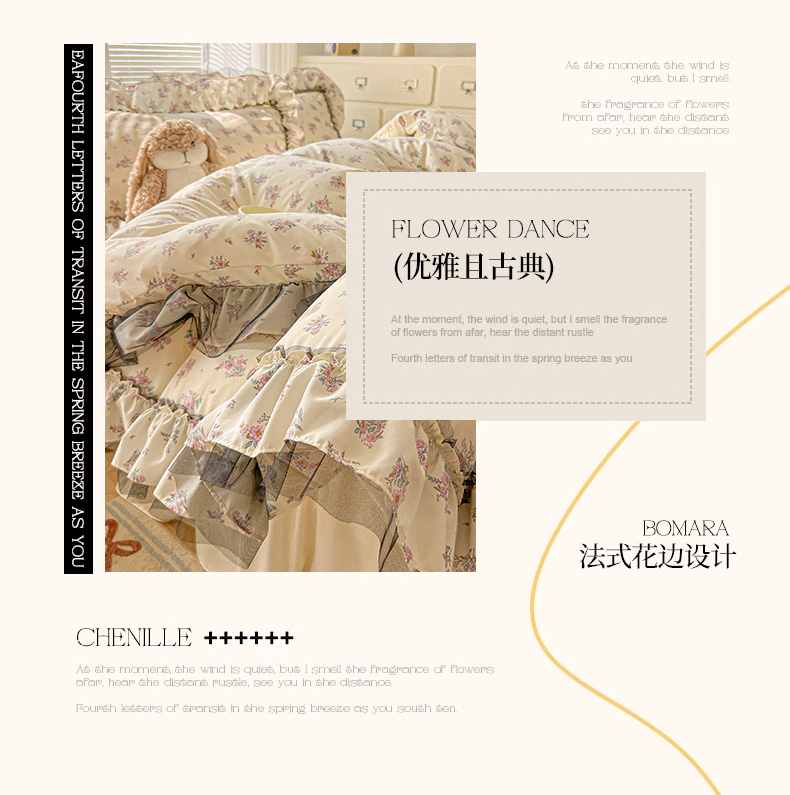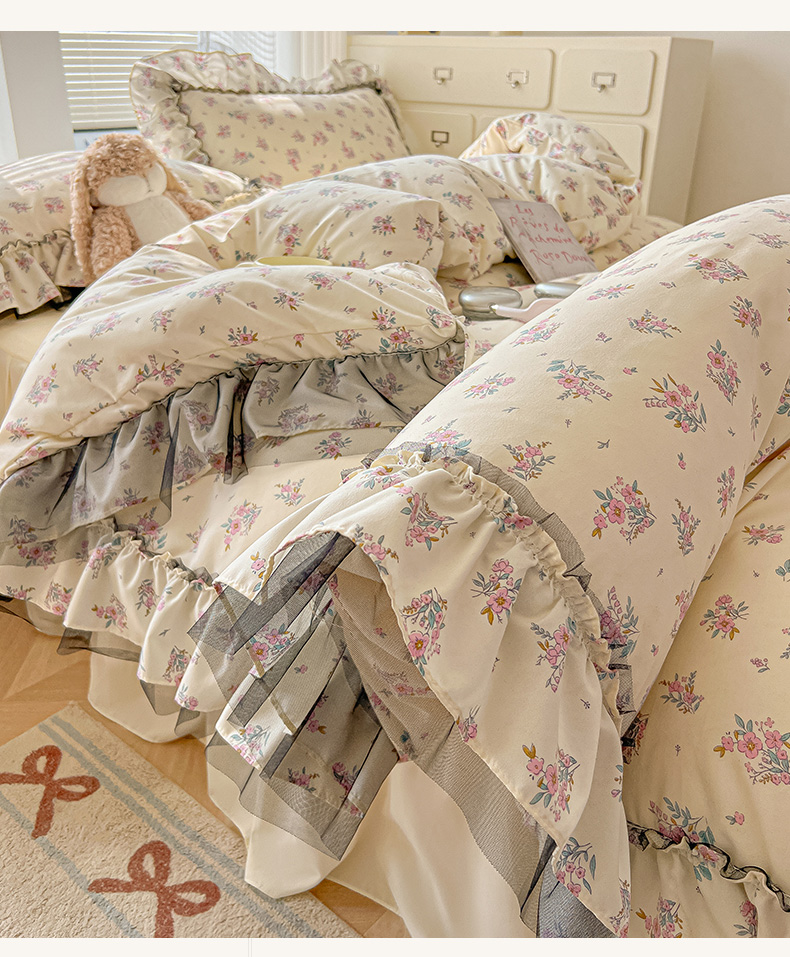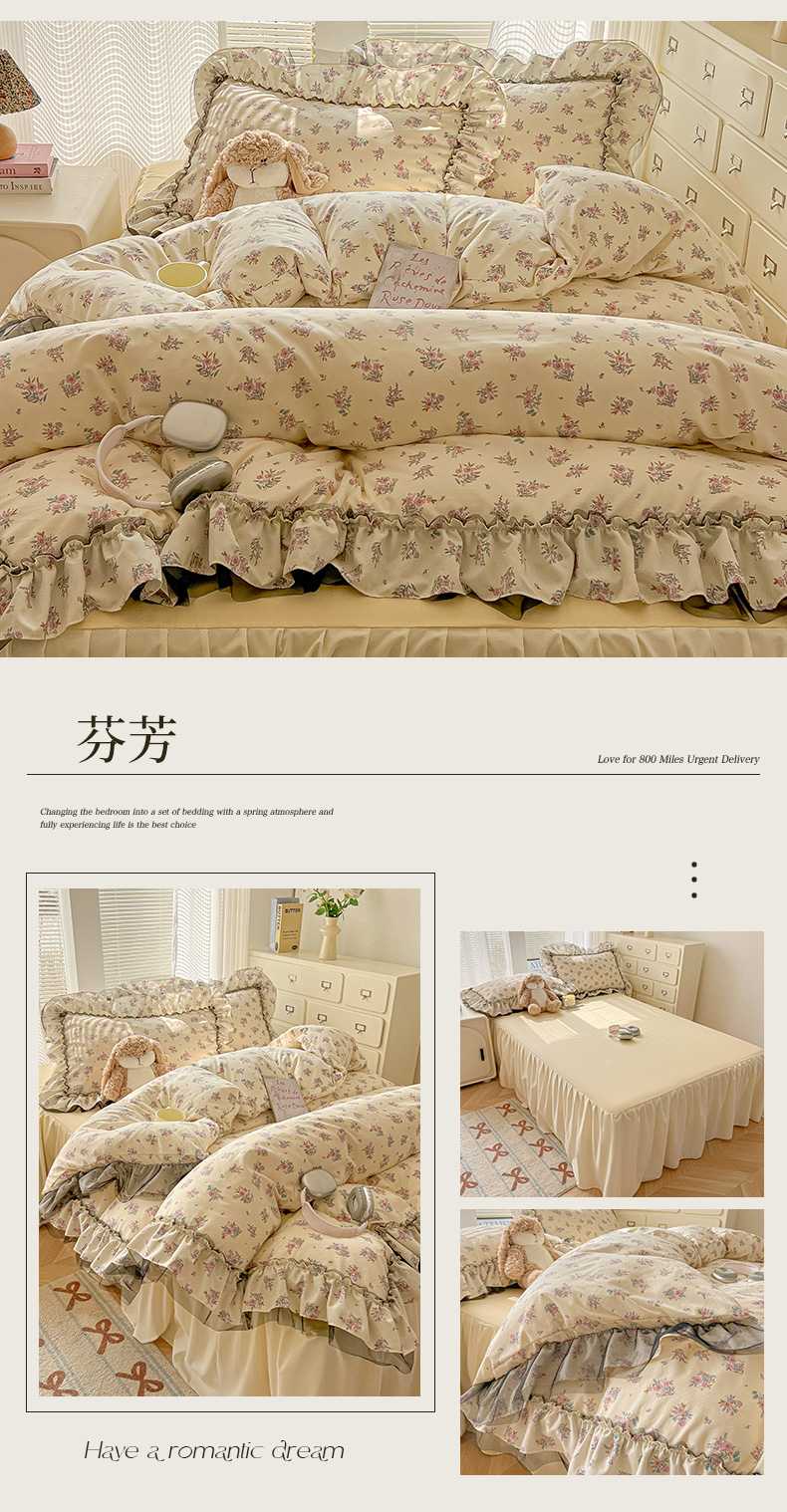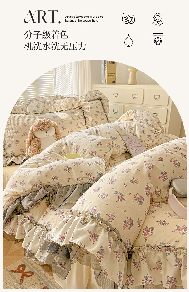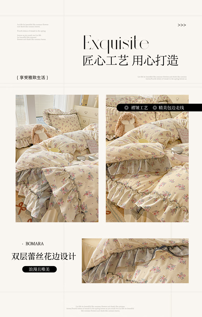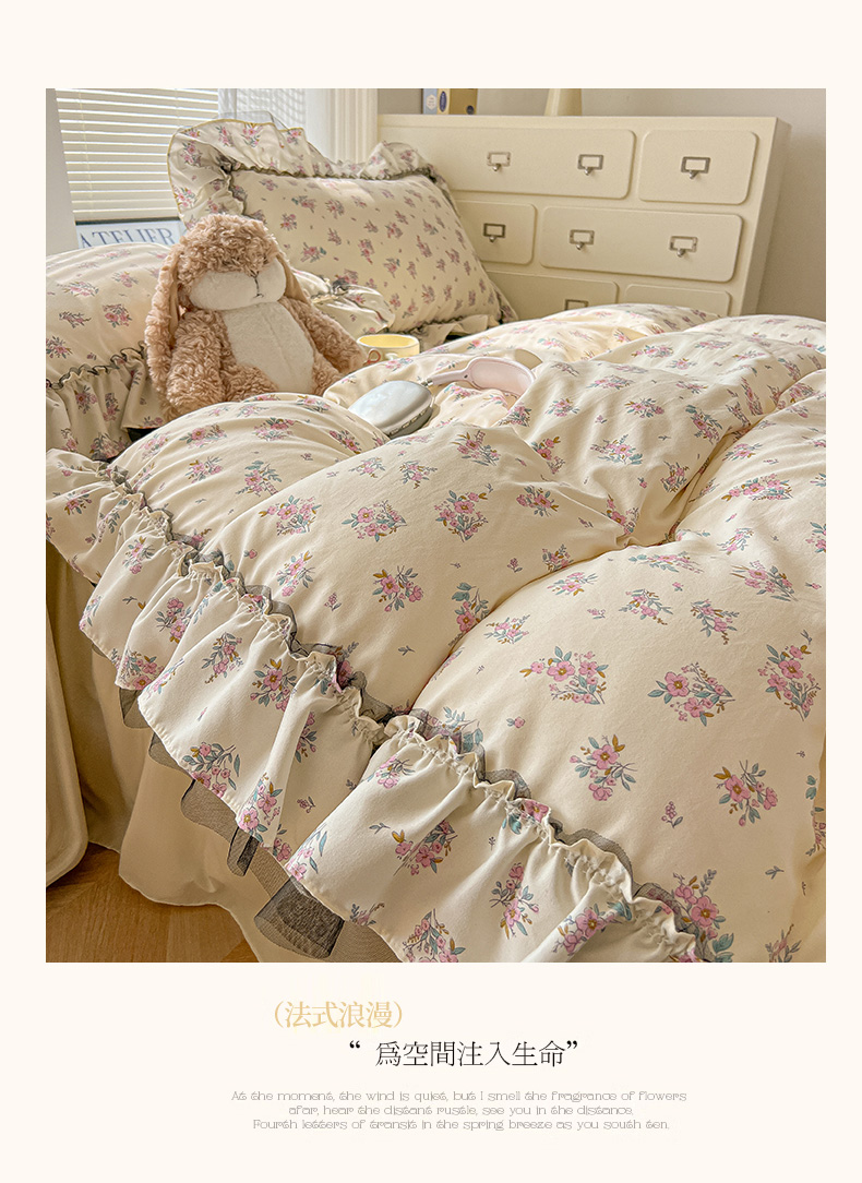 当前位置: 91家纺网 > 商品网购 > 床品套件 > 四件套 > 其它四件套 > 眠帛家居 2025新款A类法式皱皱纱小清新蕾丝花边四件套 芬芳